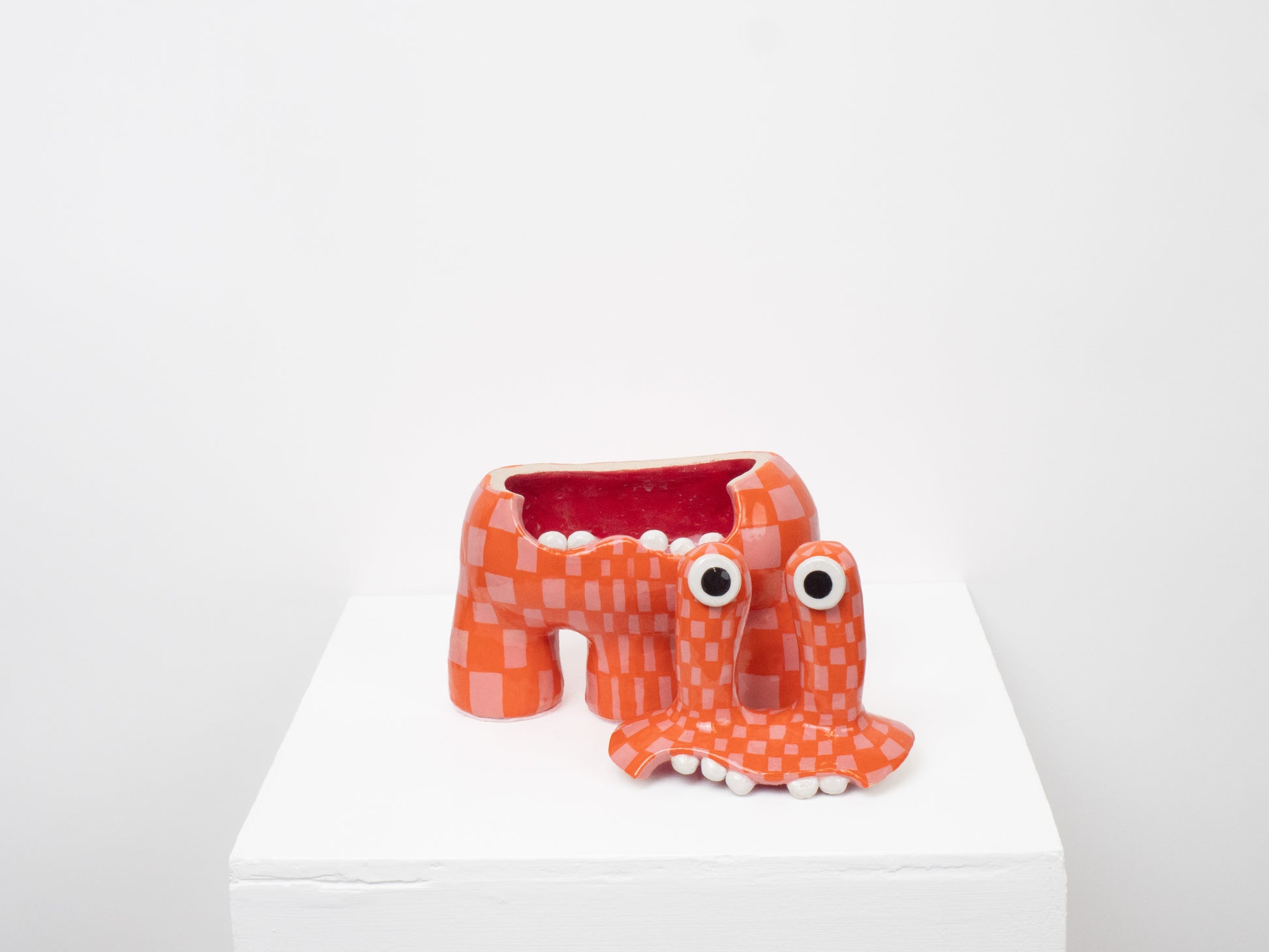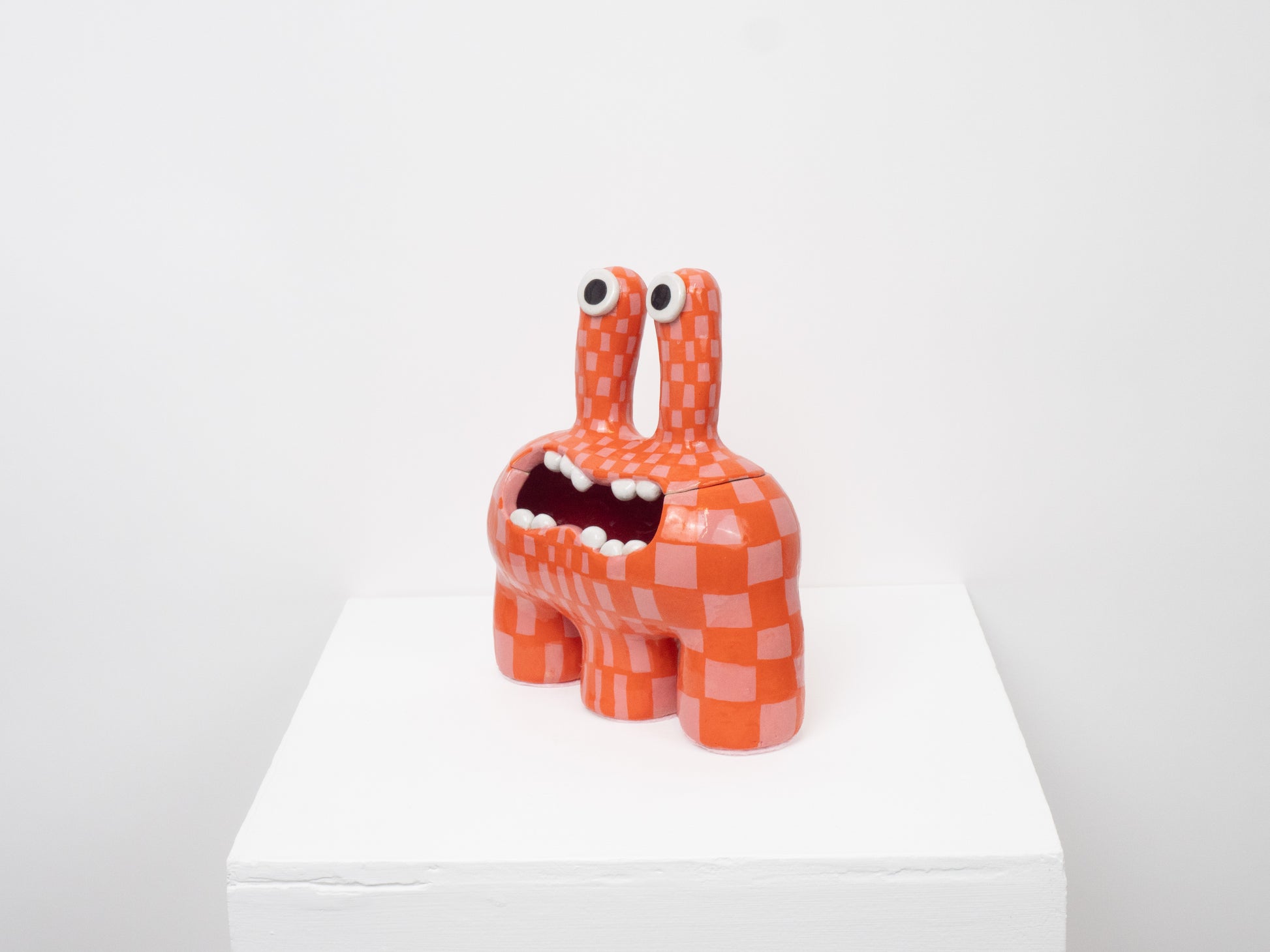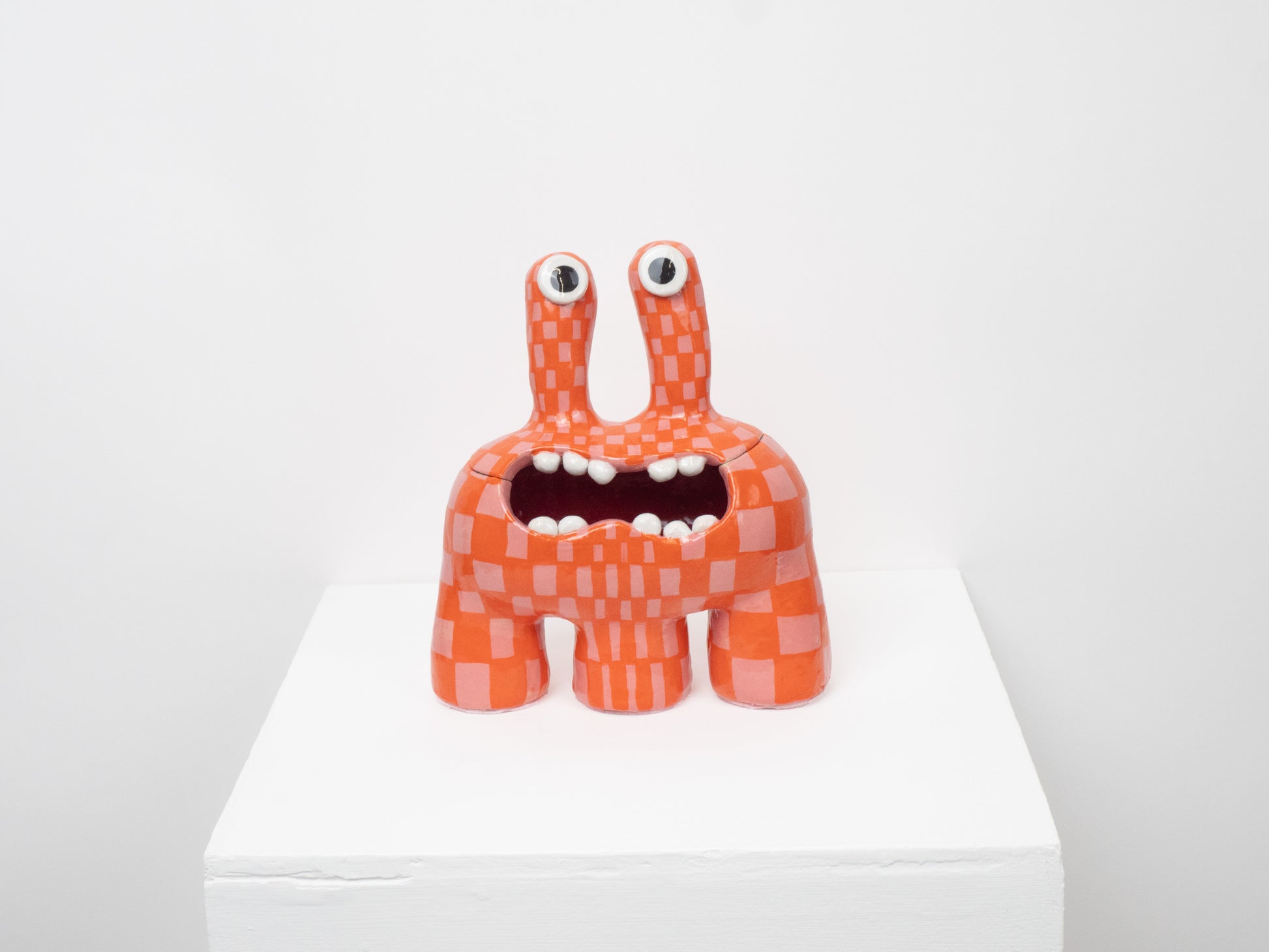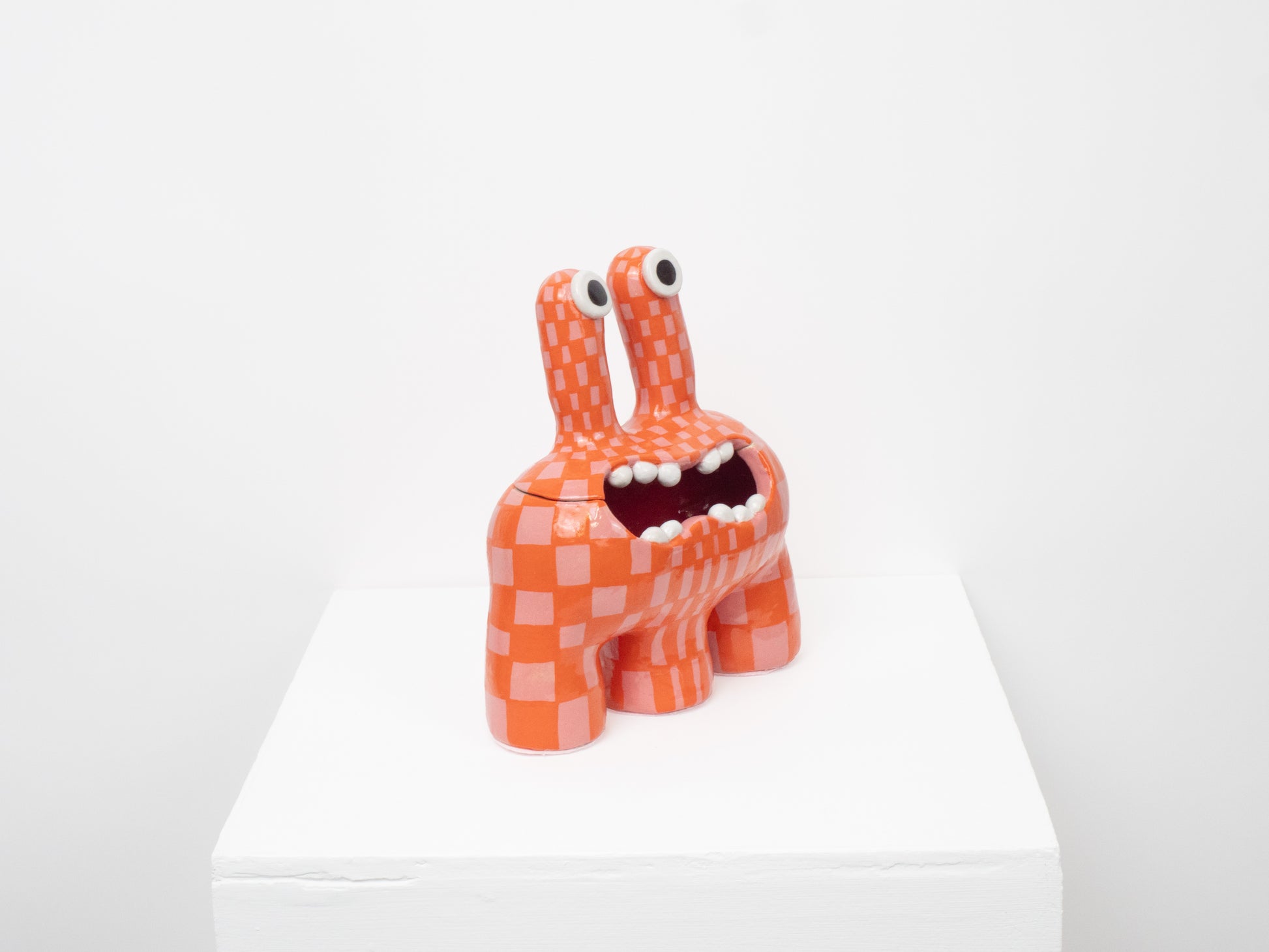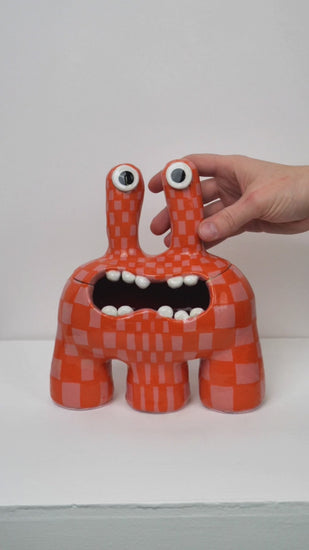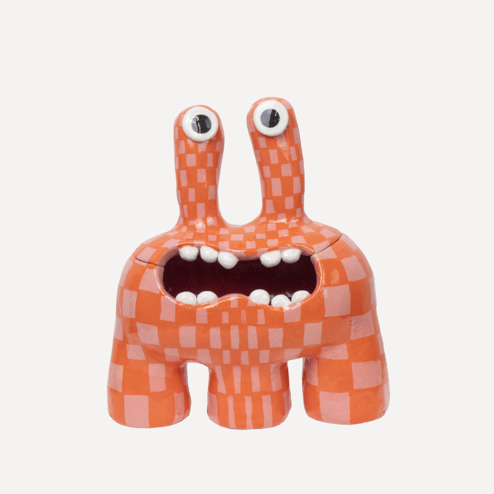 This monster is one of our most classic forms. The 'Acer' monster doubles as a ceramic pot - perfect for storing all of your trinkets, sweets or any other goodies! The orange and pink check glaze brings a joyous feeling to any space.