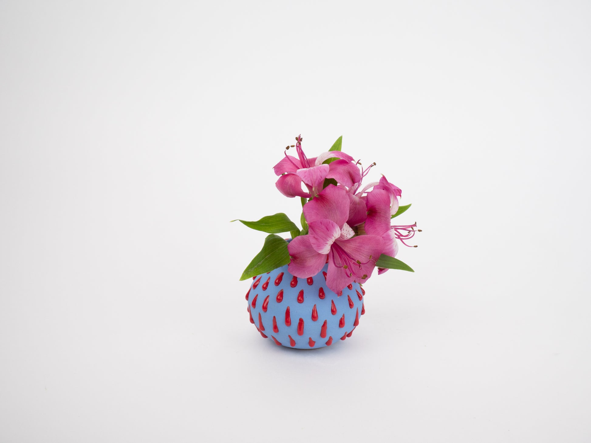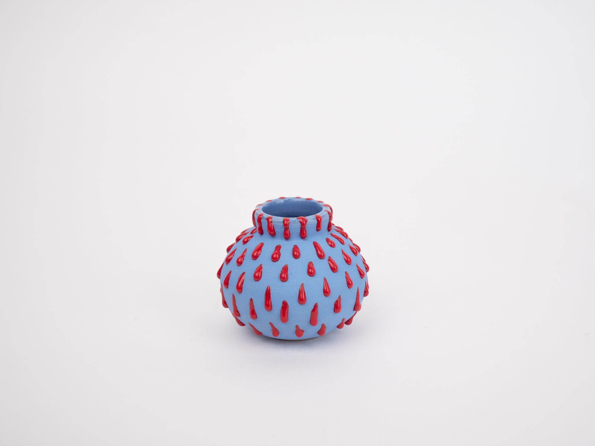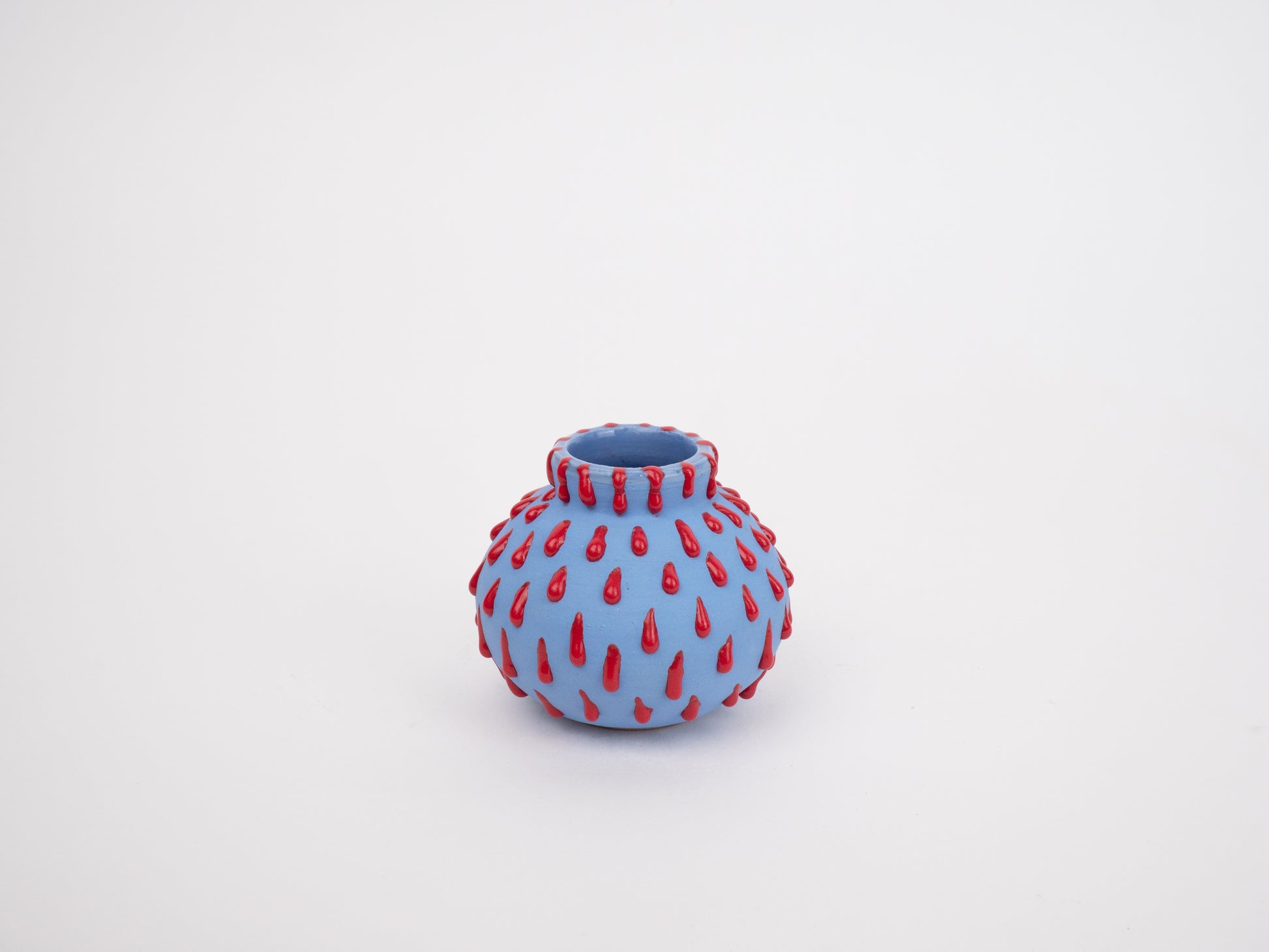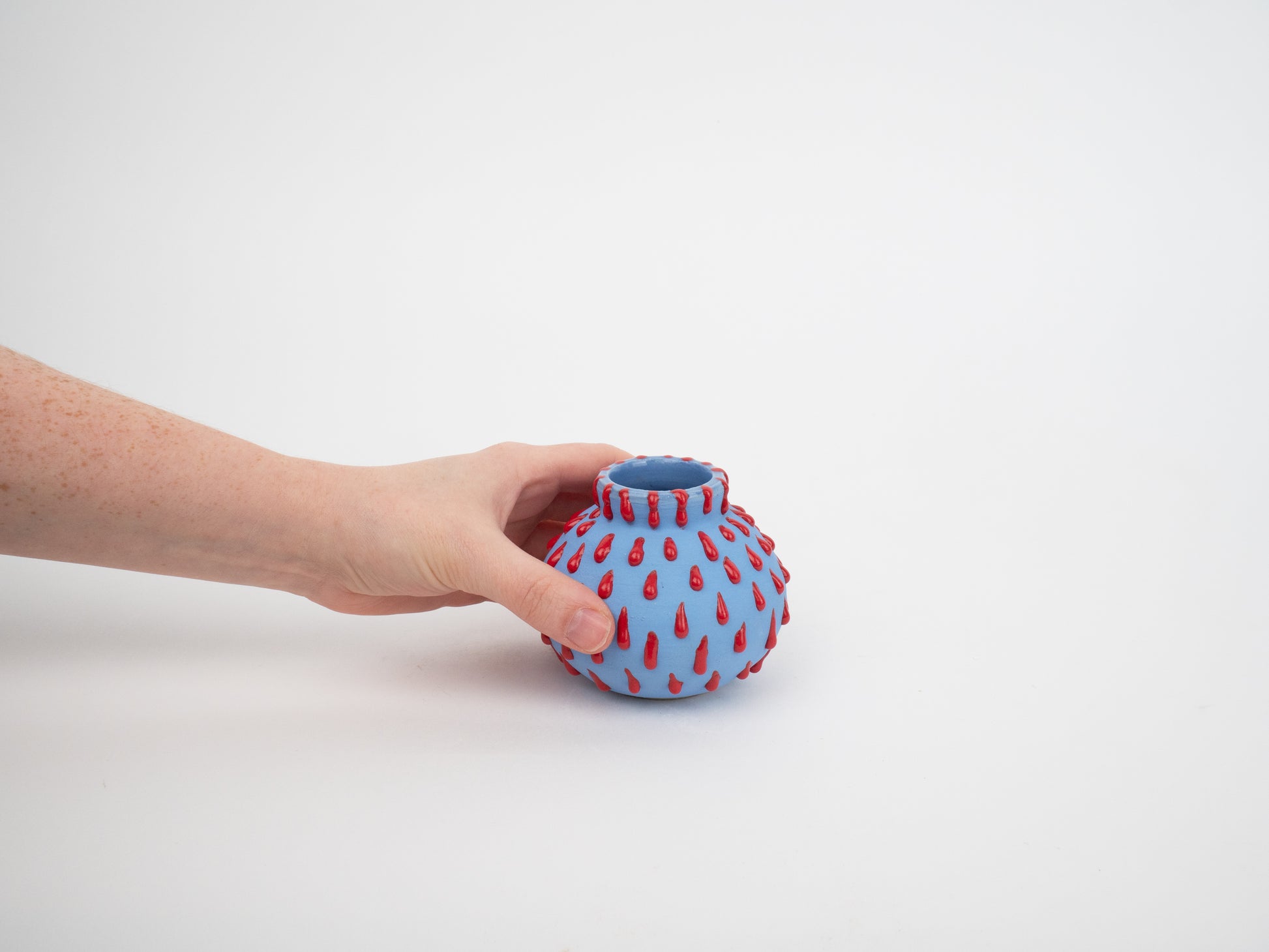 This hand-thrown vase has a blue matte base and is decorated with a thick glossy red glaze to create a gloopy appearance and texture. This vase will add a fun burst of colour to any space.