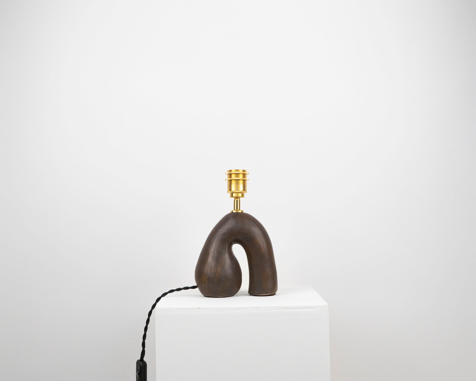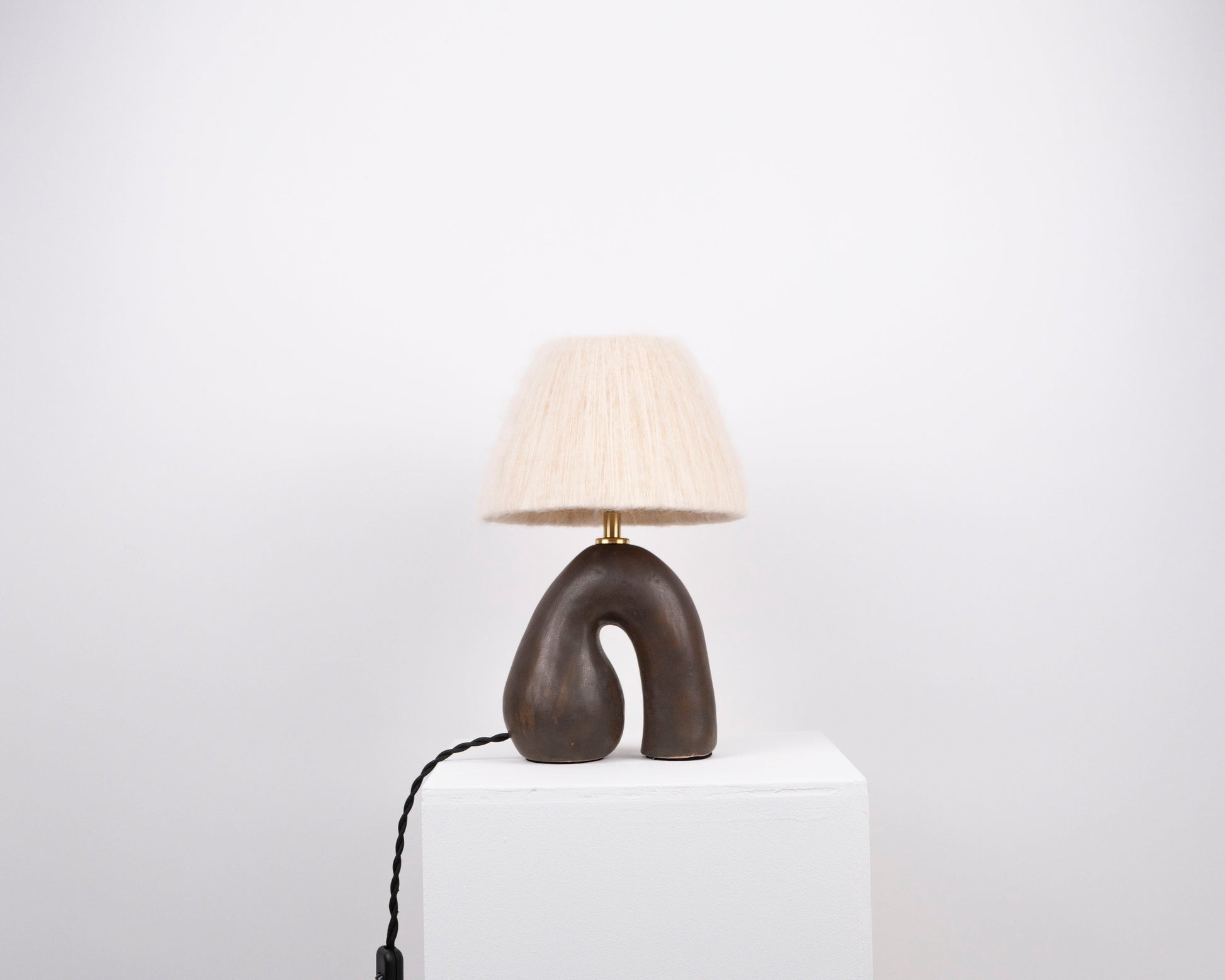Handmade ceramic Dark Brown lamp base with a satin finish paired with an Off-White wool shade