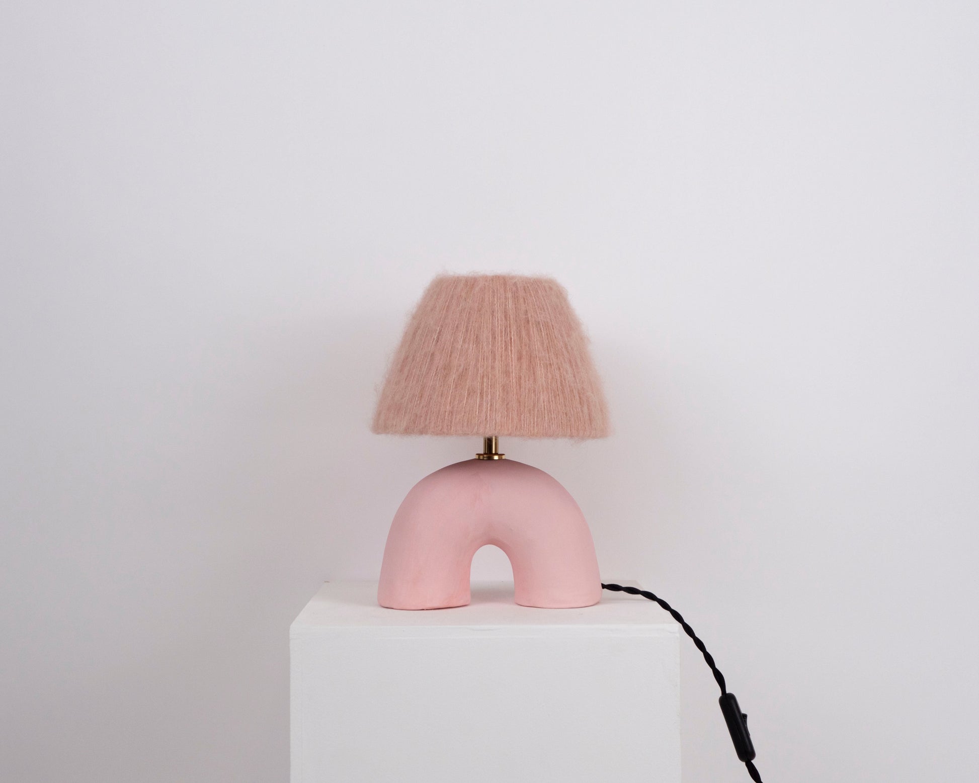 Handmade ceramic Pink lamp base with a matte finish paired with a matching Sand Pink wool lampshade