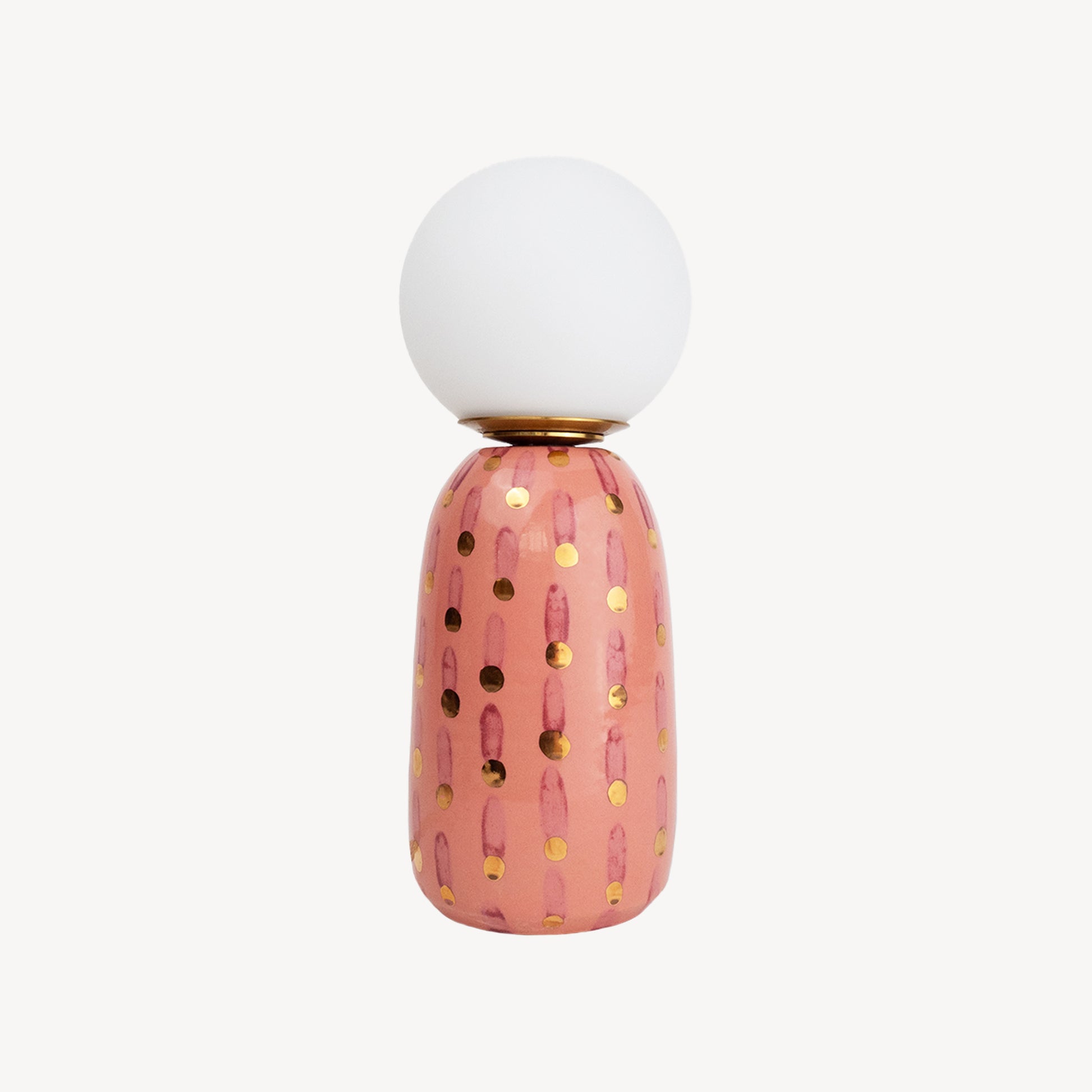 This handcrafted ceramic lamp pairs a pink base with a frosted globe bulb for a cozy glow. Its playful design, glossy finish and luxurious 24k gold detailing make it the perfect little statement piece for any space.