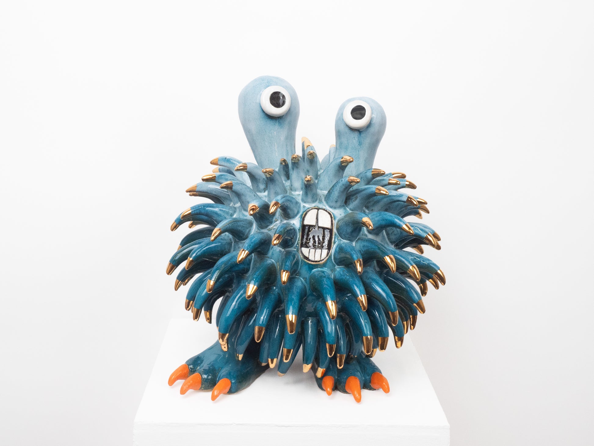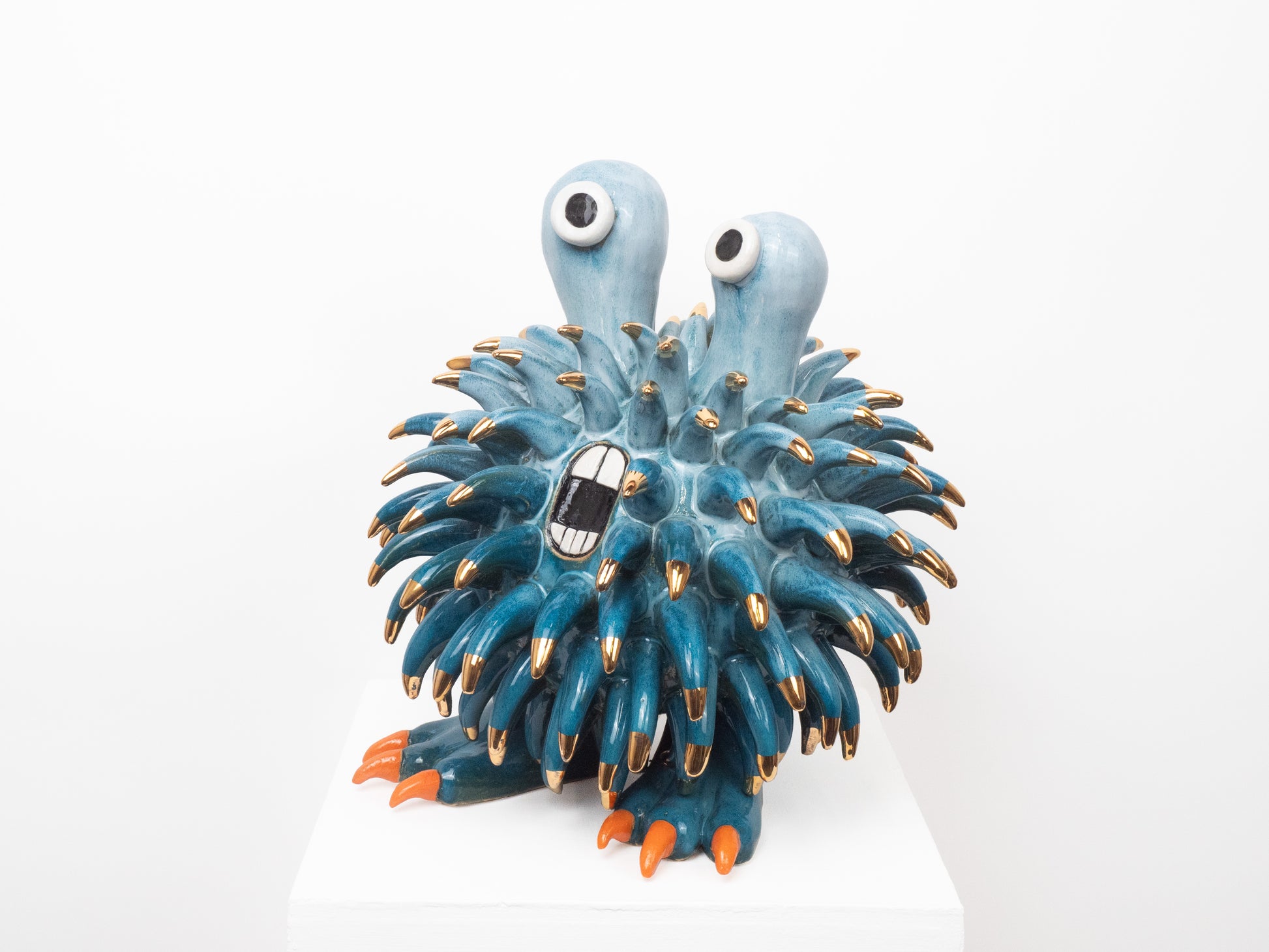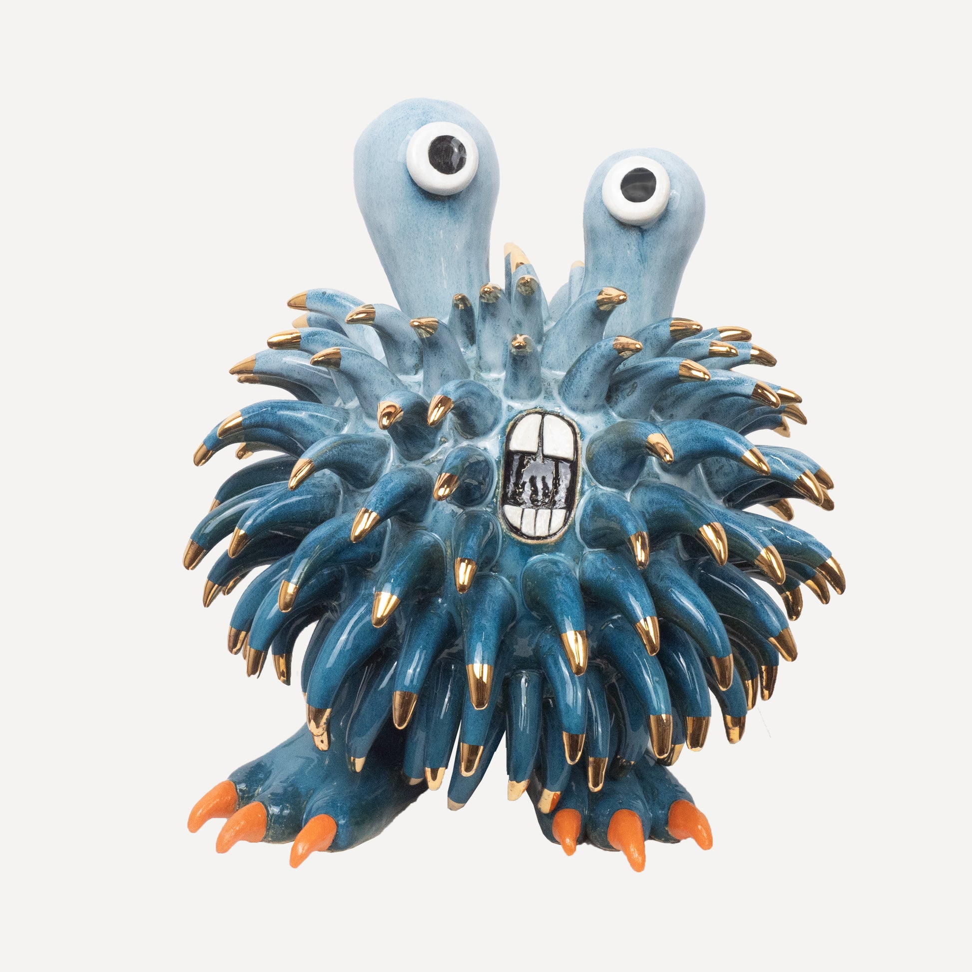 The Devin Monster is covered in a spiky texture a ... glaze. The tips of the spikes are ... and gold. This monster is bursting with personality and charm.