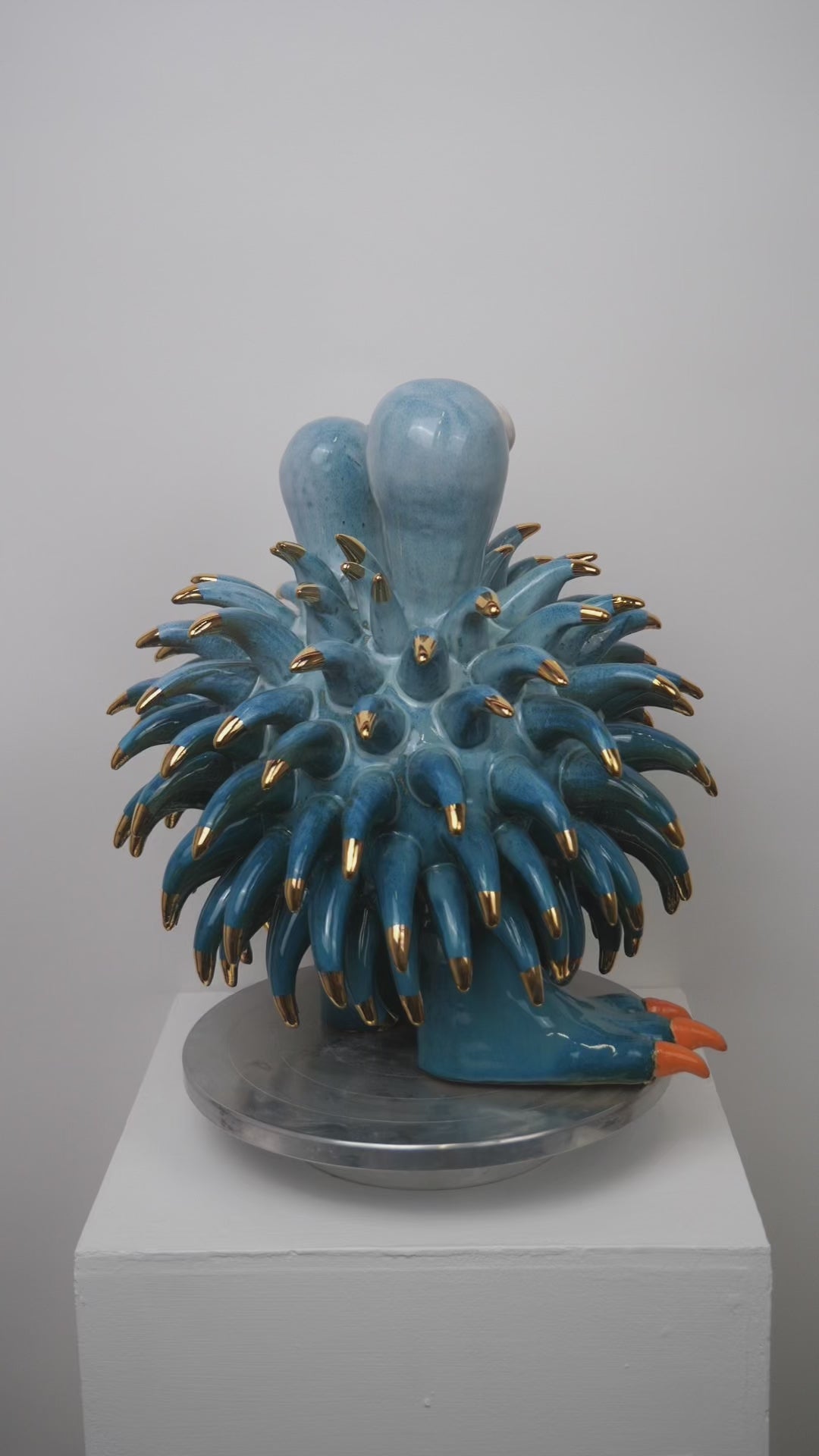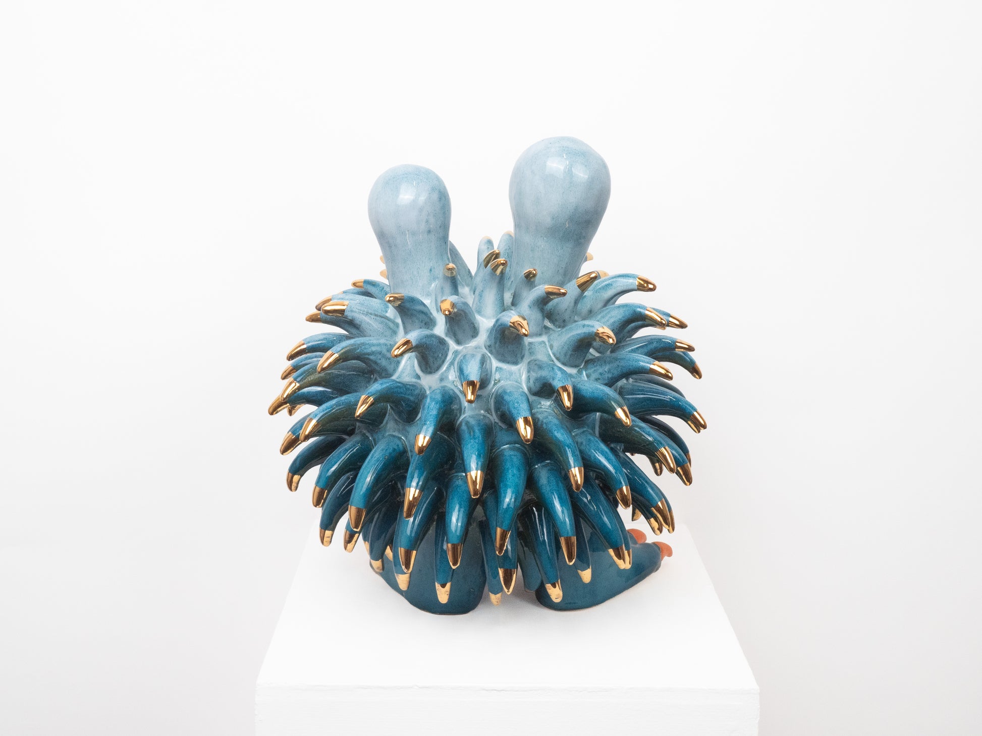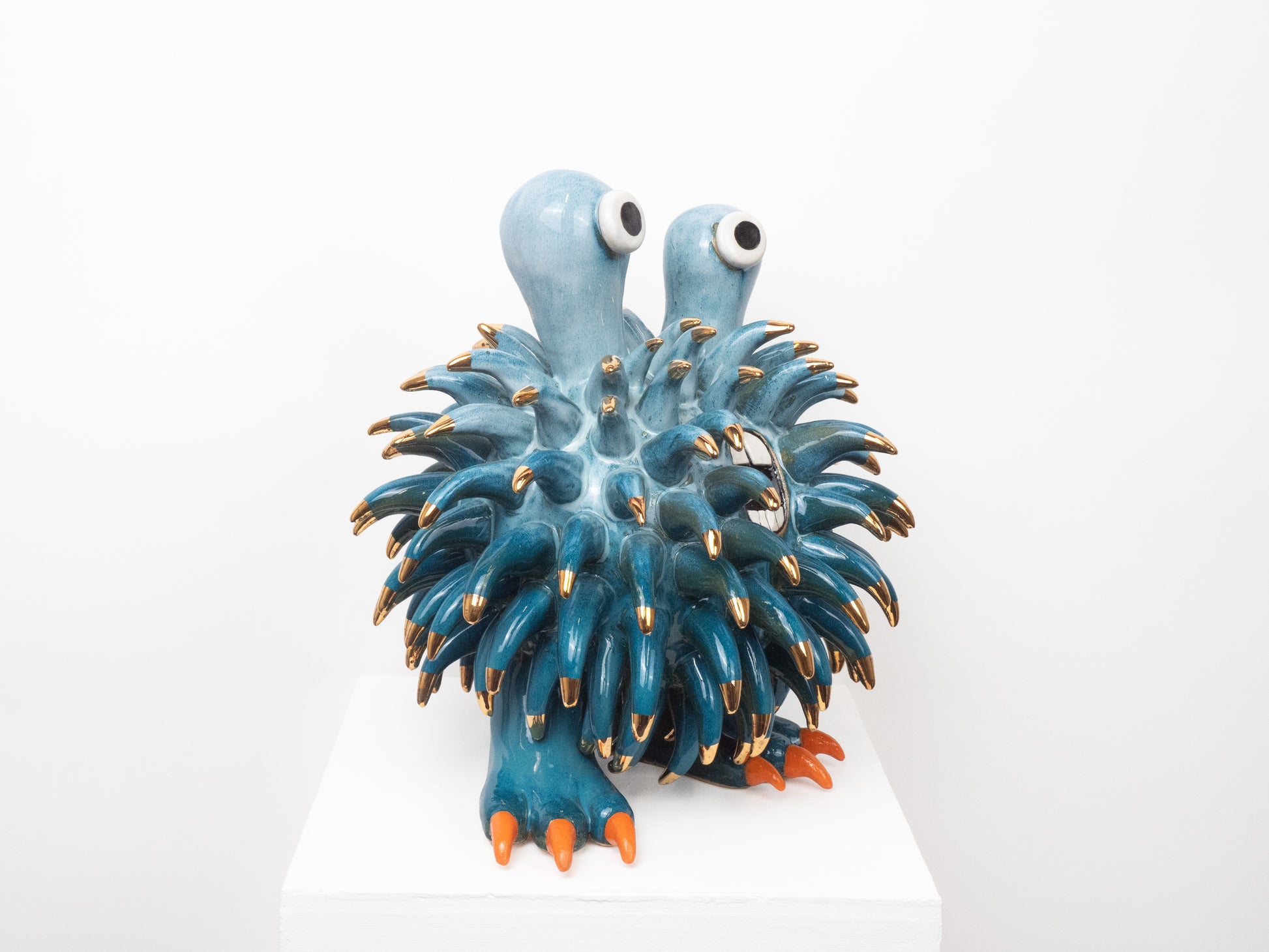 The Devin Monster is covered in a spiky texture a ... glaze. The tips of the spikes are ... and gold. This monster is bursting with personality and charm.