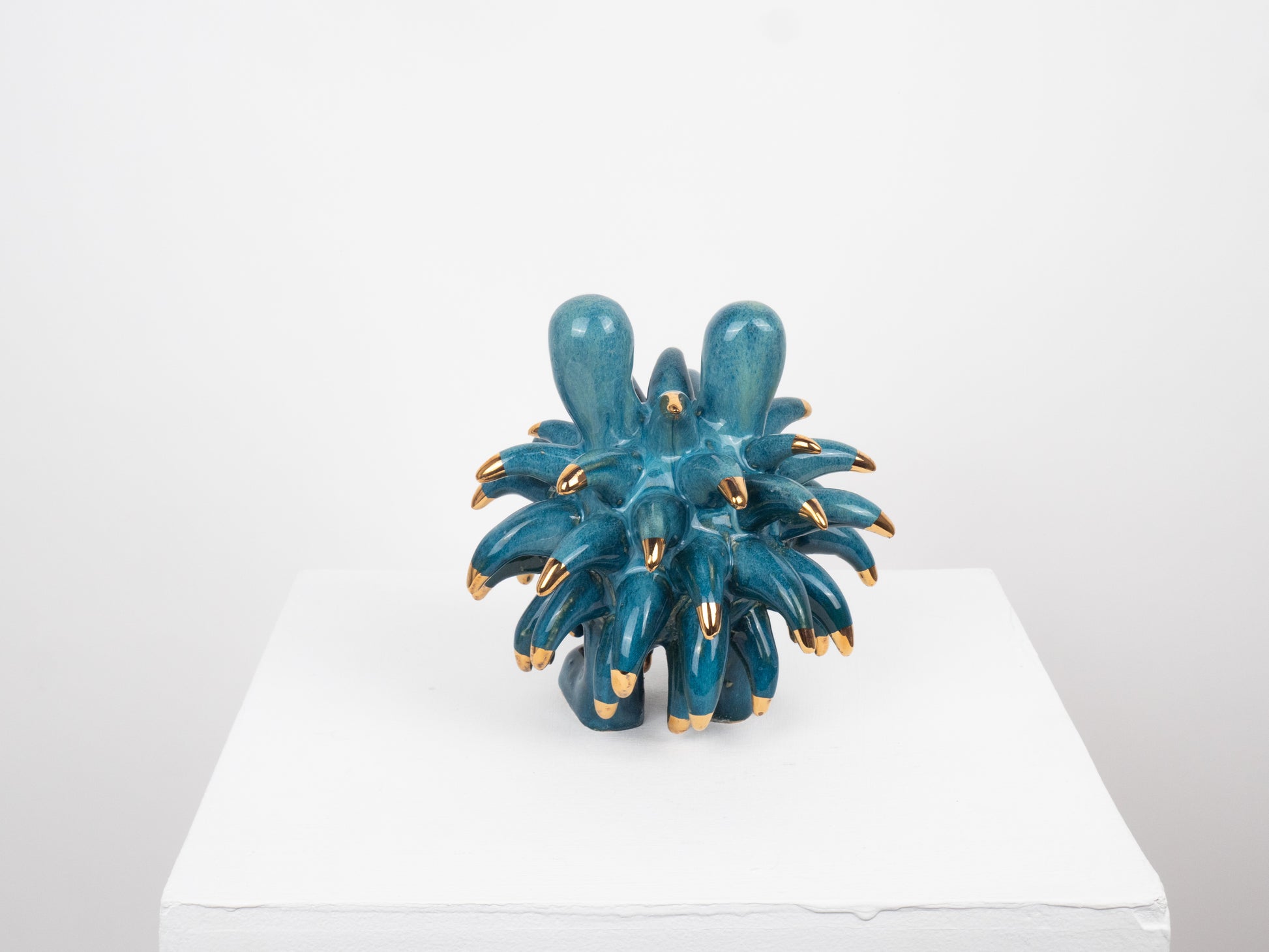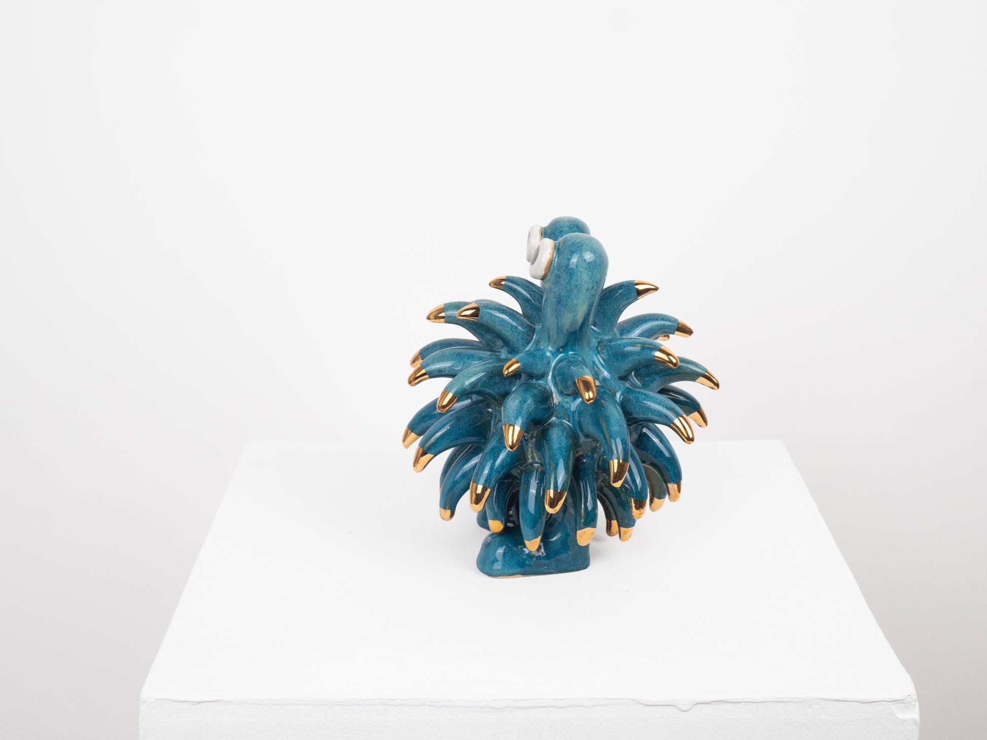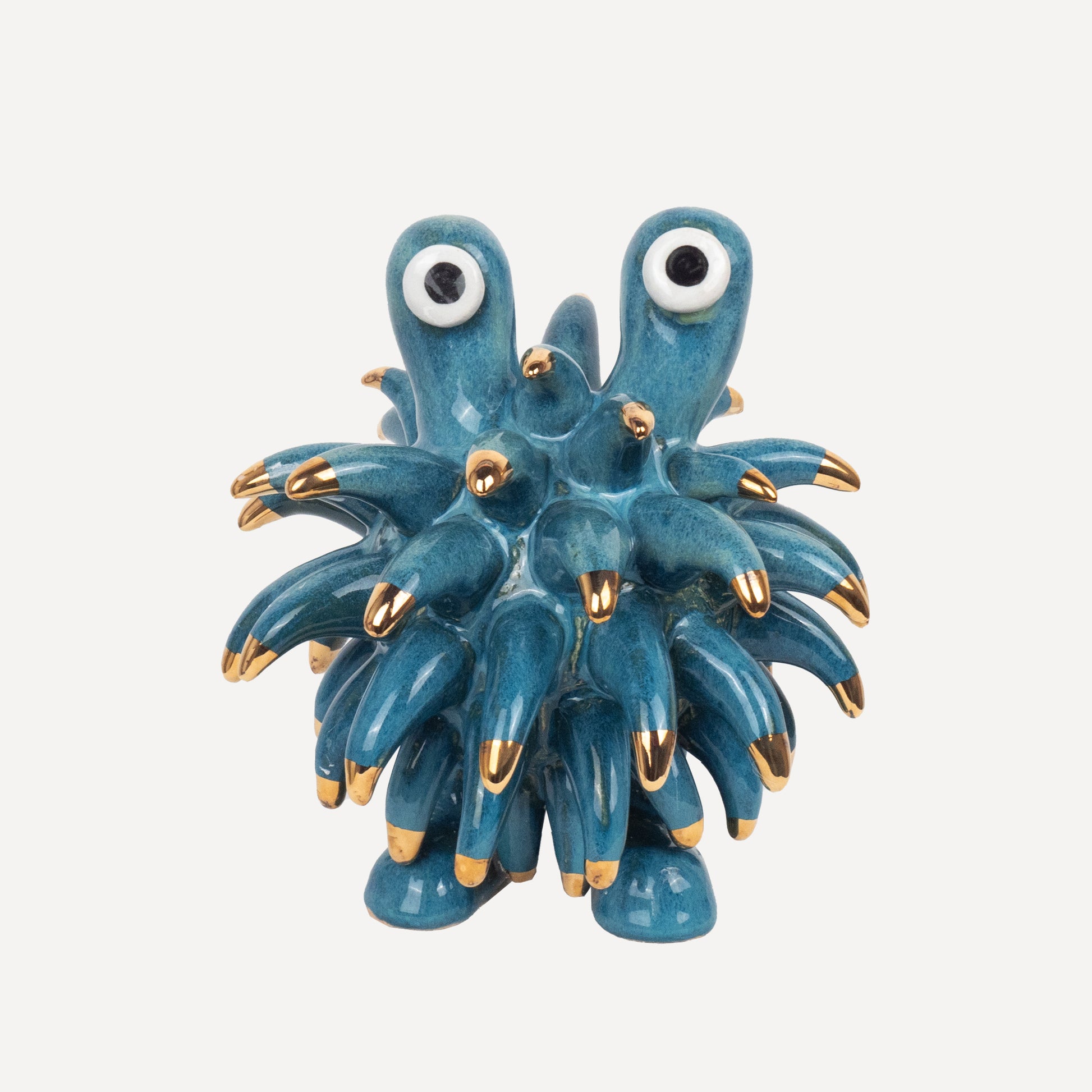 The Dinky Devin is a hand-built ceramic sculpture covered with a spiky texture. The 'Lagoon' glaze has been specially created at Hannah Simpson Studio and gives the monster a mottled blue colouring. Each of the tips has been decorated with a 24 karat gold lustre, giving Dinky Devin a little bit of magic.