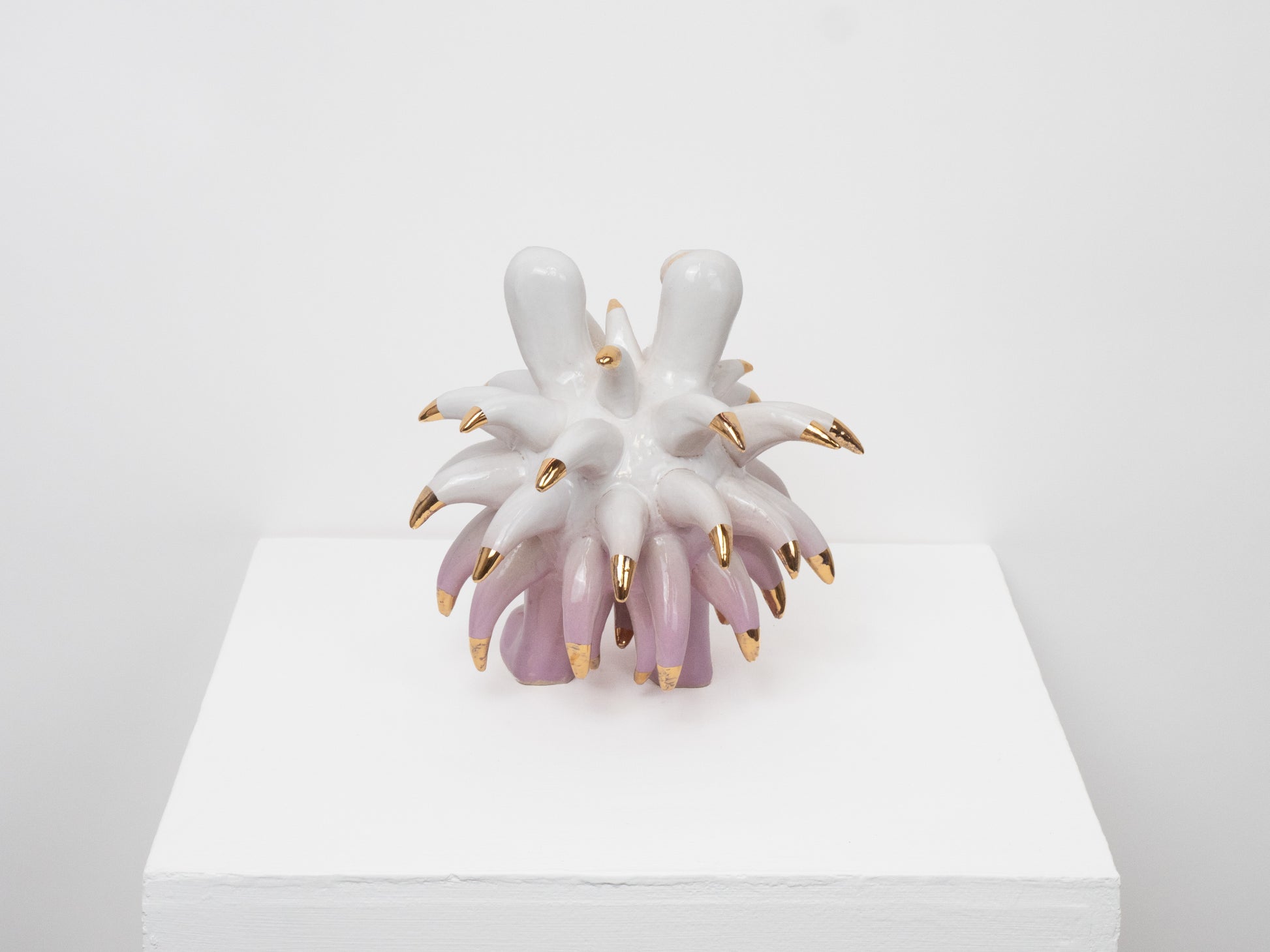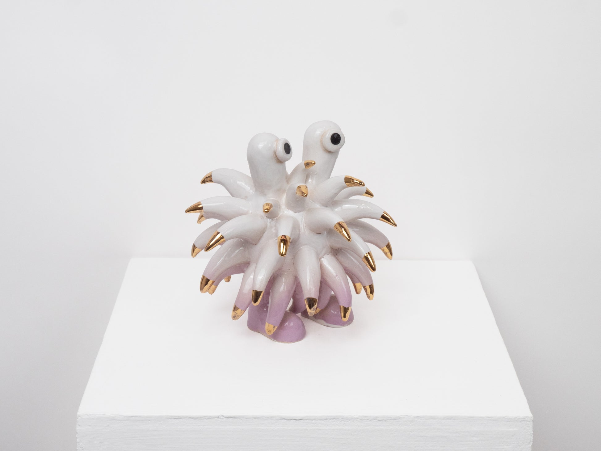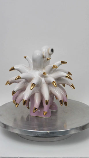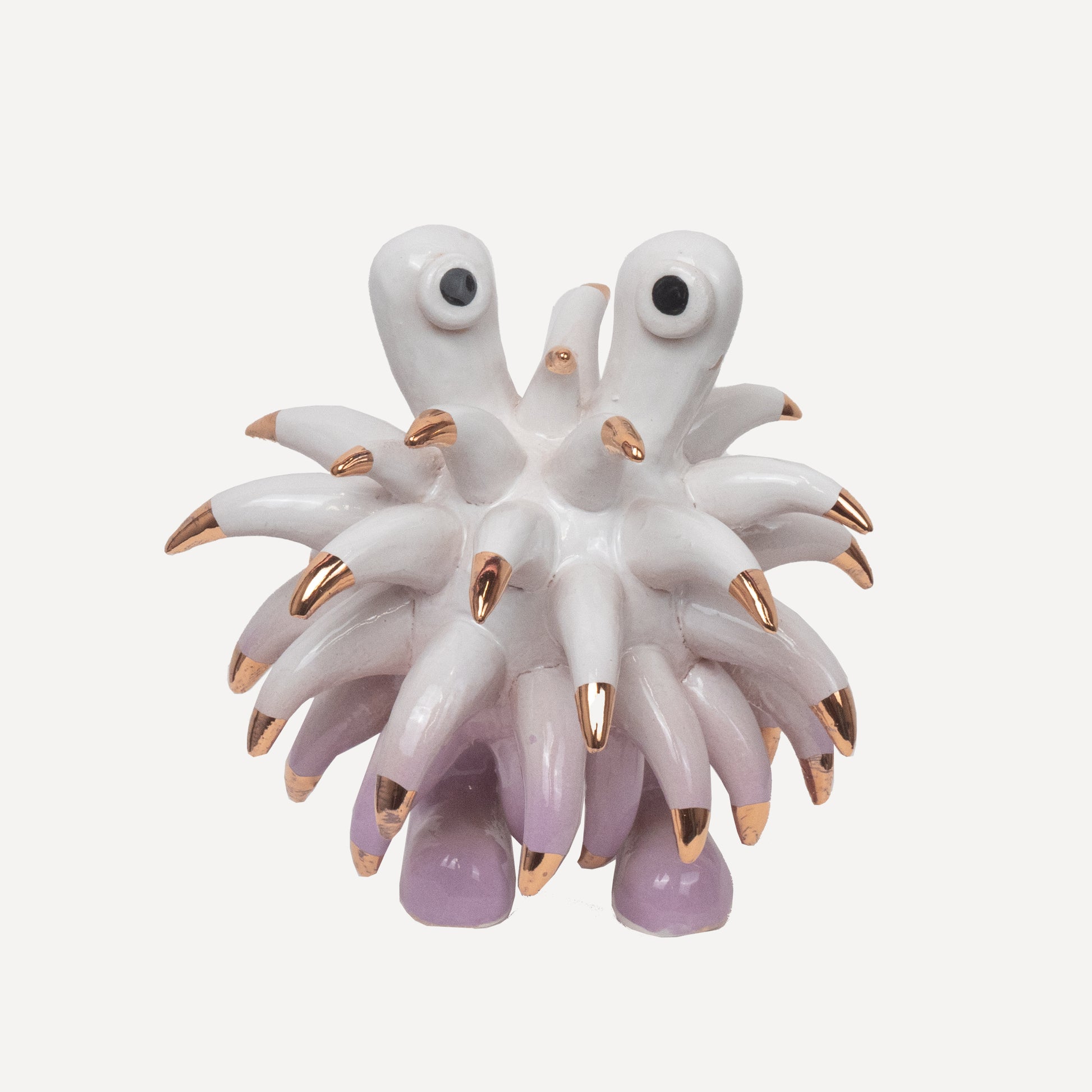 The Dinky Devin is a hand-built ceramic sculpture covered with a spiky texture. The glaze is a white to lilac fade. Each of the tips has been decorated with a 24 karat gold lustre, giving Dinky Devin a little bit of magic.