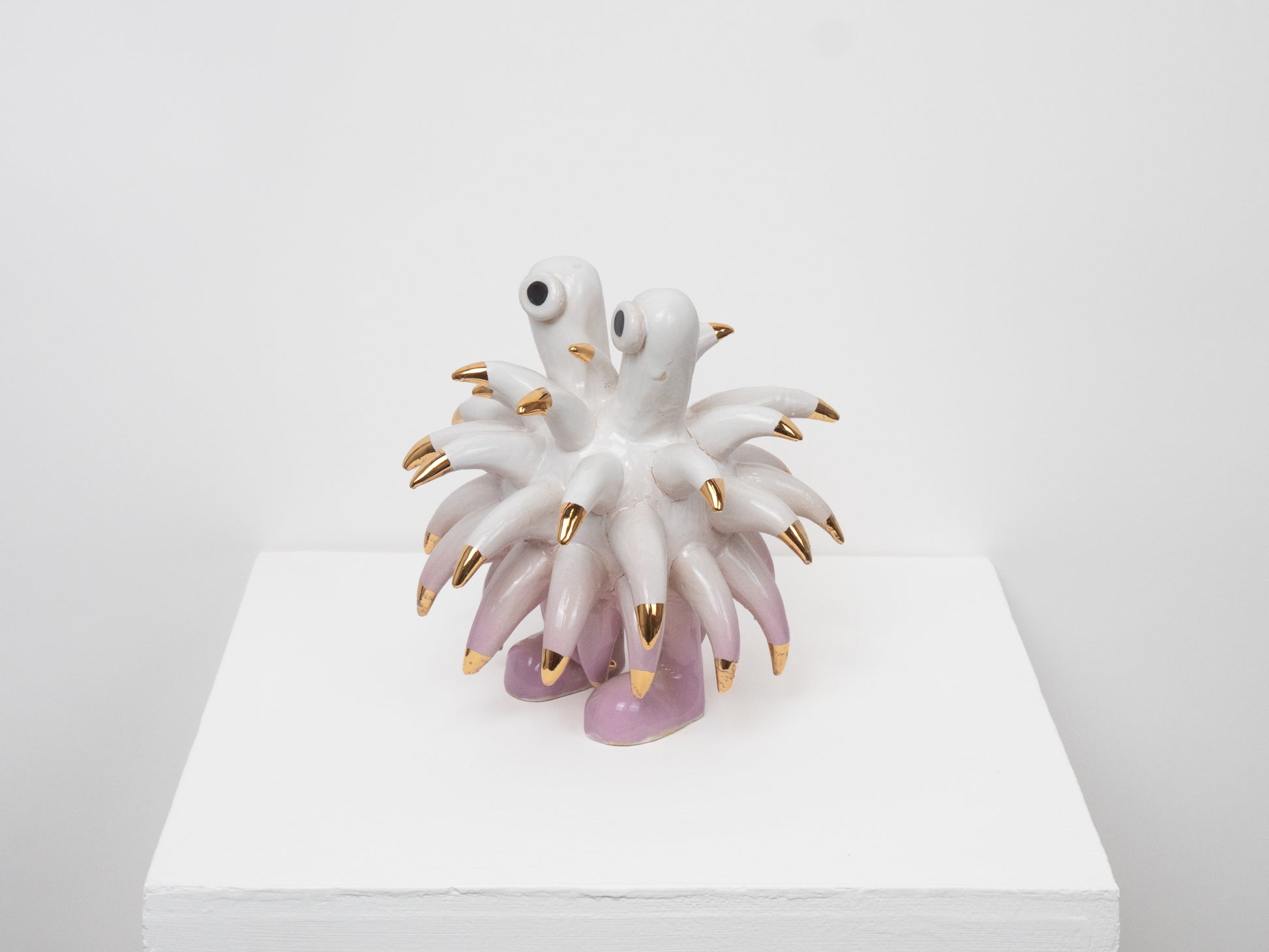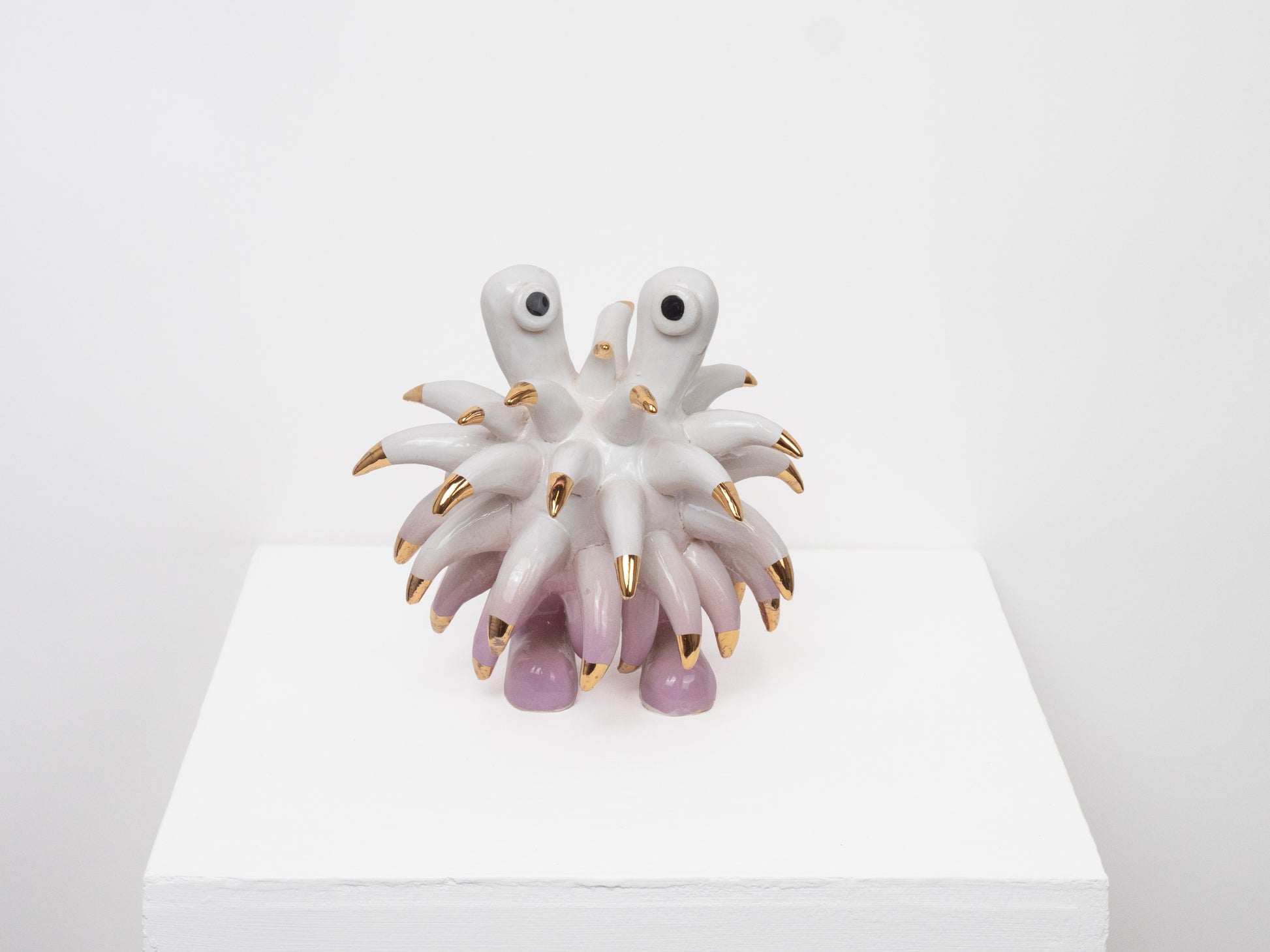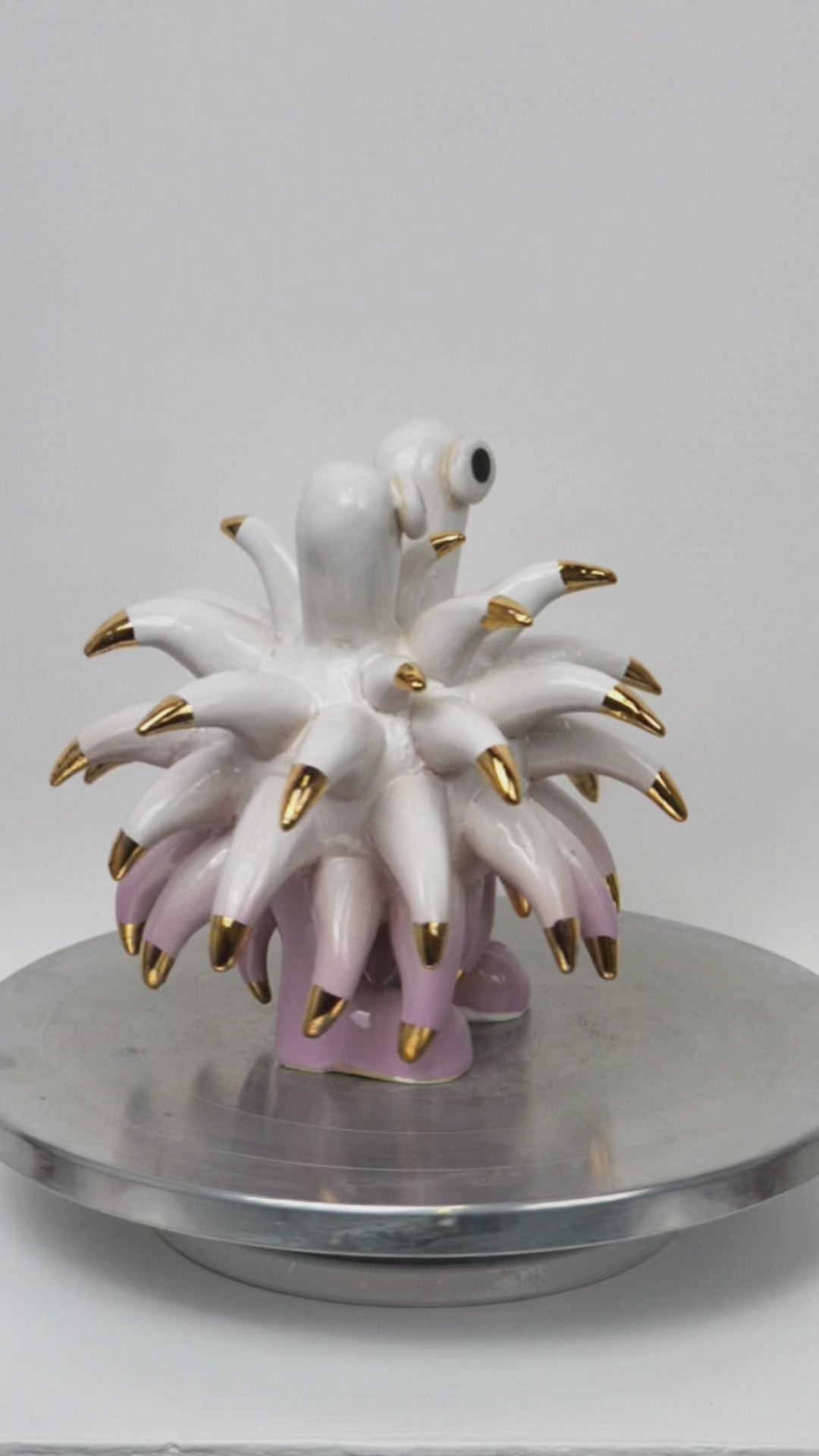The Dinky Devin is a hand-built ceramic sculpture covered with a spiky texture. The glaze is a white to lilac fade. Each of the tips has been decorated with a 24 karat gold lustre, giving Dinky Devin a little bit of magic.