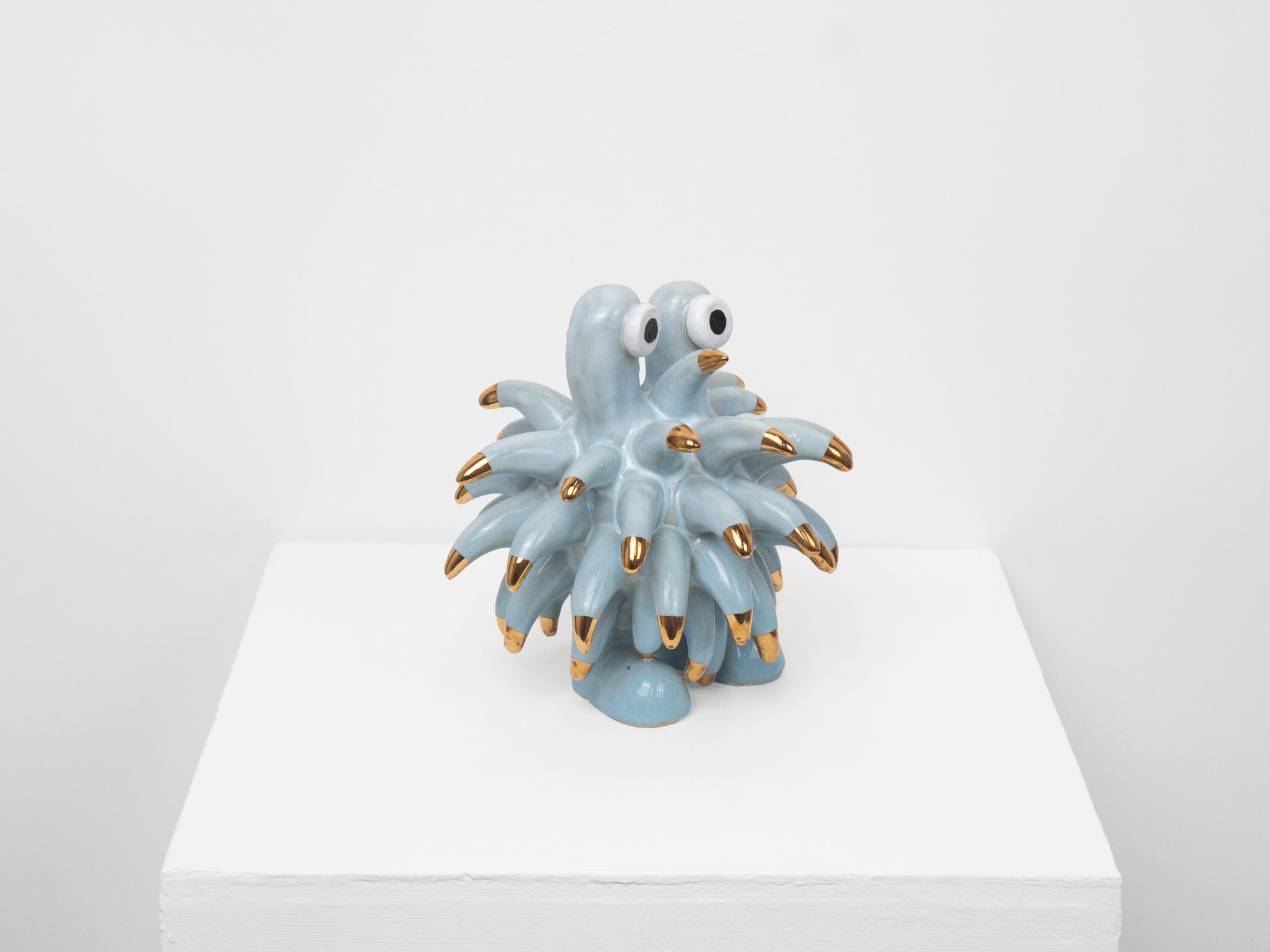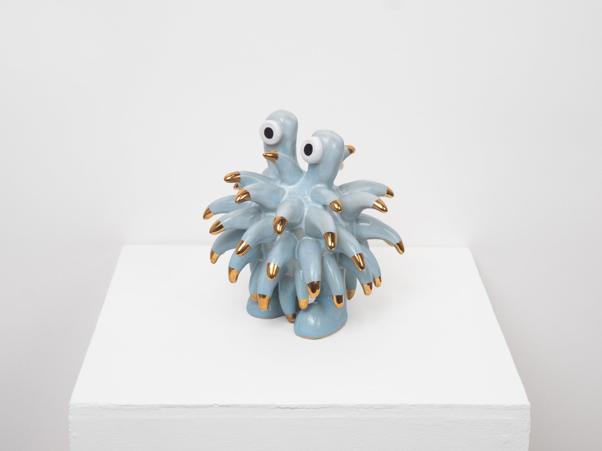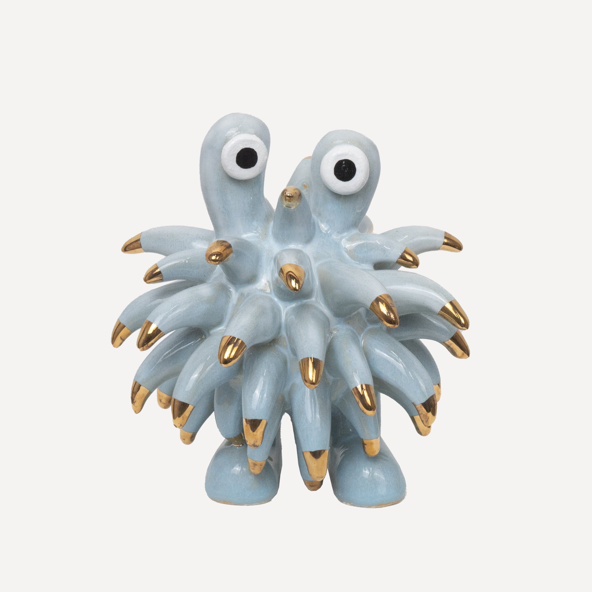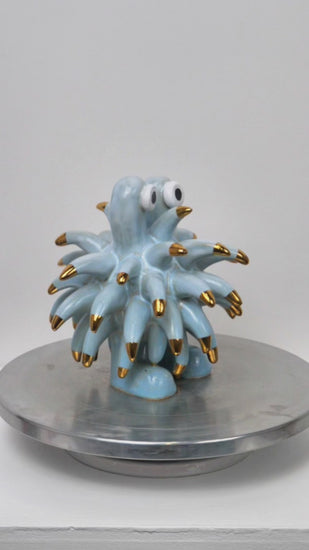 The Dinky Devin is a hand-built ceramic sculpture covered with a spiky texture. The 'Soft Sky' glaze has been specially created at Hannah Simpson Studio and gives the monster a light blue colouring. Each of the tips has been decorated with a 24 karat gold lustre, giving Dinky Devin a little bit of magic.