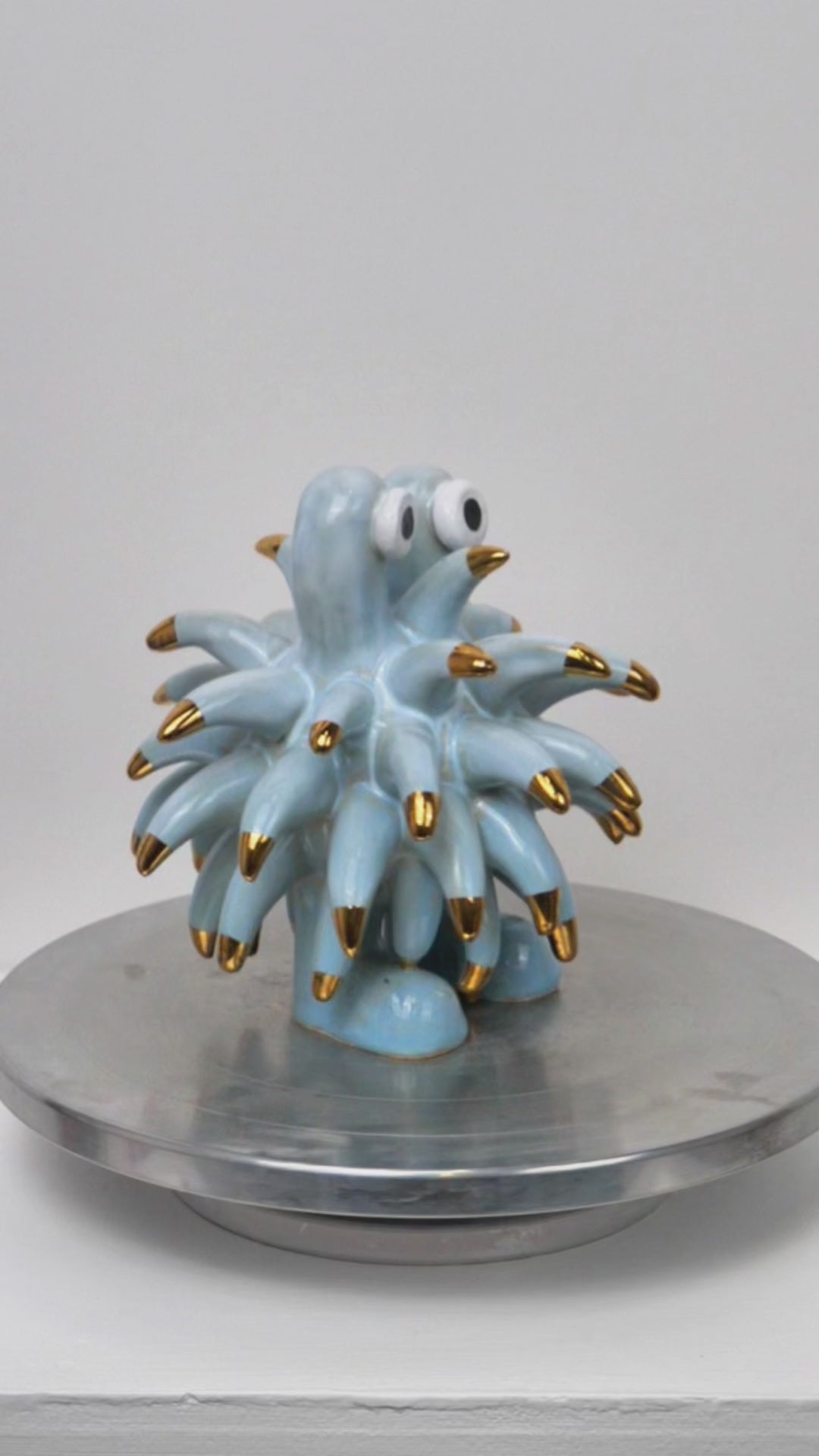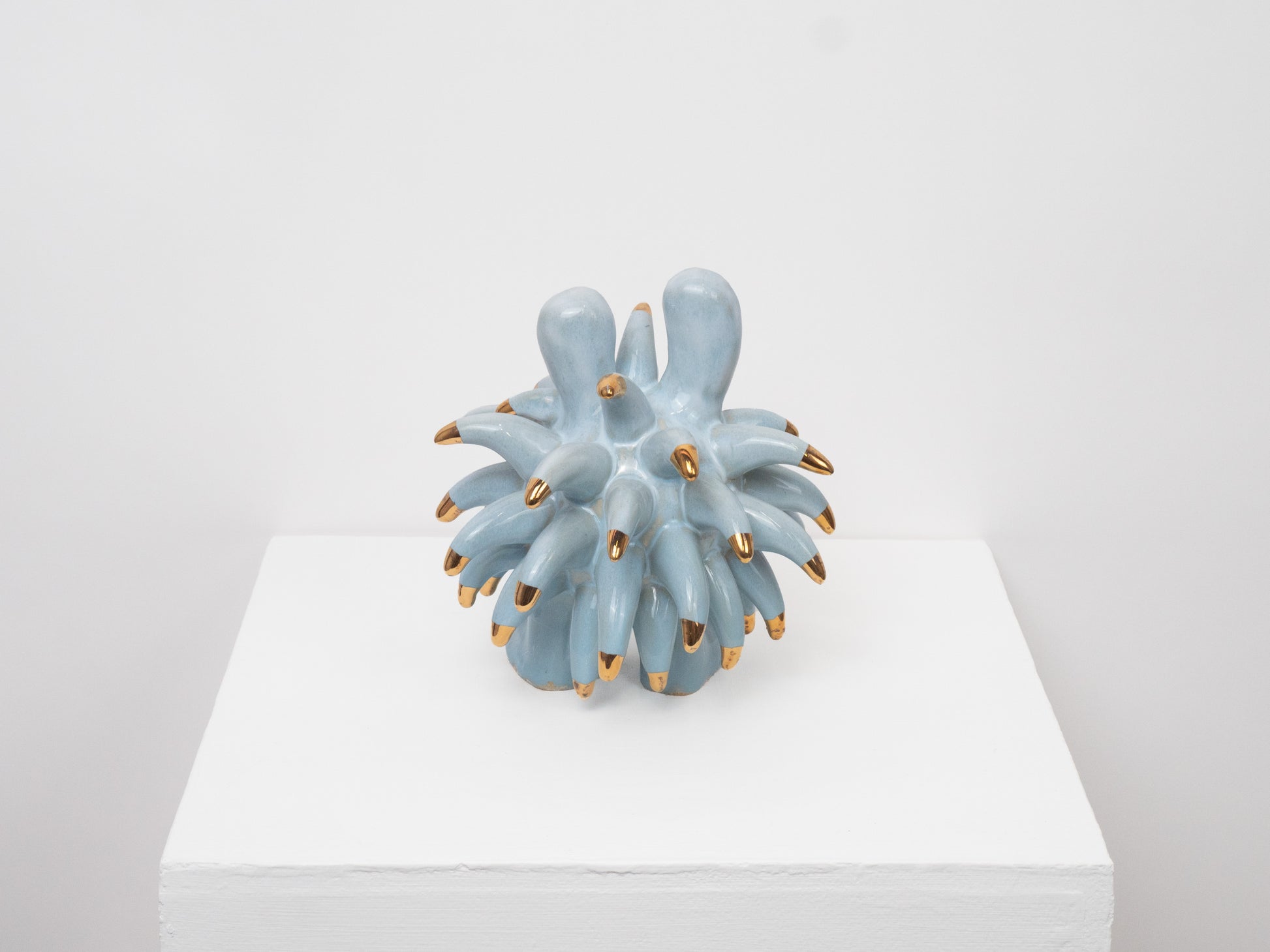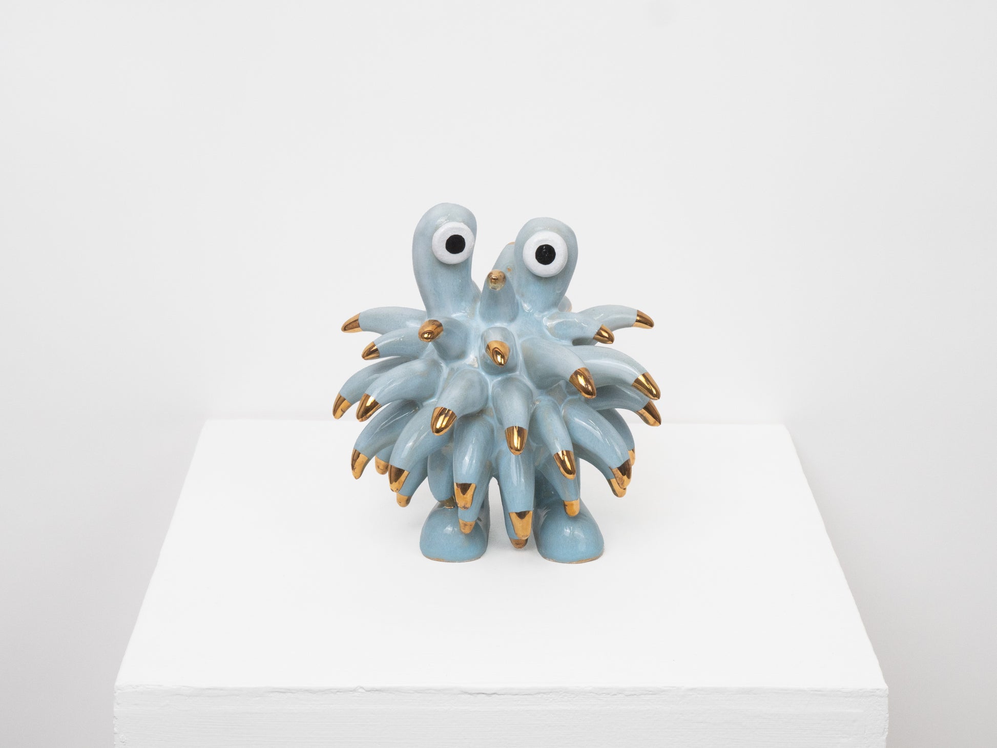 The Dinky Devin is a hand-built ceramic sculpture covered with a spiky texture. The 'Soft Sky' glaze has been specially created at Hannah Simpson Studio and gives the monster a light blue colouring. Each of the tips has been decorated with a 24 karat gold lustre, giving Dinky Devin a little bit of magic.