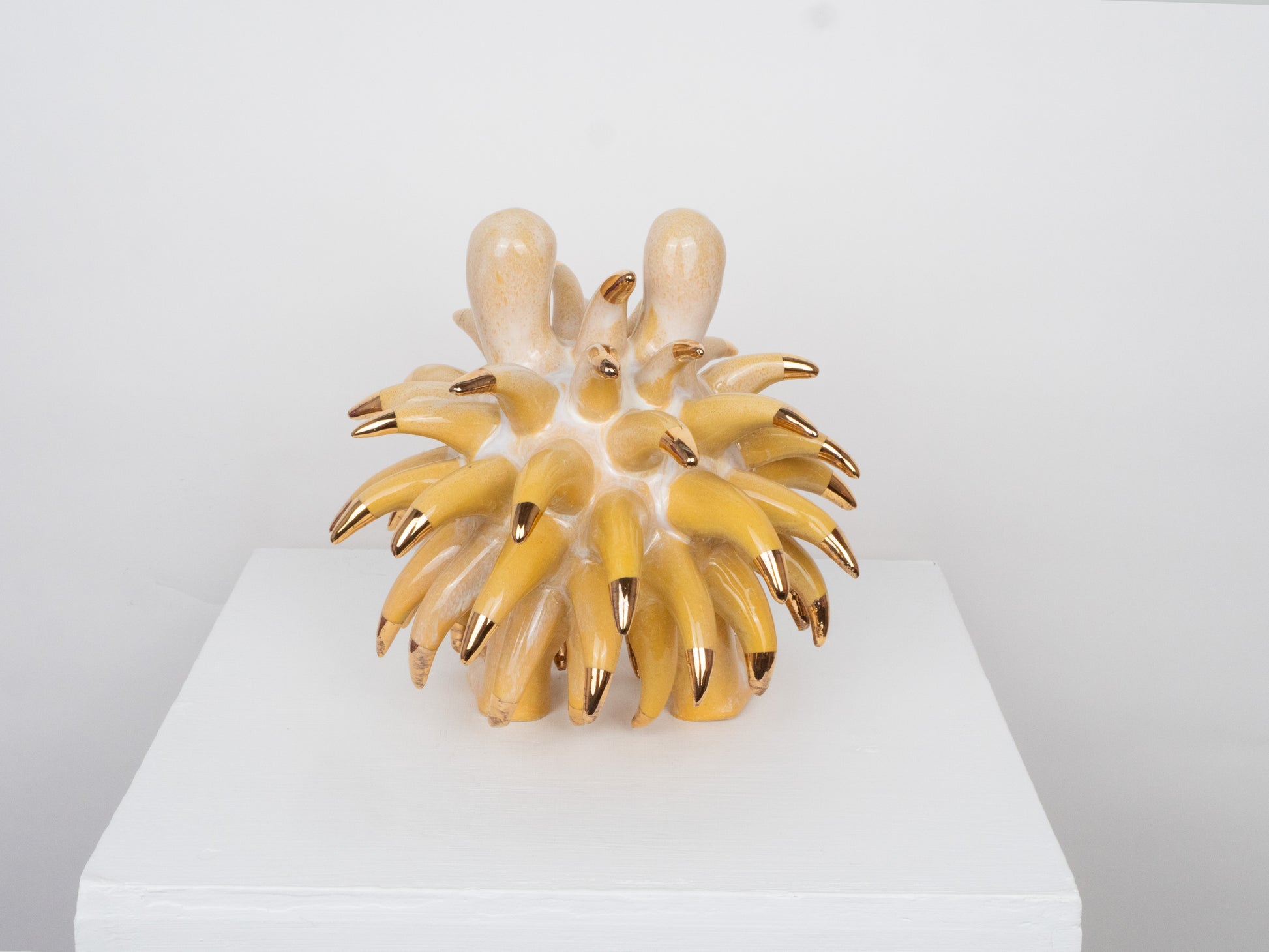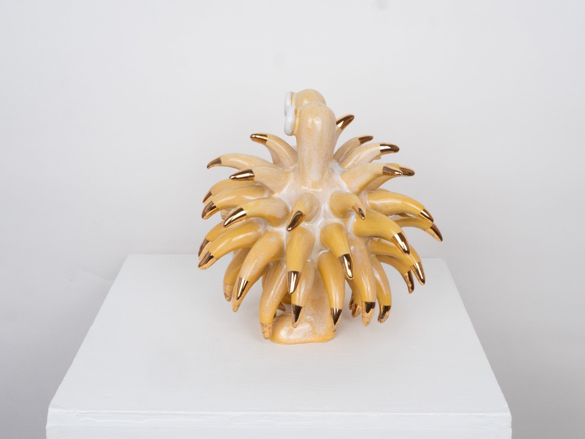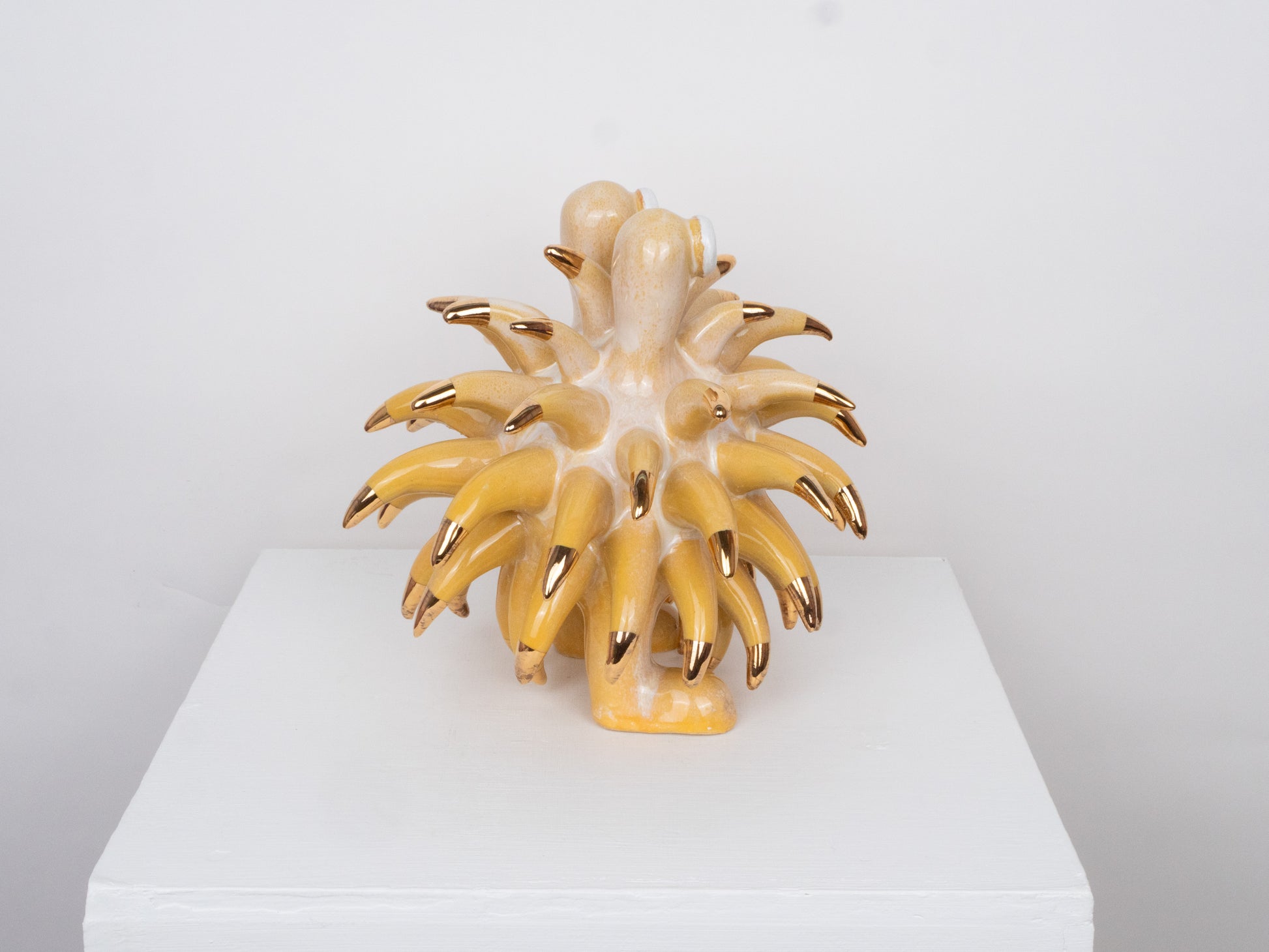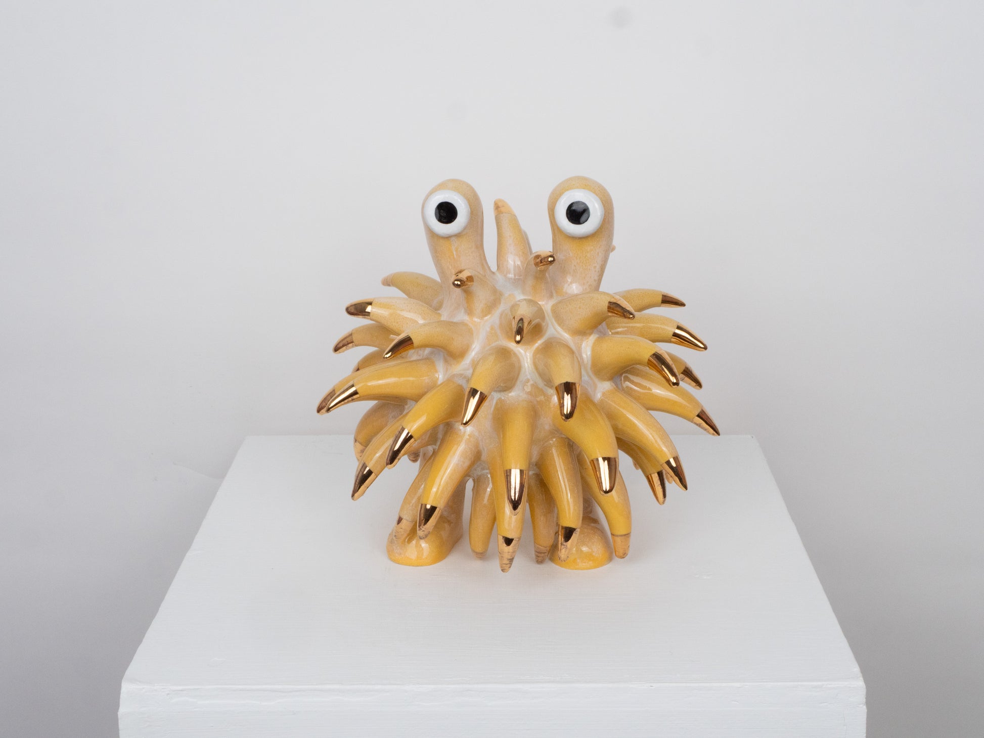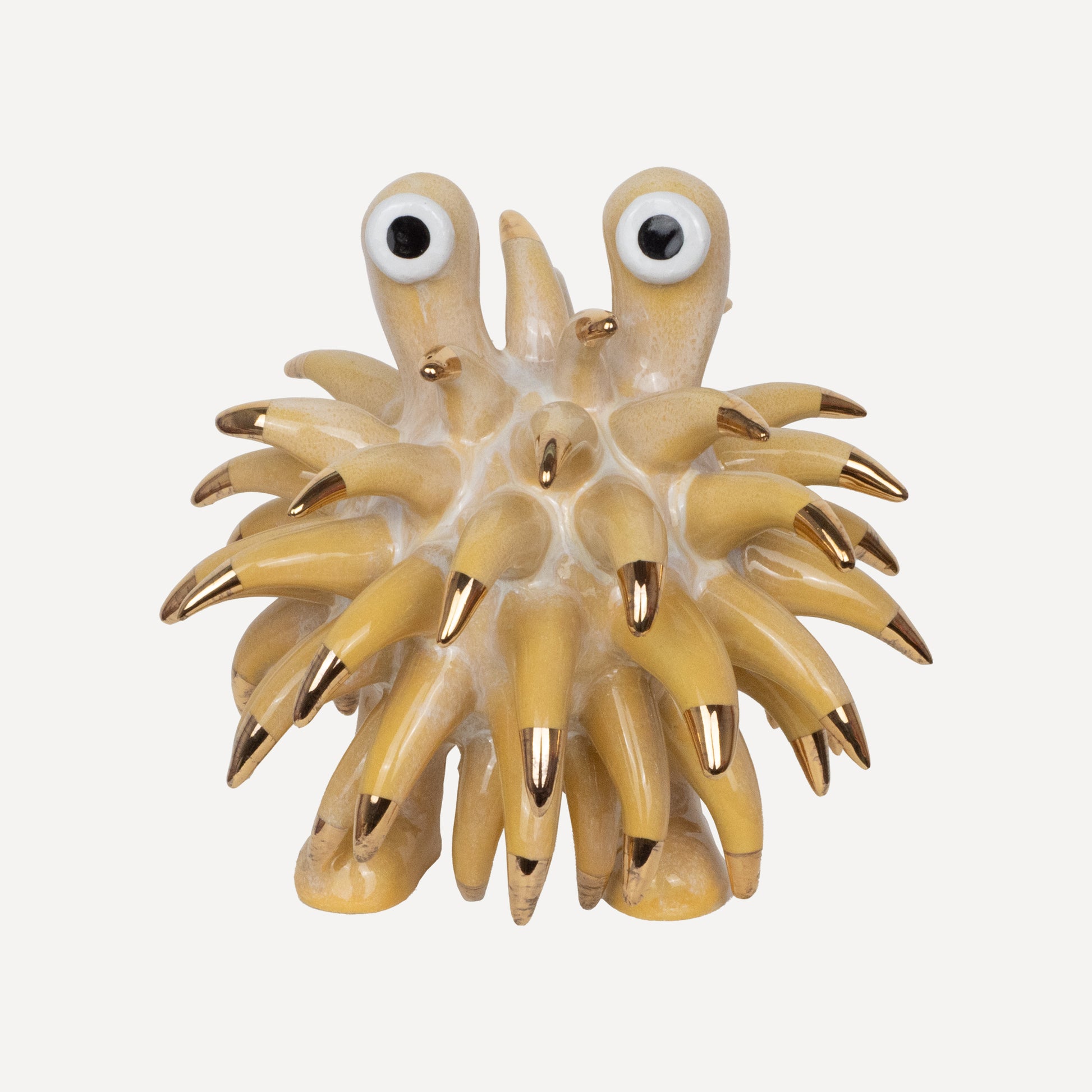 The Dinky Devin is a hand-built ceramic sculpture covered with a spiky texture. The 'Daisy' glaze has been specially created at Hannah Simpson Studio and gives the monster a colouring. Each of the tips has been decorated with a 24 karat gold lustre, giving Dinky Devin a little bit of magic.