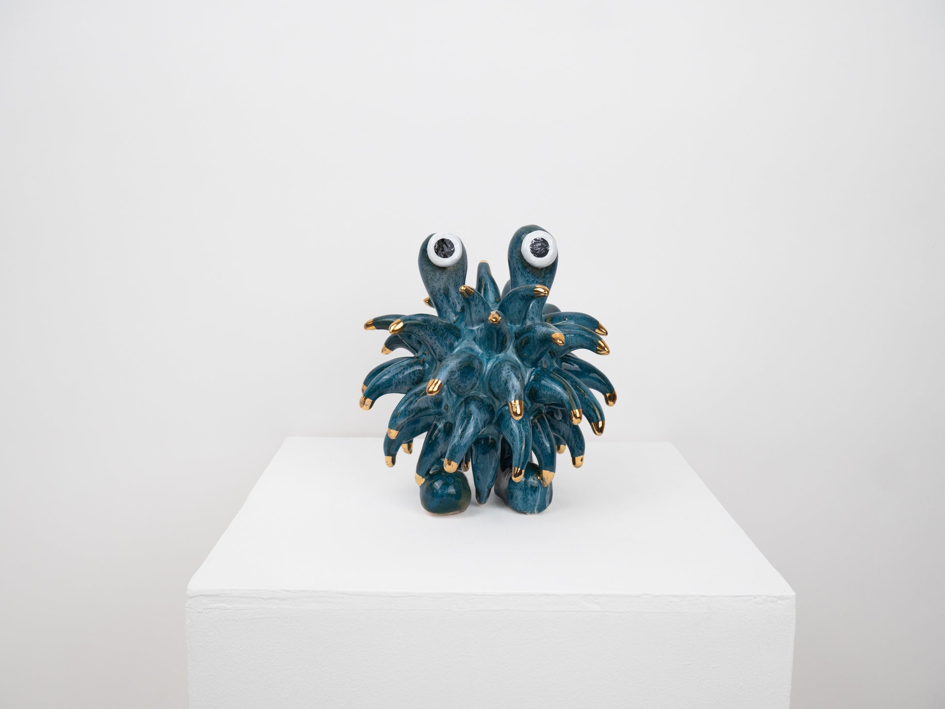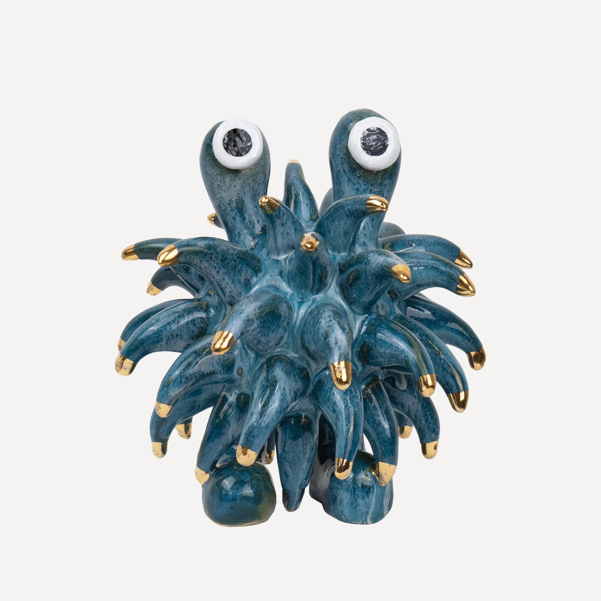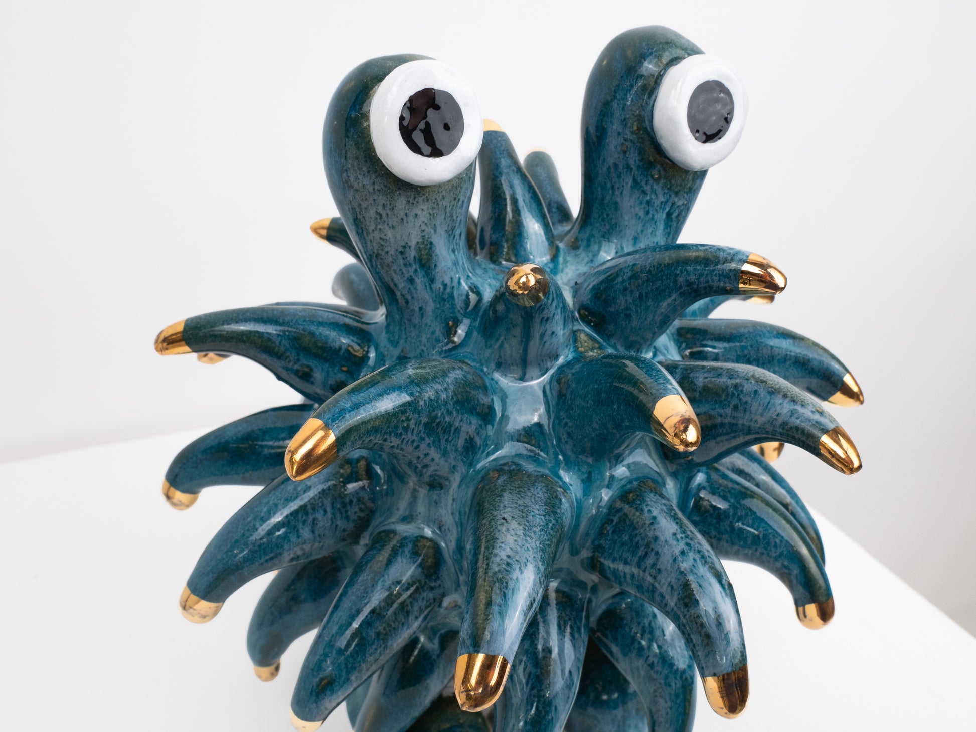 The Dinky Devin is a hand-built ceramic sculpture covered with a spiky texture. The 'Glacier' glaze has been specially created at Hannah Simpson Studio and gives the monster a colouring. Each of the tips has been decorated with a 24 karat gold lustre, giving Dinky Devin a little bit of magic.