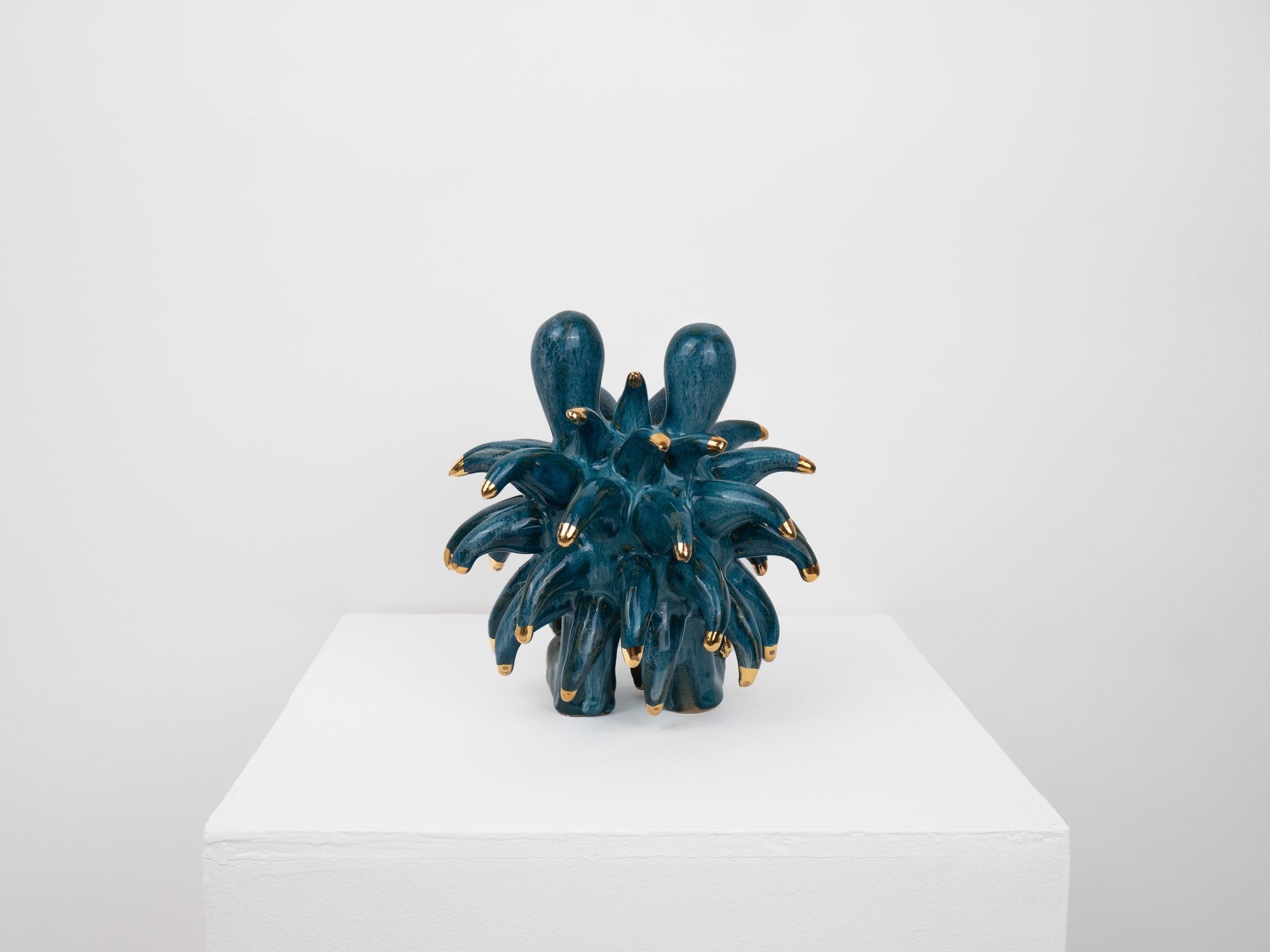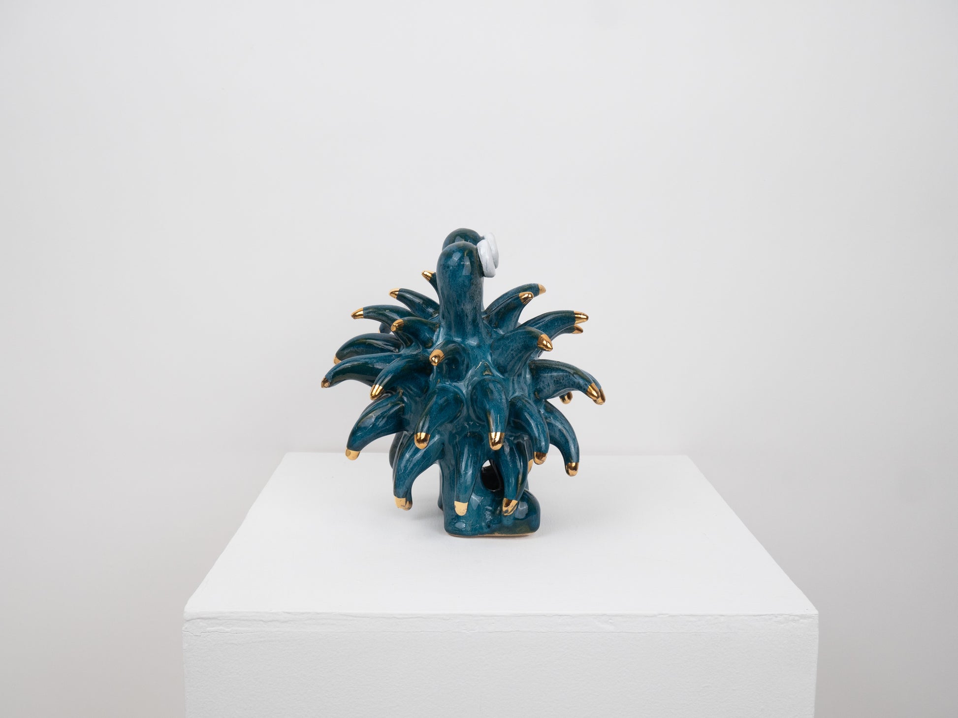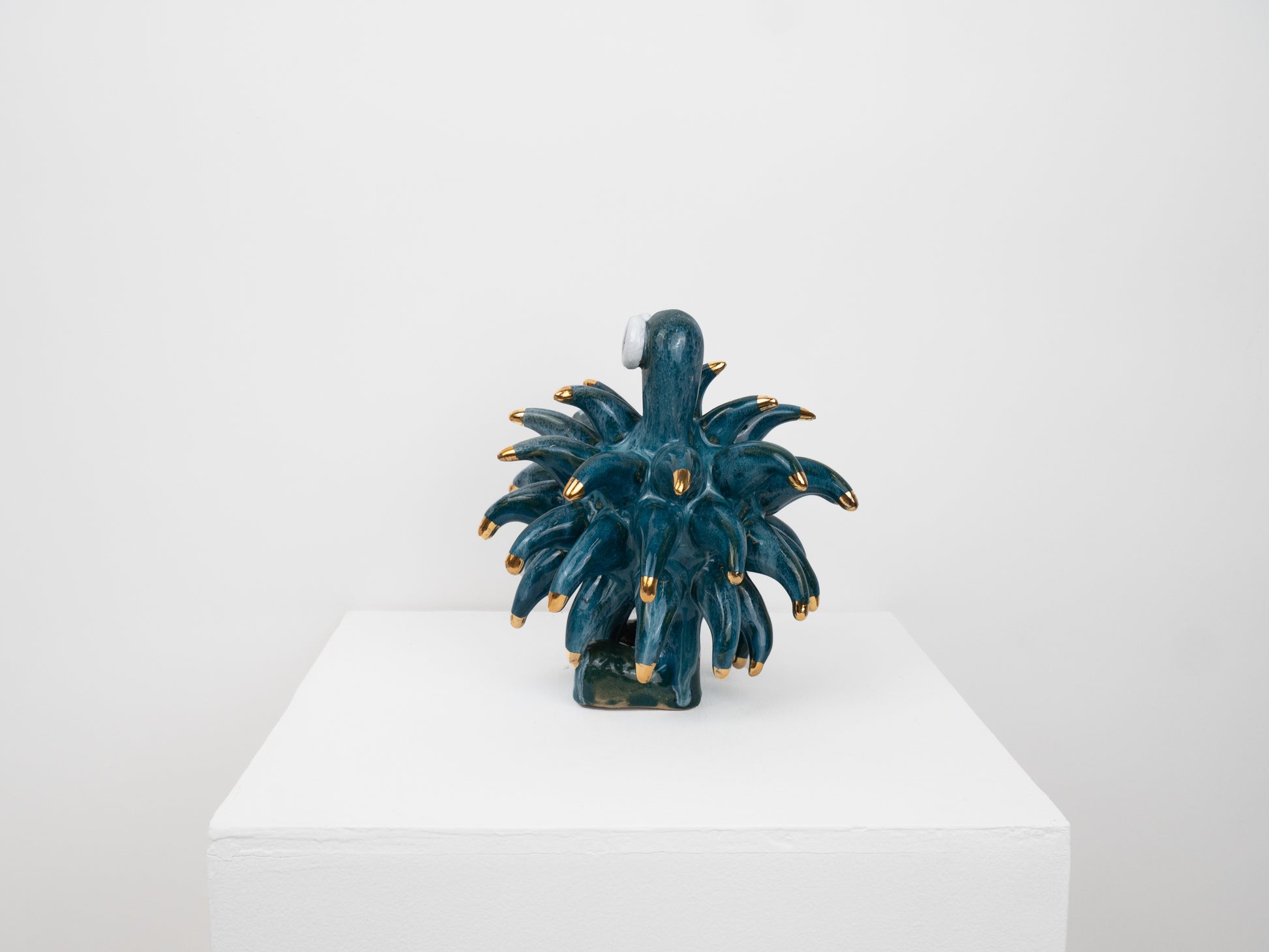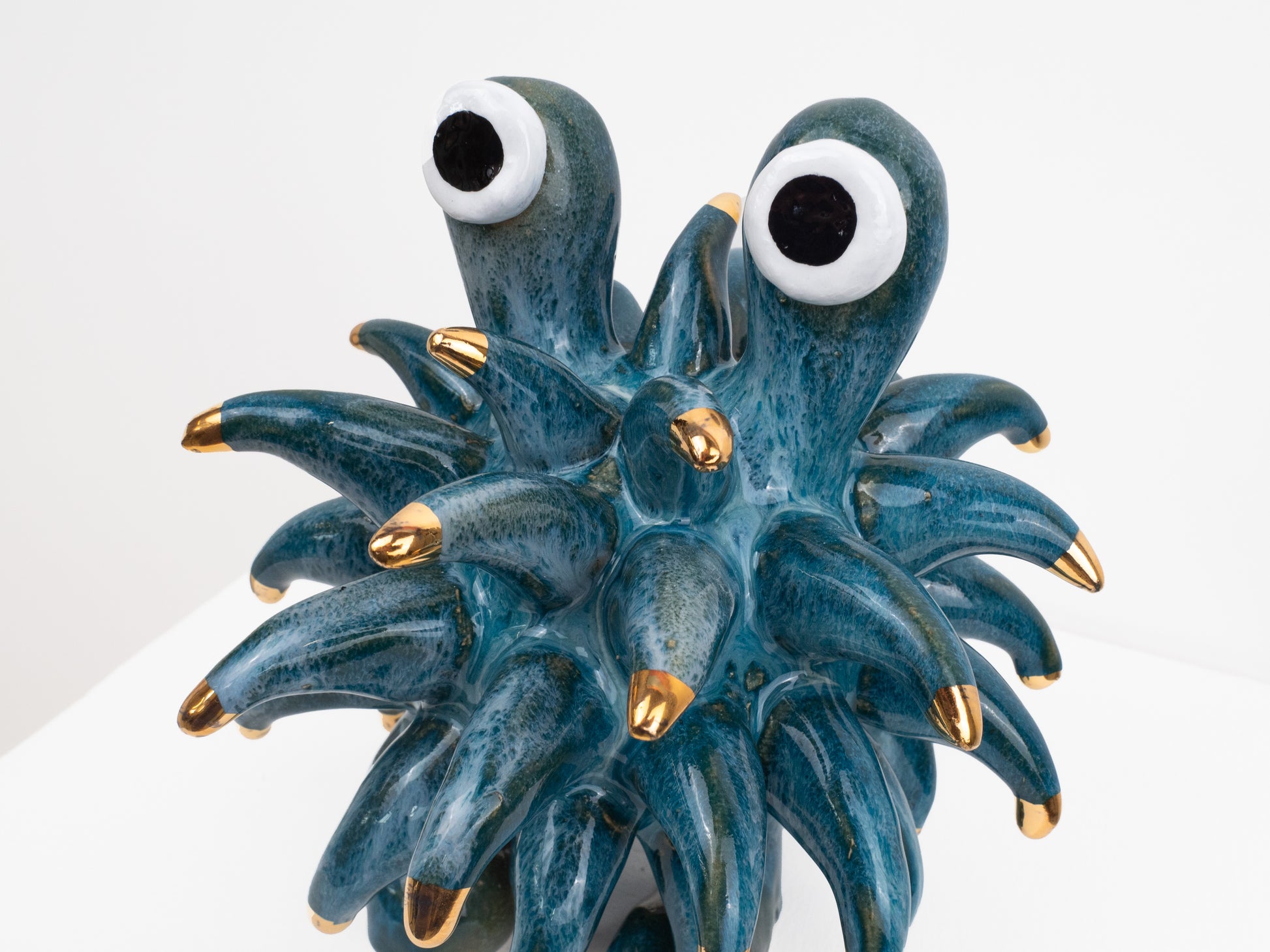 The Dinky Devin is a hand-built ceramic sculpture covered with a spiky texture. The 'Glacier' glaze has been specially created at Hannah Simpson Studio and gives the monster a colouring. Each of the tips has been decorated with a 24 karat gold lustre, giving Dinky Devin a little bit of magic.
