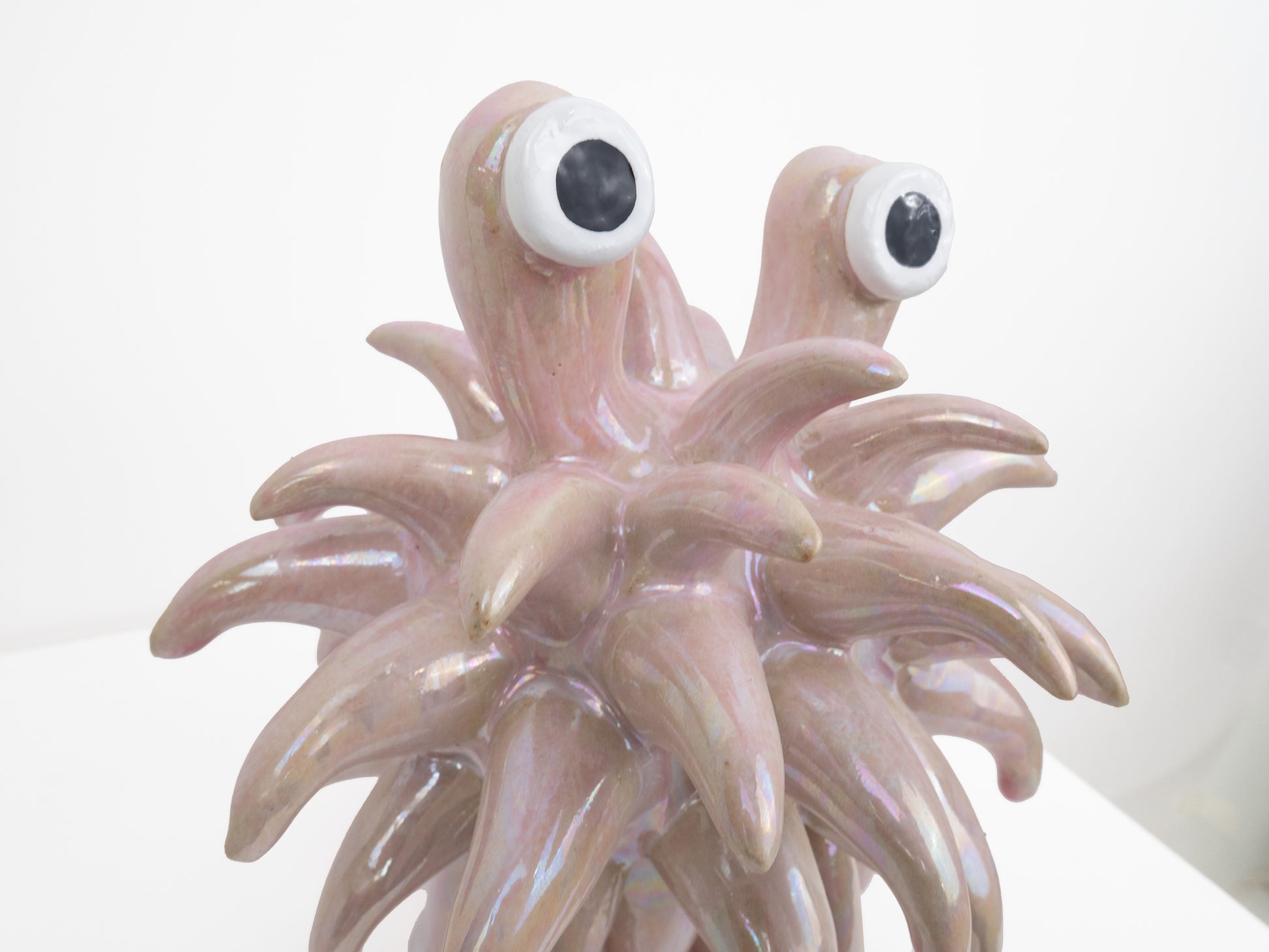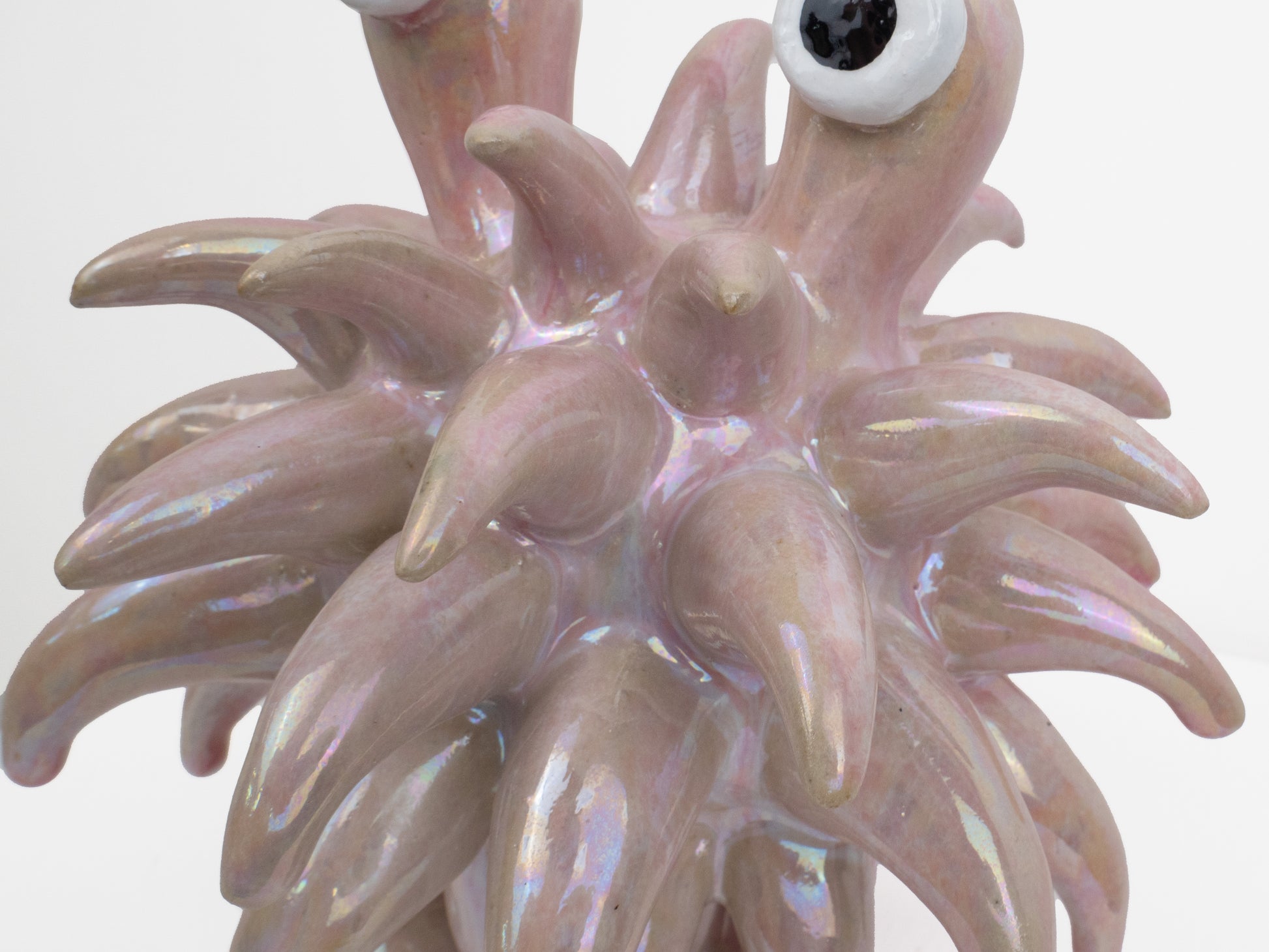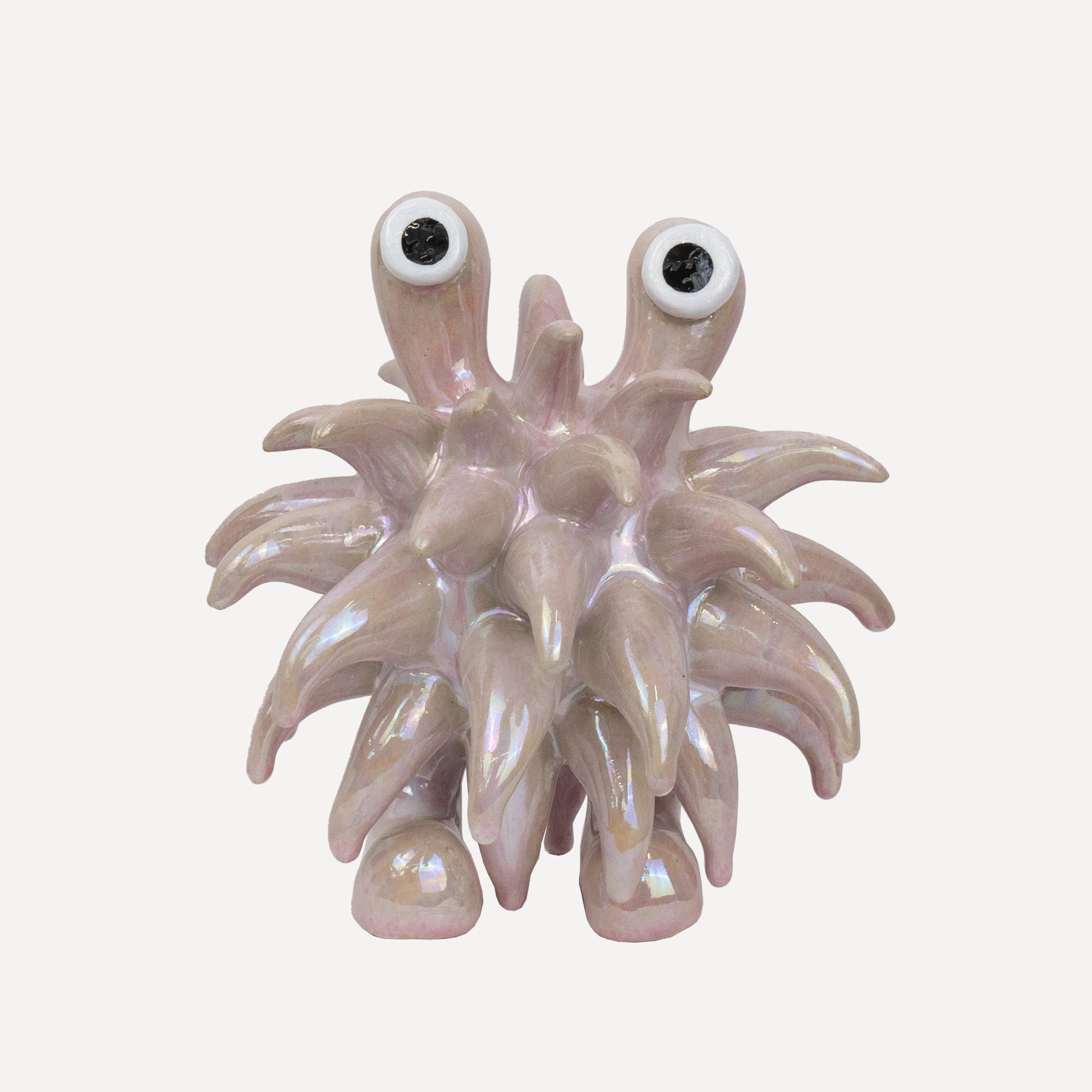 The 'Dinky Devin' is a hand-built ceramic sculpture covered with a spiky texture. The pink glaze has been specially created at Hannah Simpson Studio and gives the monster a light pink colouring. It has then been covered in a pearl lustre, giving 'Dinky Devin' a little bit of magic.