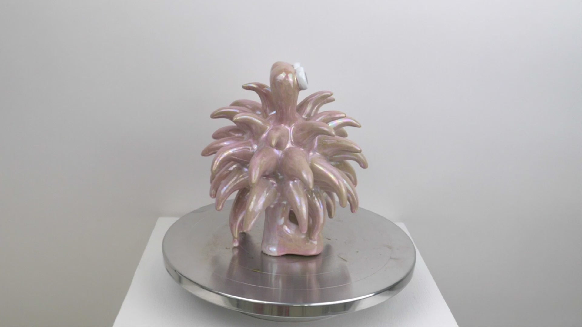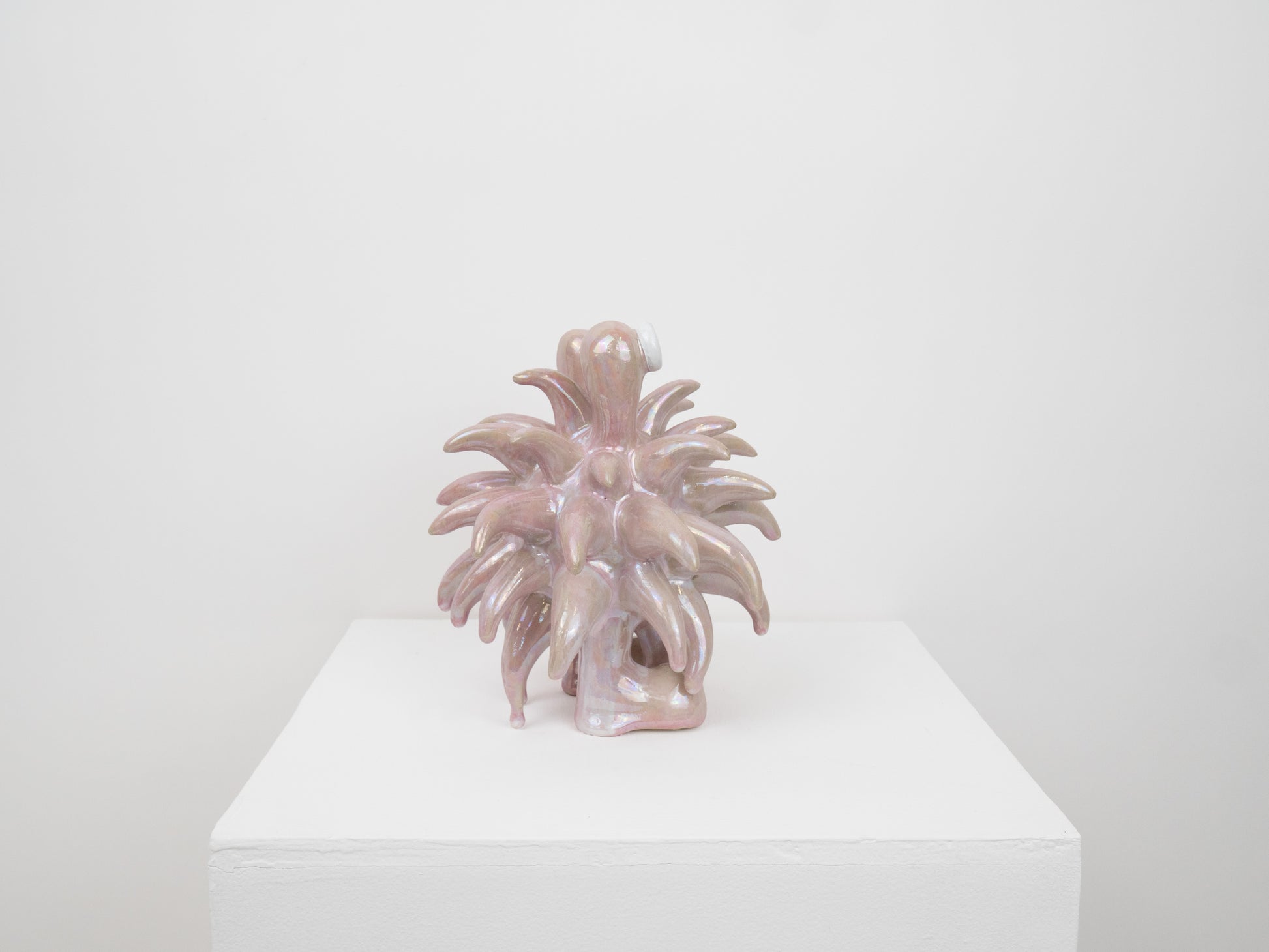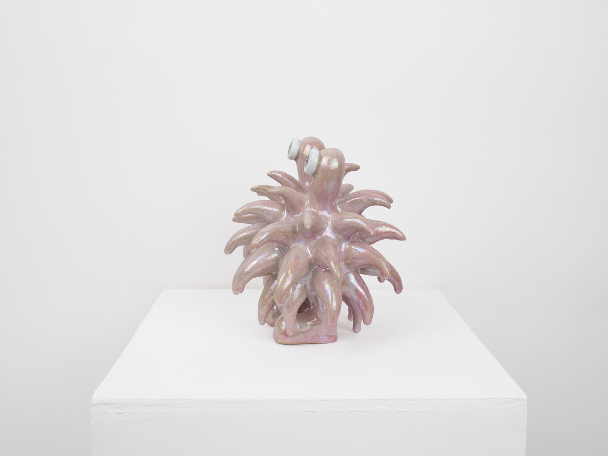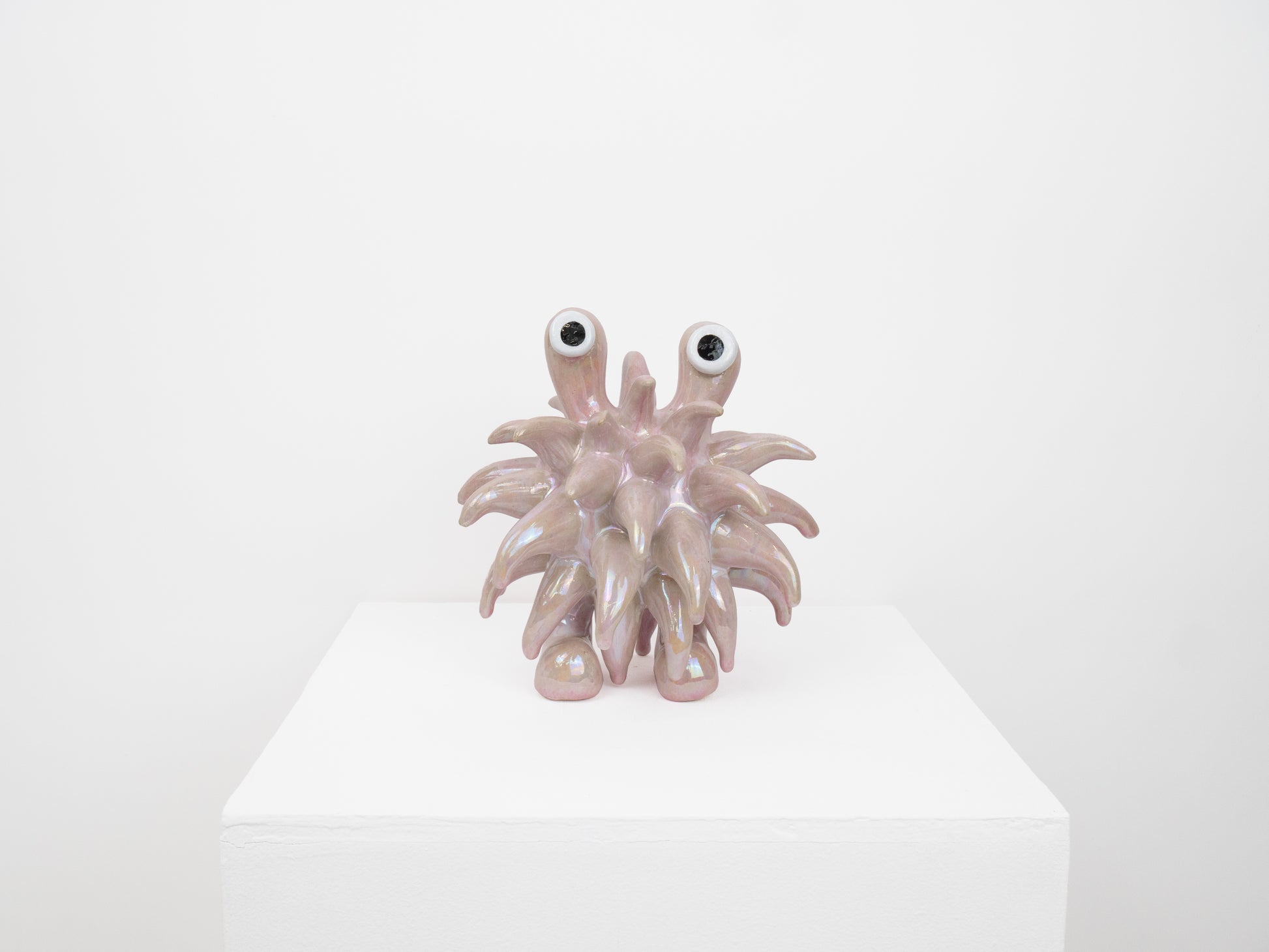 The 'Dinky Devin' is a hand-built ceramic sculpture covered with a spiky texture. The pink glaze has been specially created at Hannah Simpson Studio and gives the monster a light pink colouring. It has then been covered in a pearl lustre, giving 'Dinky Devin' a little bit of magic.