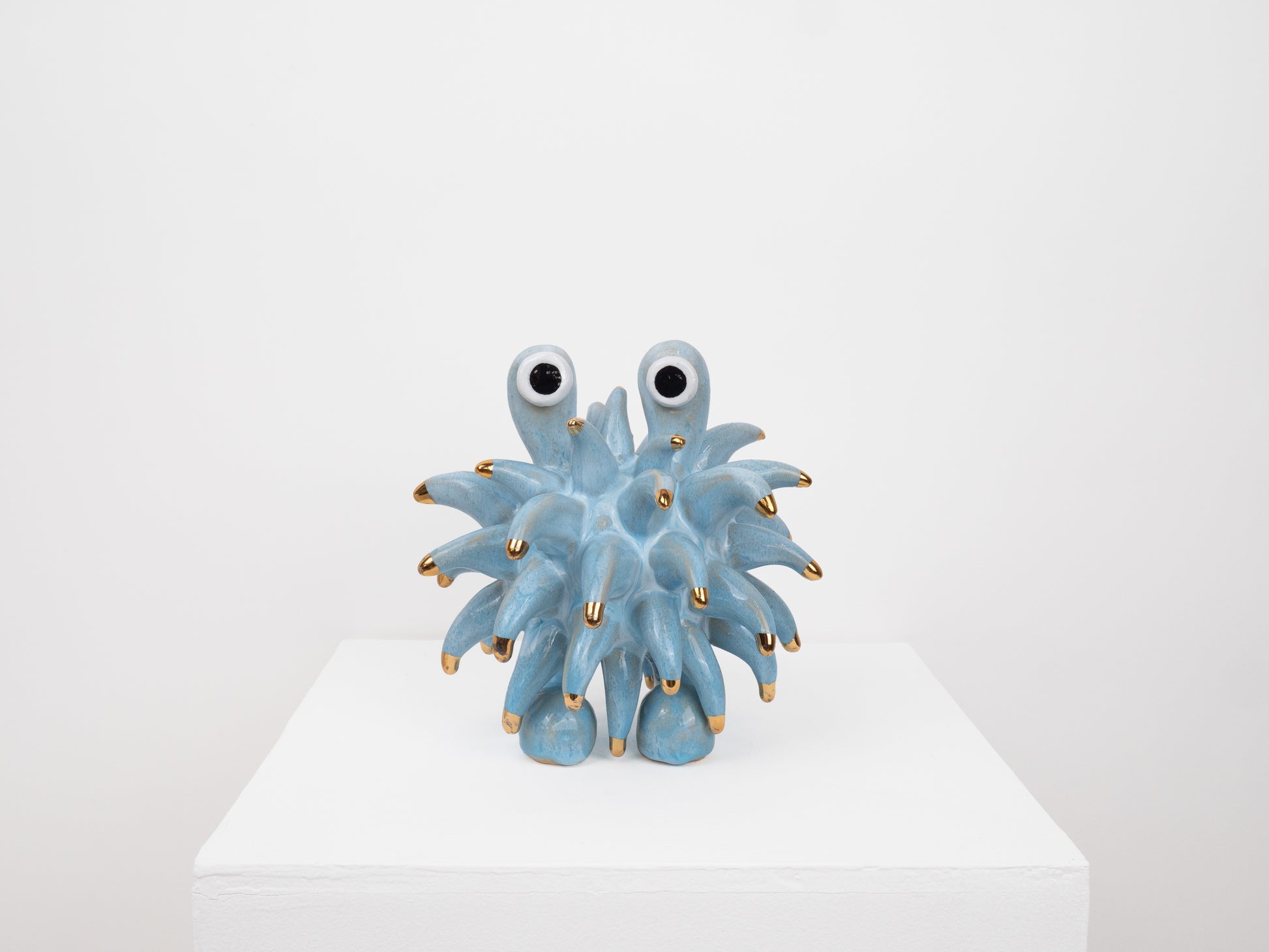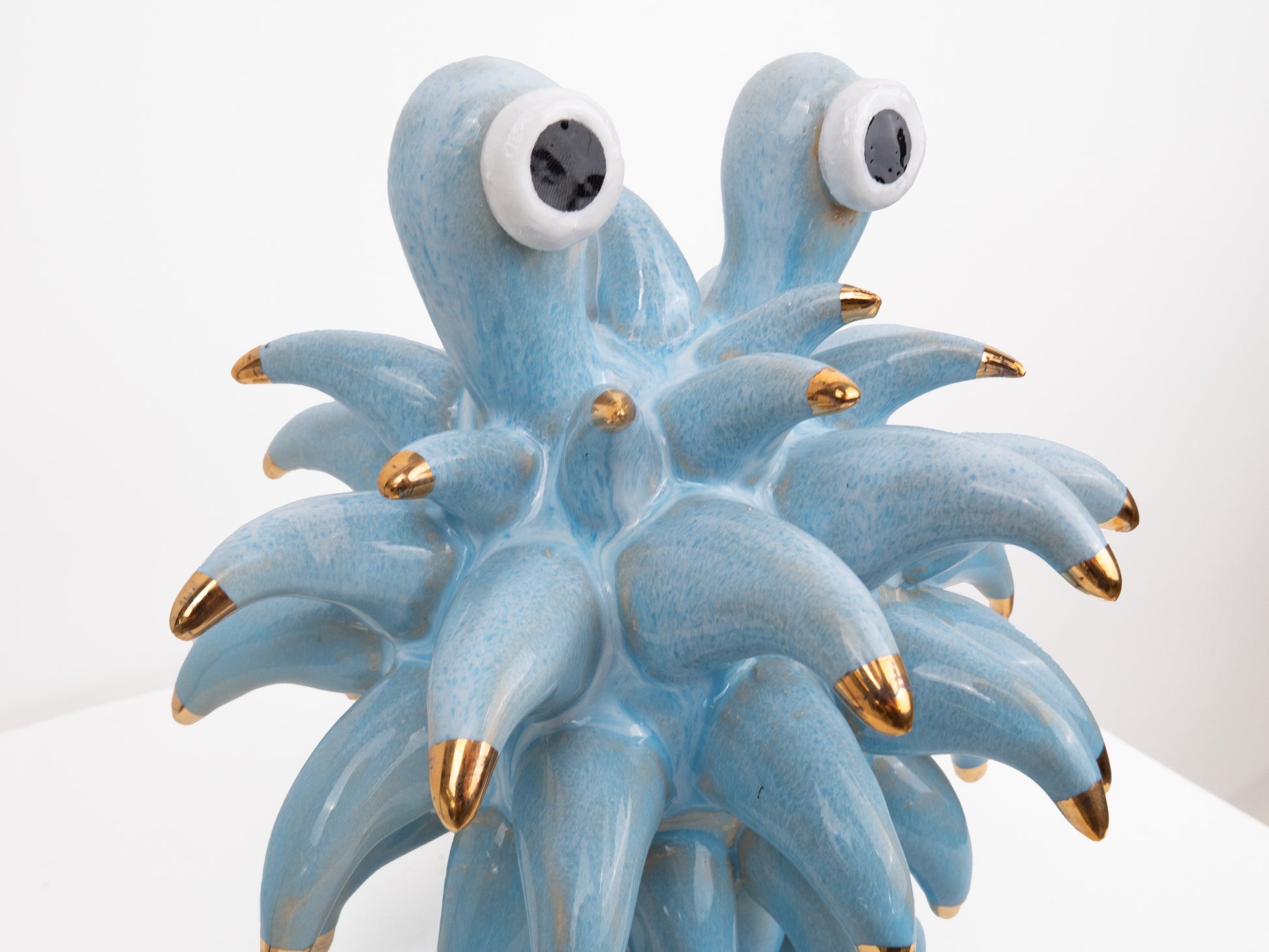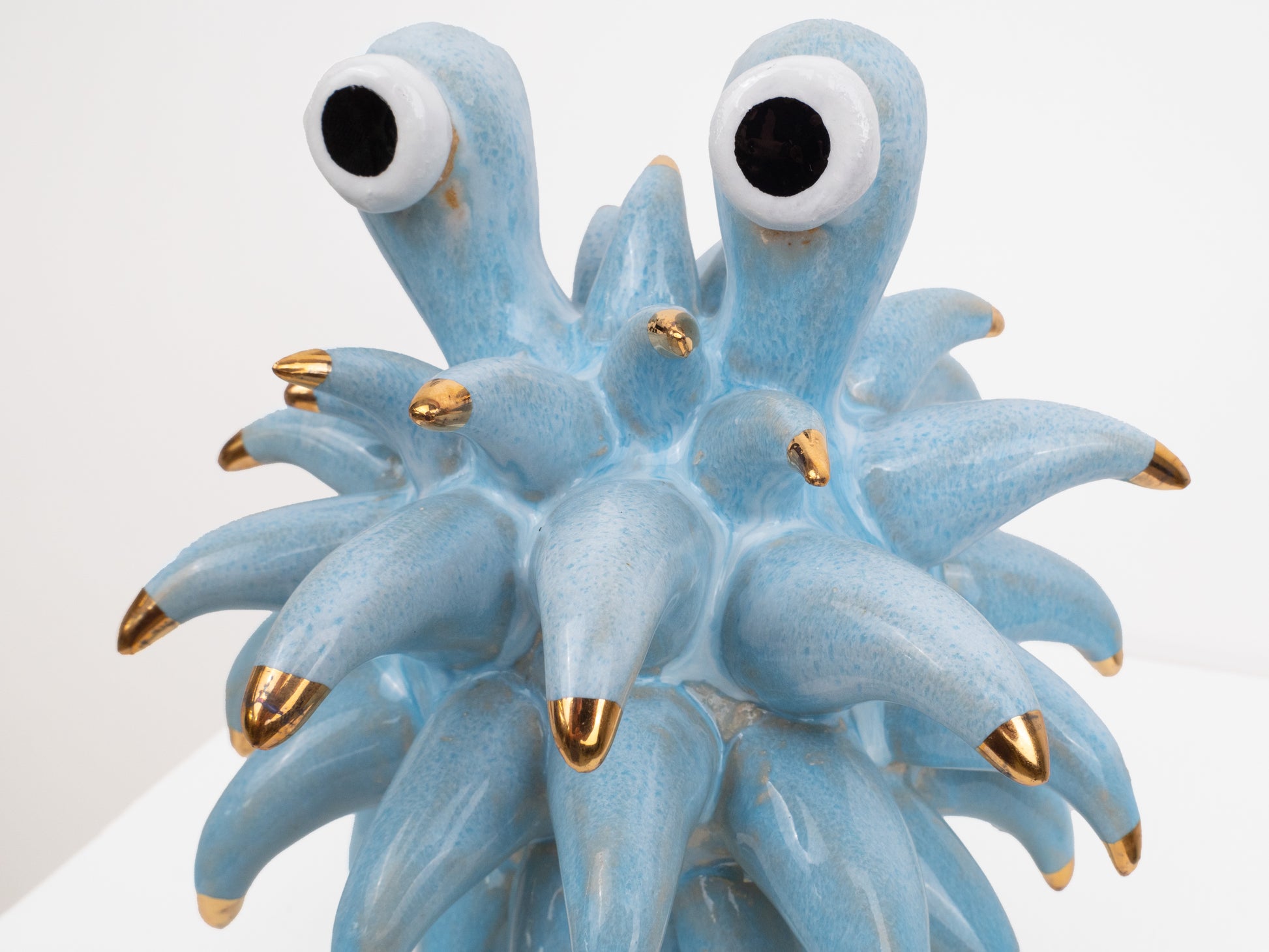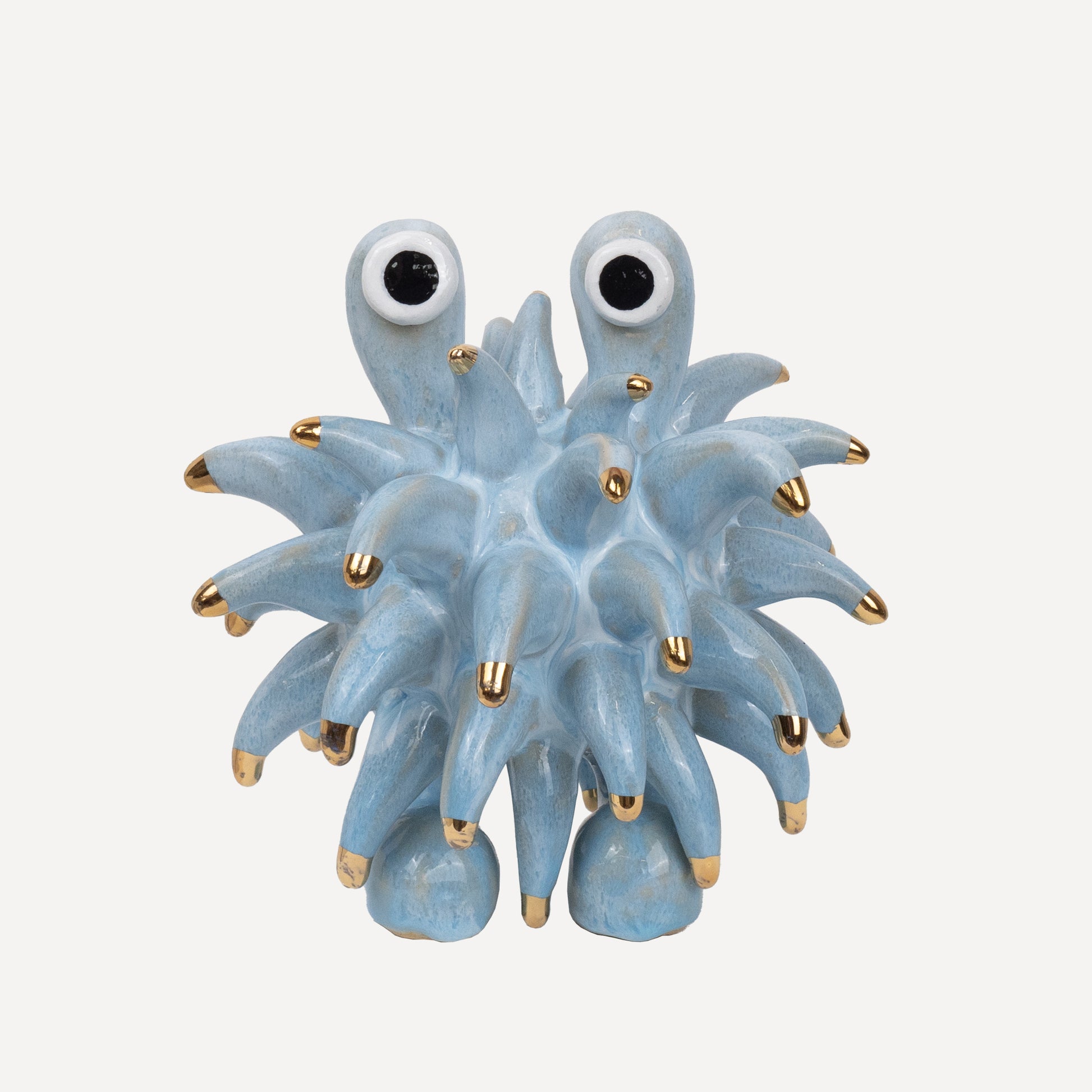 The Dinky Devin is a hand-built ceramic sculpture covered with a spiky texture. The 'soft sky' glaze has been specially created at Hannah Simpson Studio and gives the monster a light blue colouring.