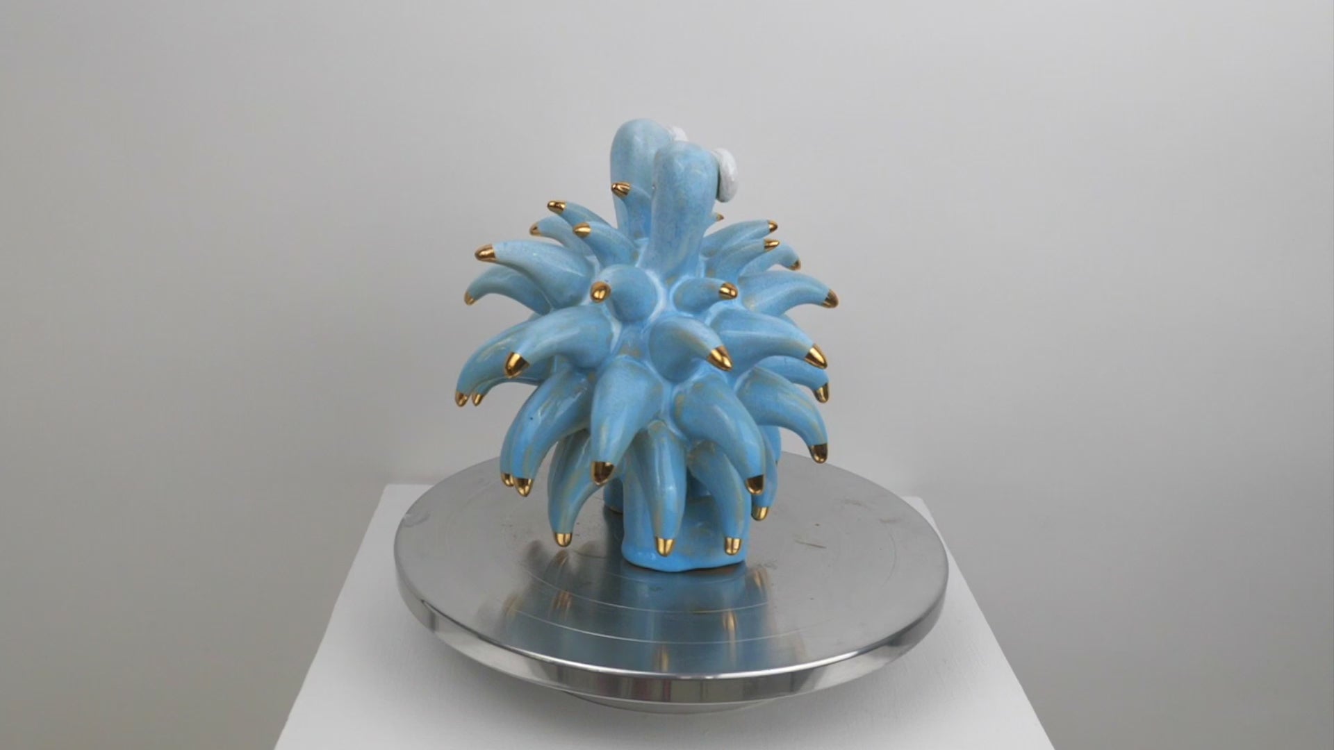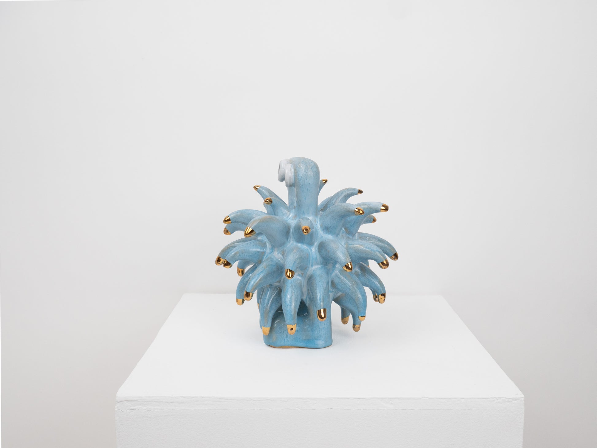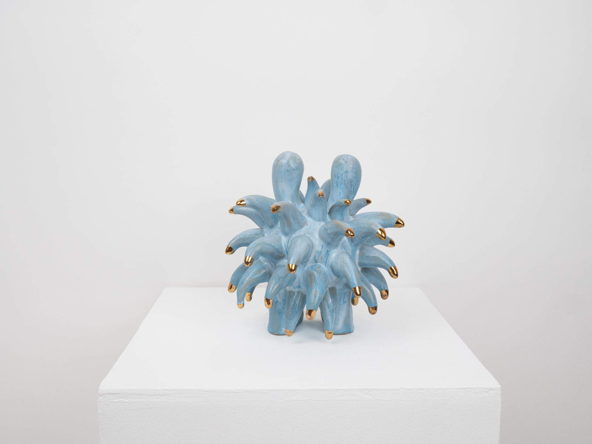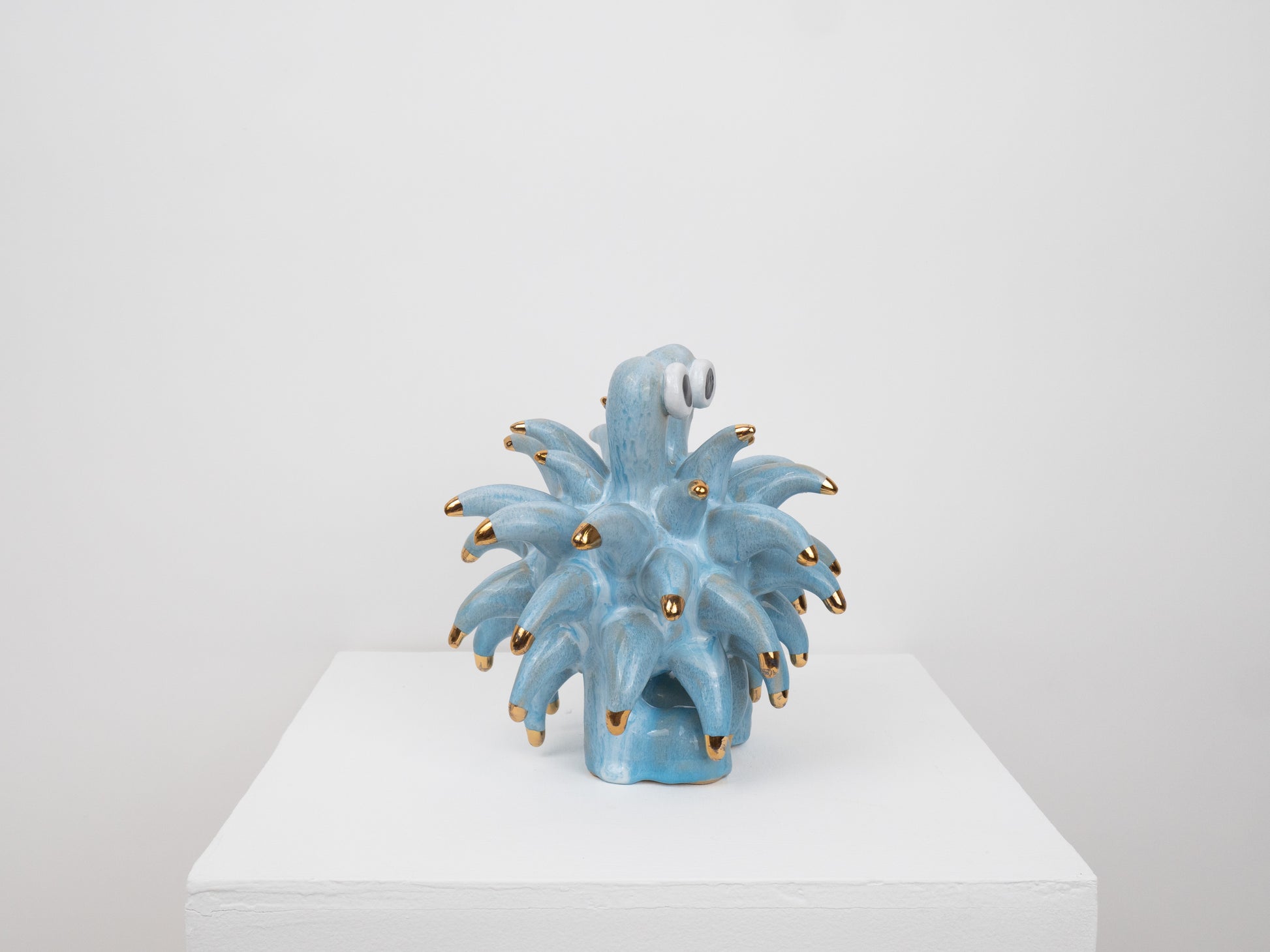 The Dinky Devin is a hand-built ceramic sculpture covered with a spiky texture. The 'soft sky' glaze has been specially created at Hannah Simpson Studio and gives the monster a light blue colouring.