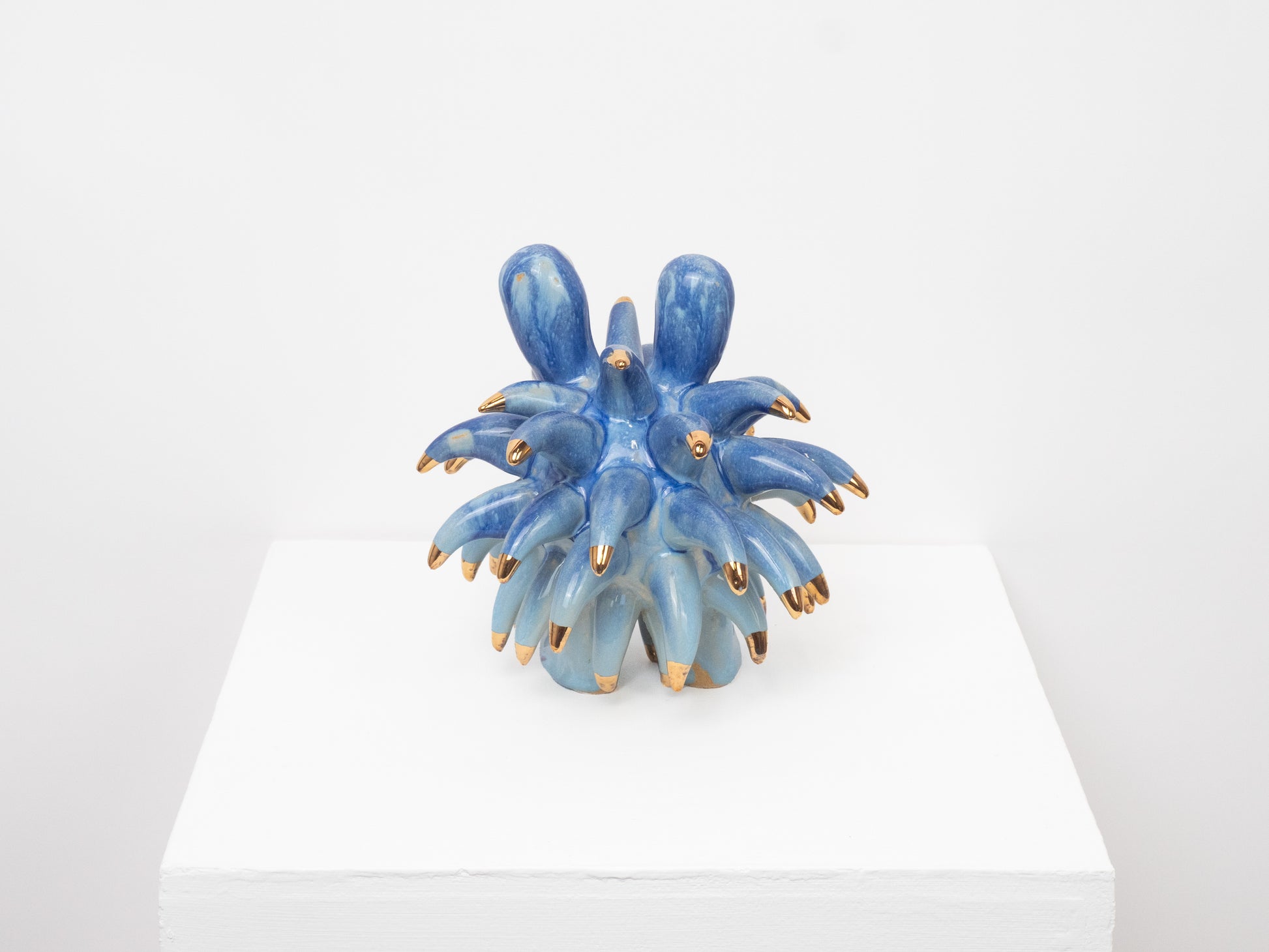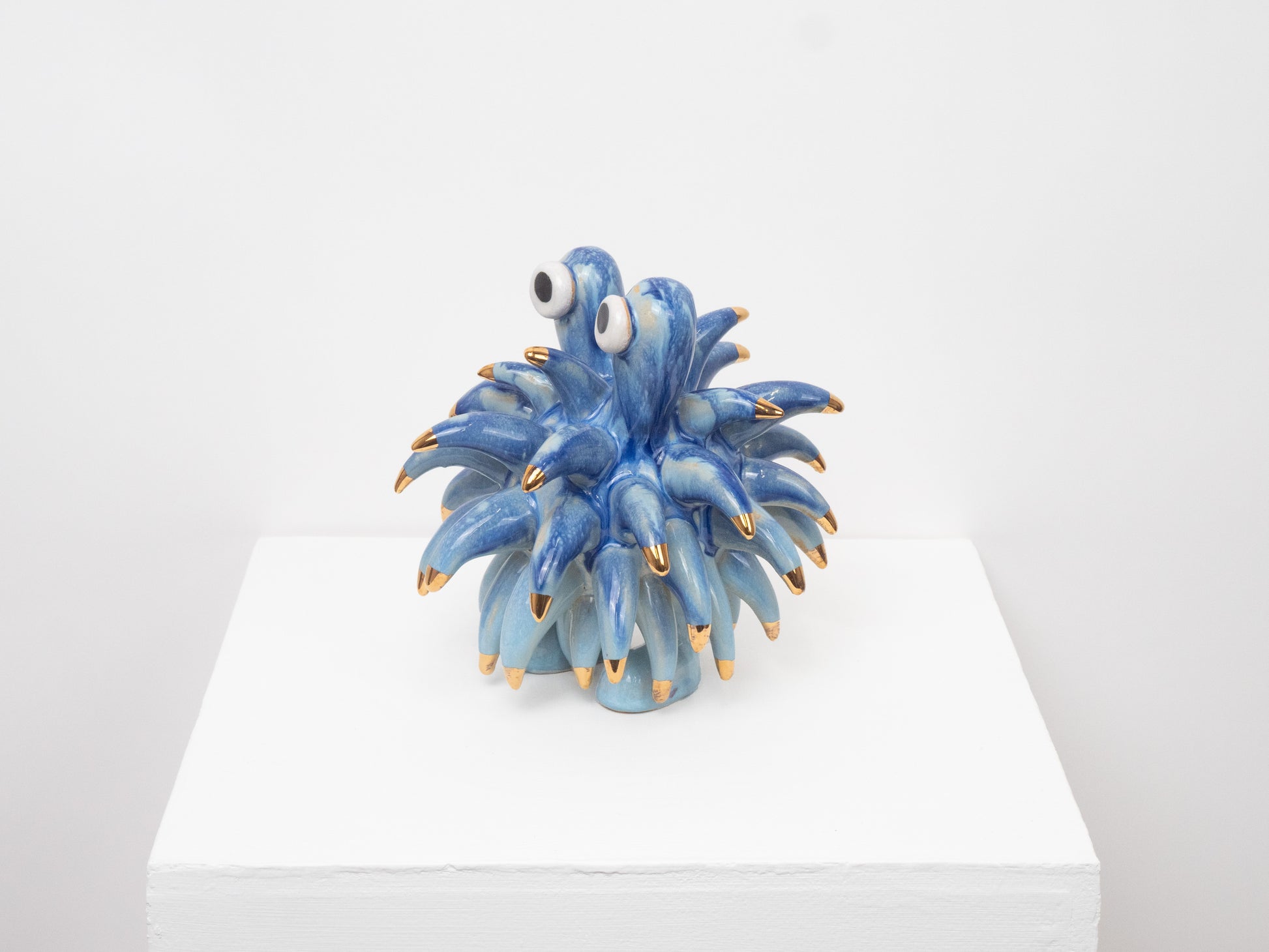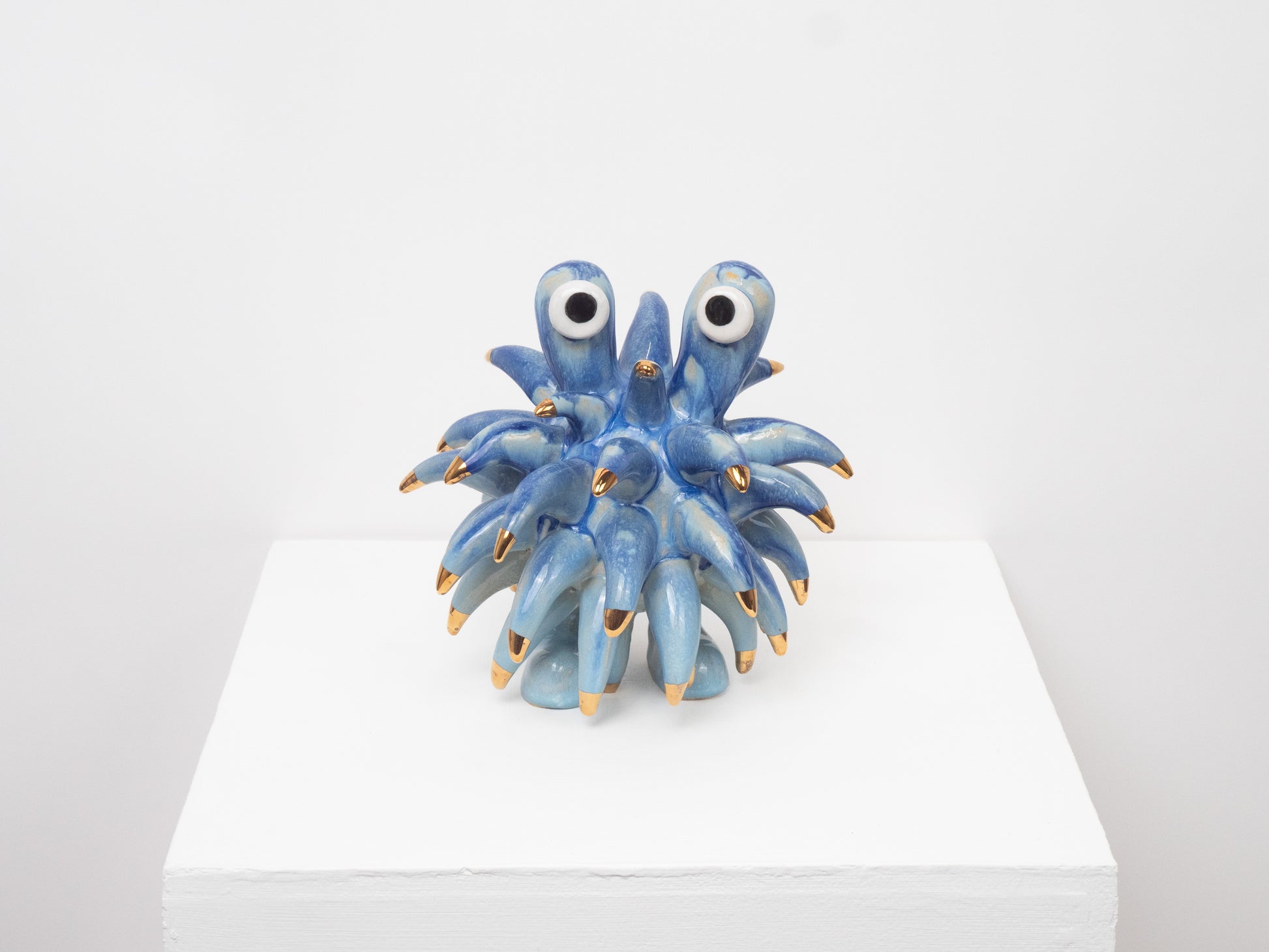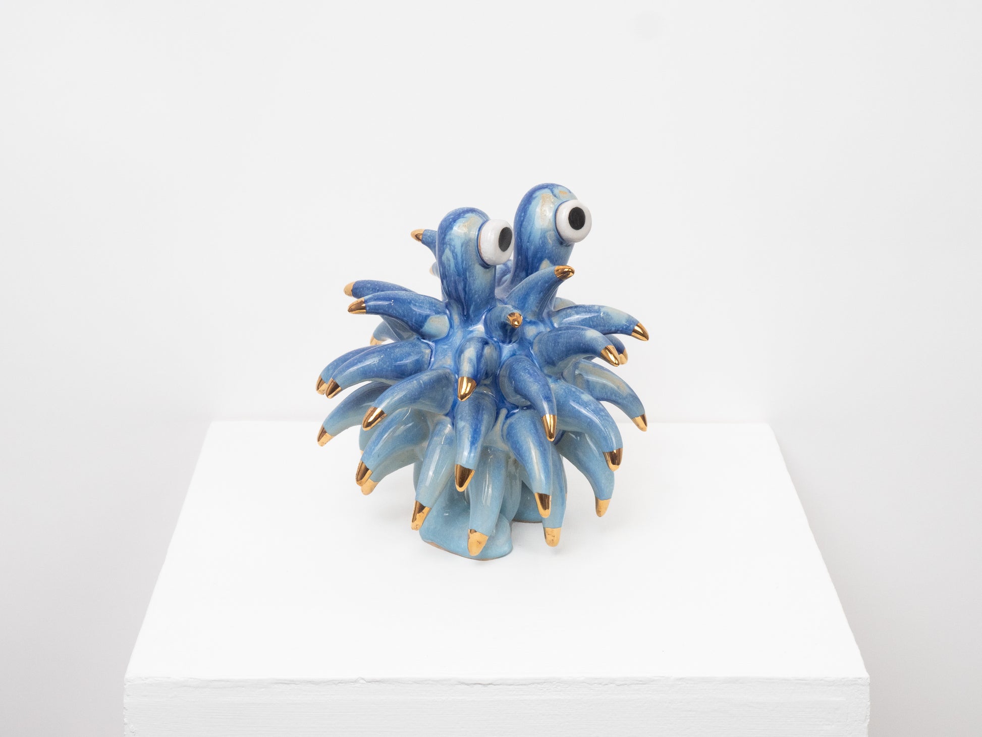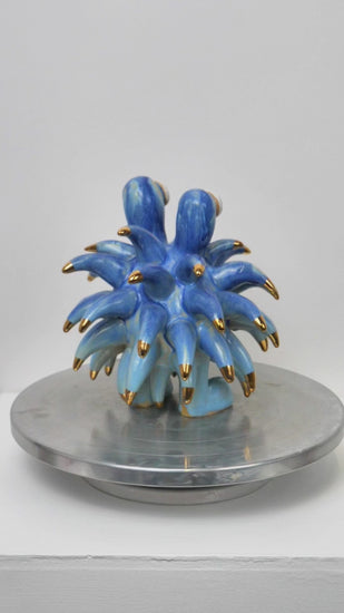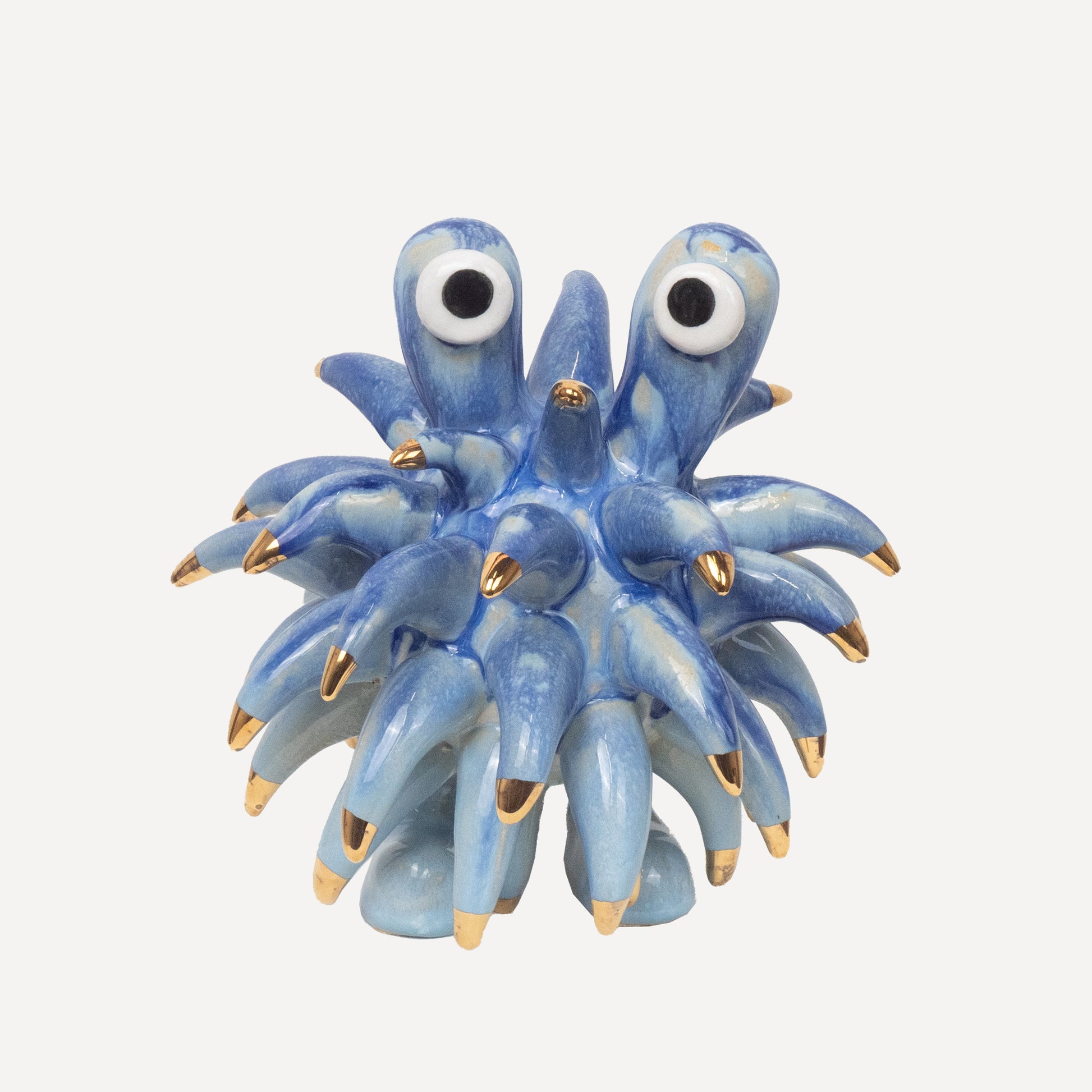 The Dinky Devin is a hand-built ceramic sculpture covered with a spiky texture. The 'Twilight' glaze has been specially created at Hannah Simpson Studio and gives the monster a unique mixed blue appearance. Each of the tips has been decorated with a 24 karat gold lustre, giving Dinky Devin a little bit of magic.