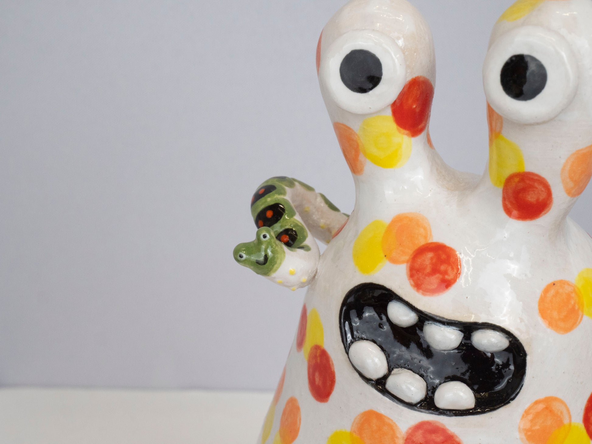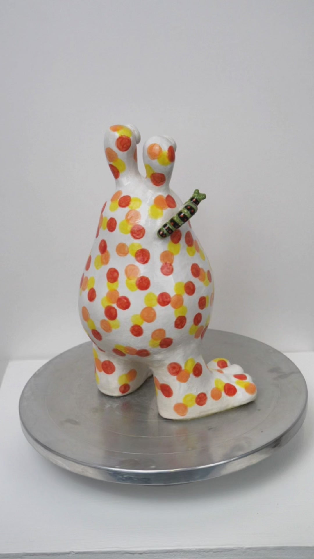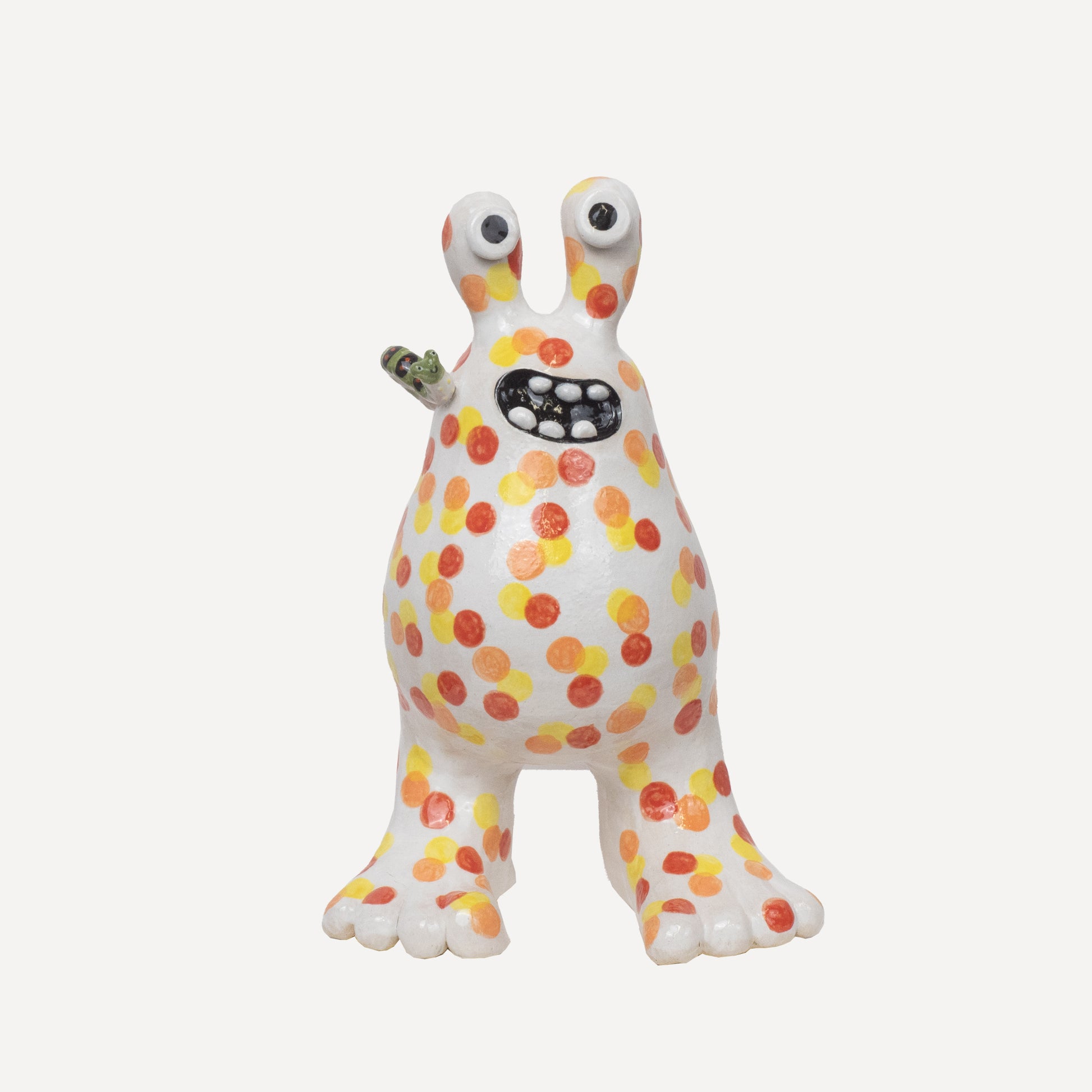 The 'Fiona' was designed as a symbol of hope and positivity. This 'Fiona' is glossy with a yellow and orange polkadot design. She has a cute little caterpillar friend on her shoulder.