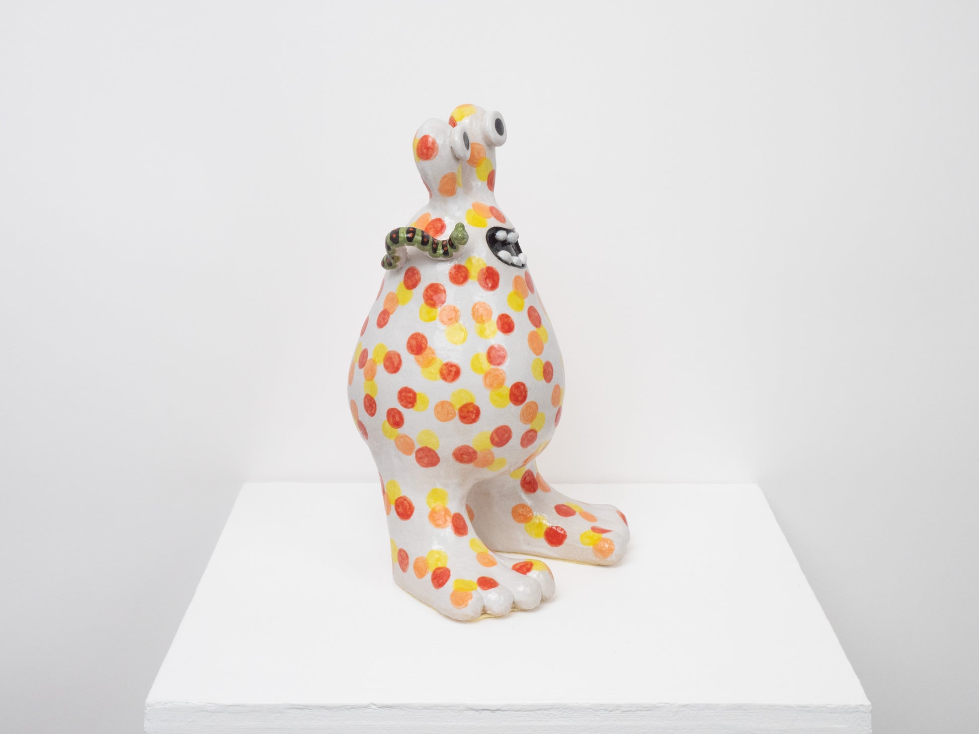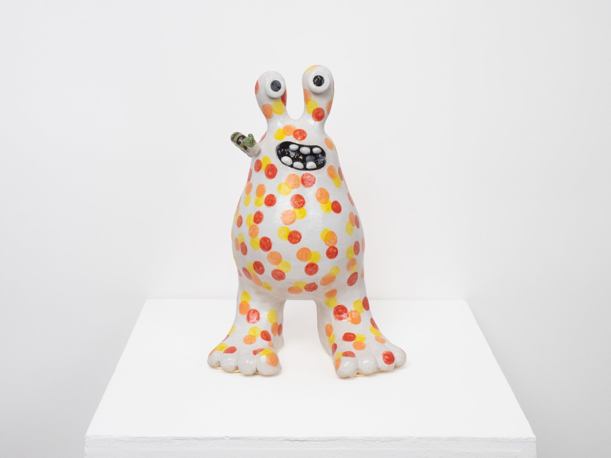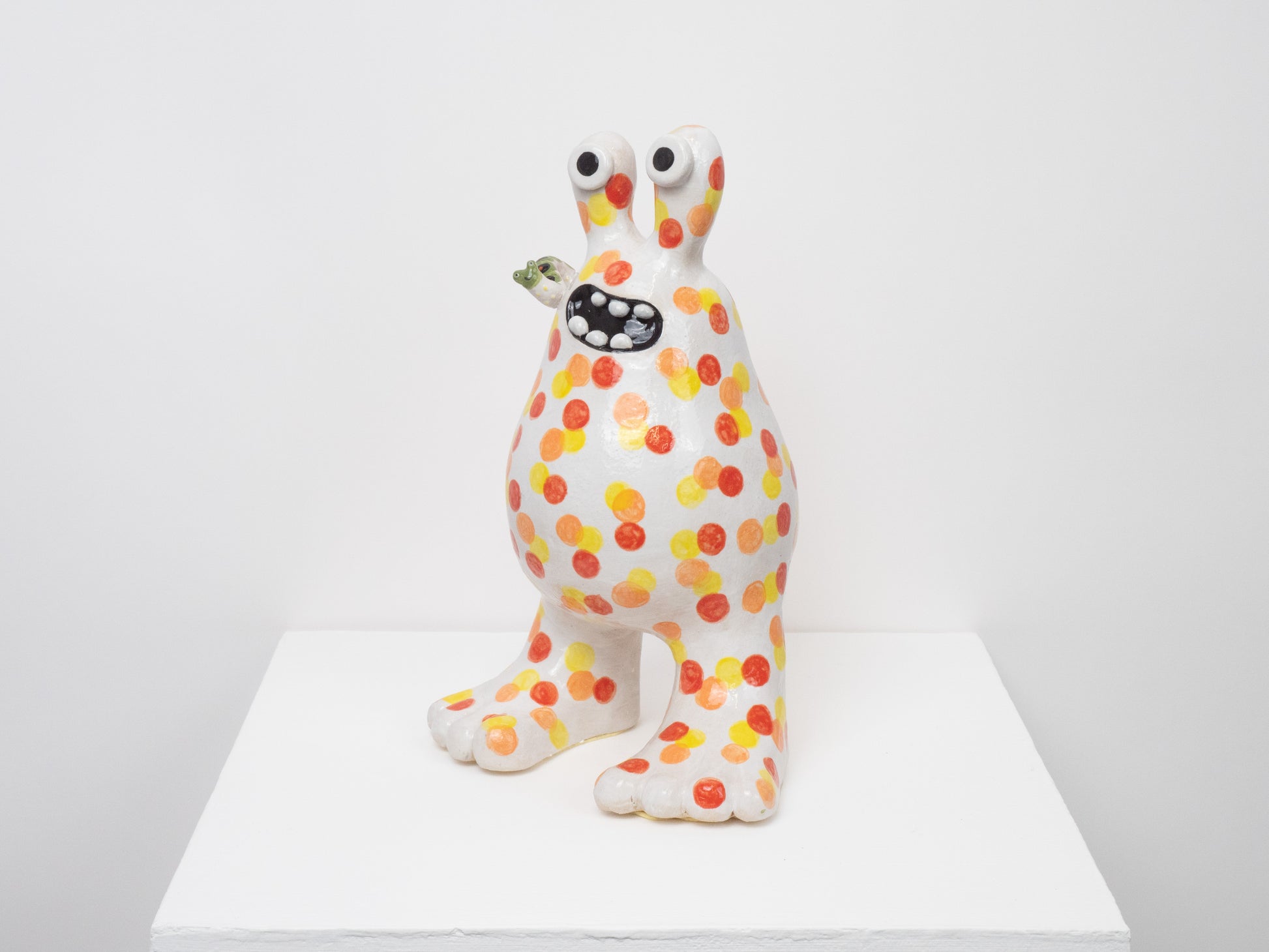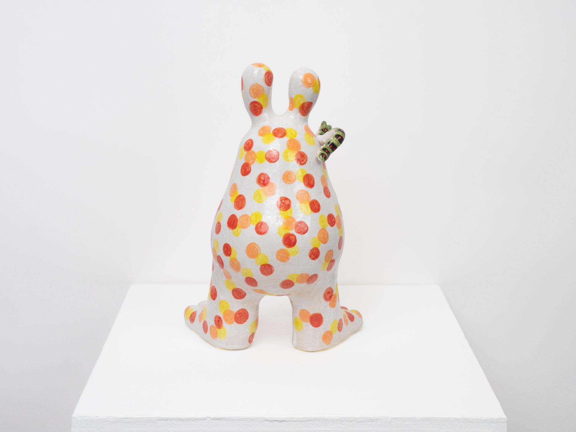 The 'Fiona' was designed as a symbol of hope and positivity. This 'Fiona' is glossy with a yellow and orange polkadot design. She has a cute little caterpillar friend on her shoulder.