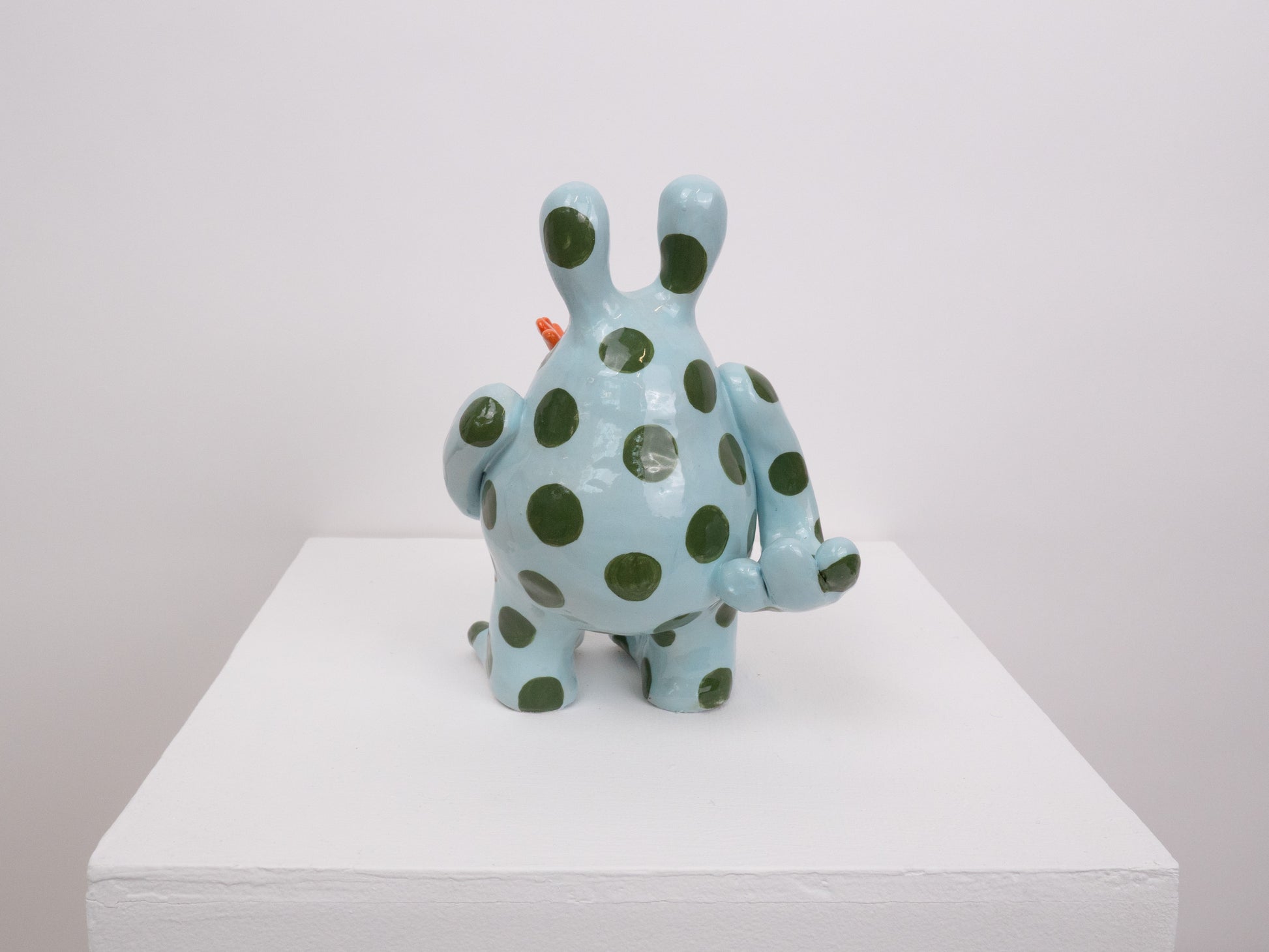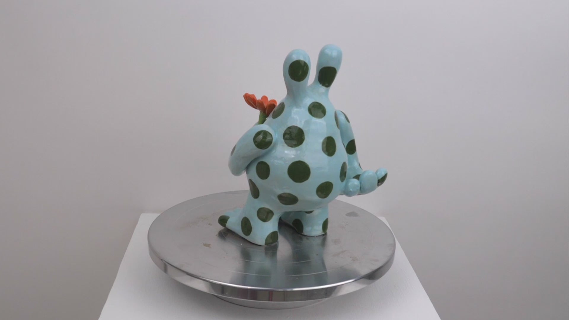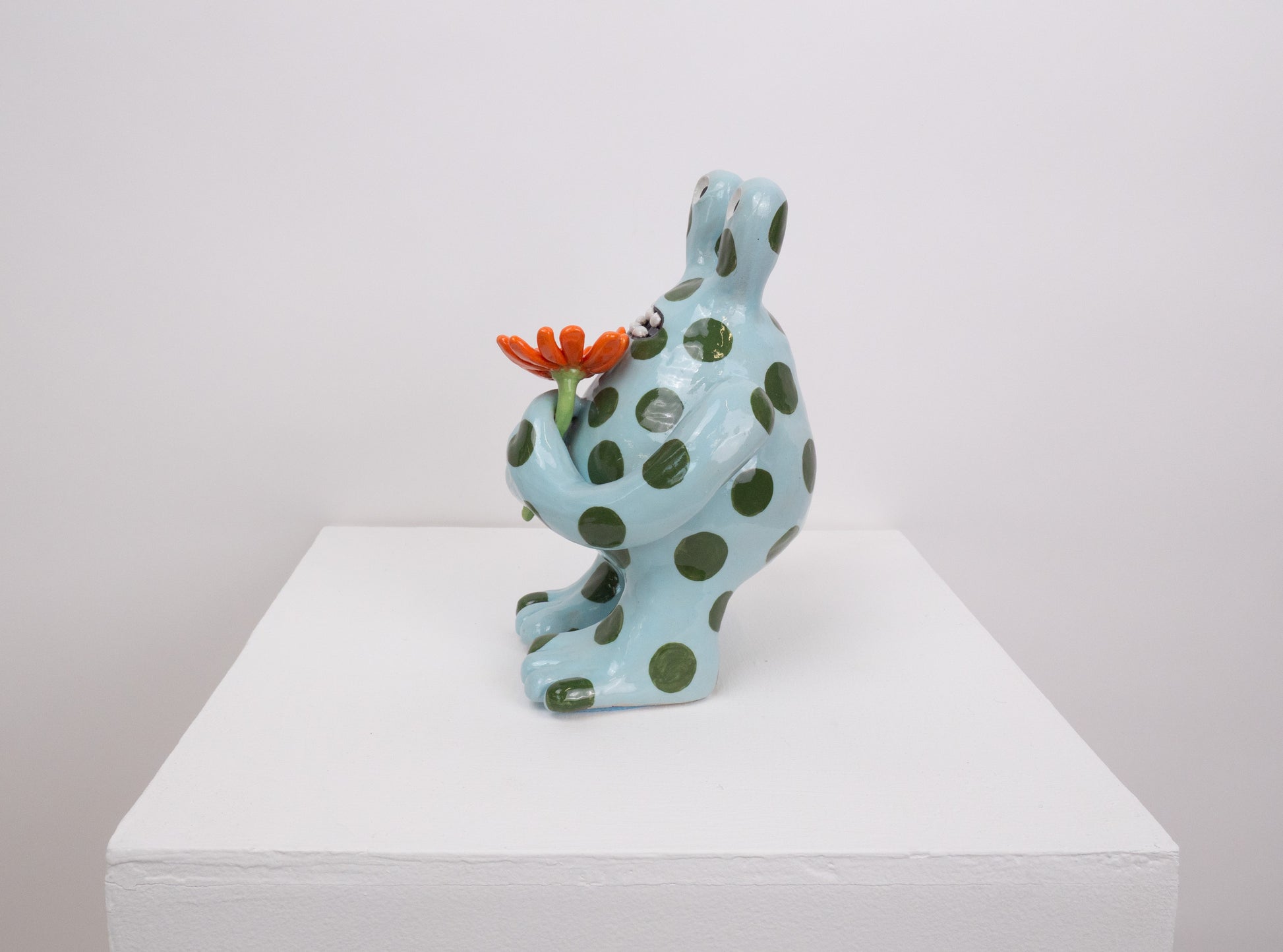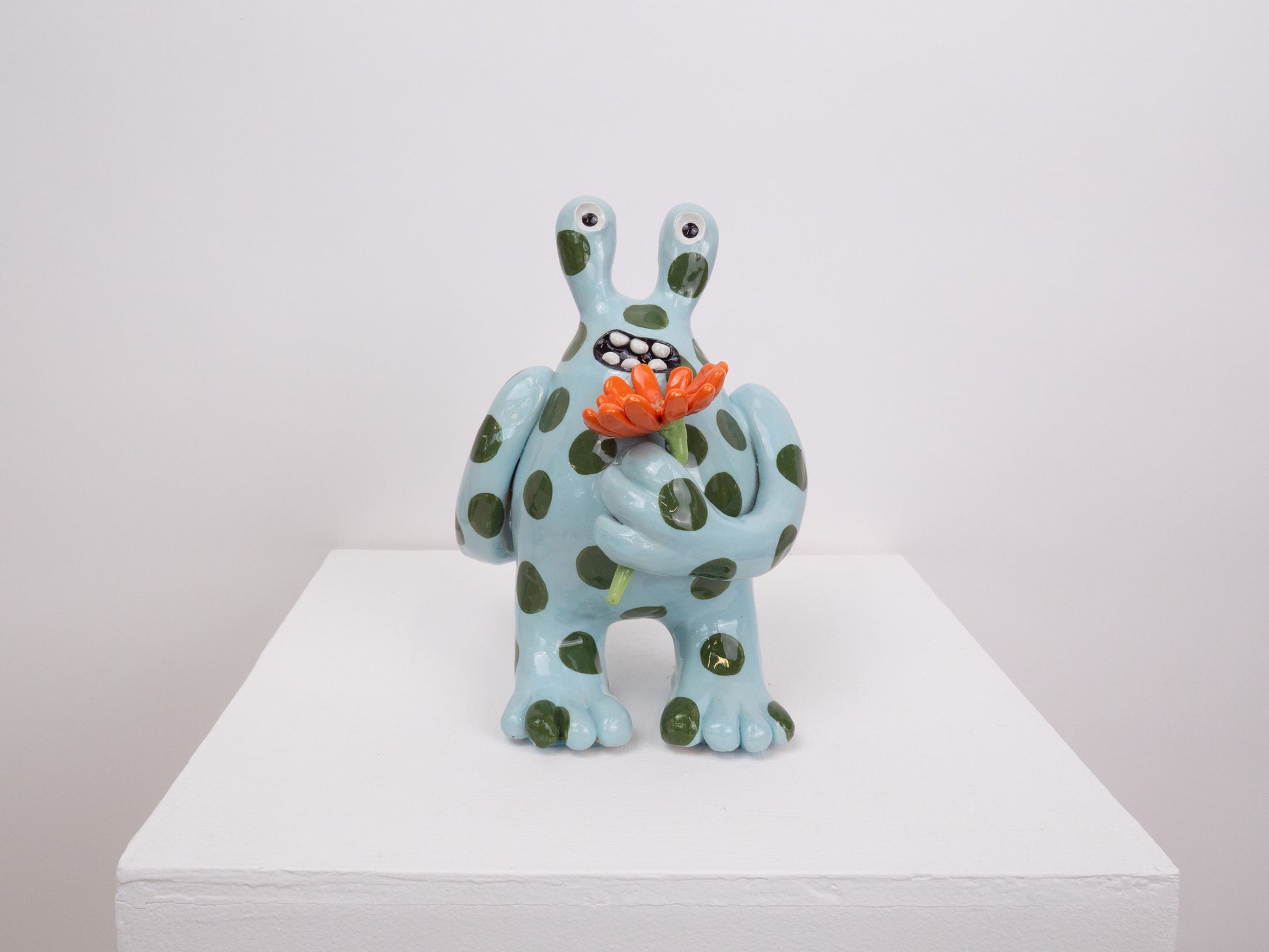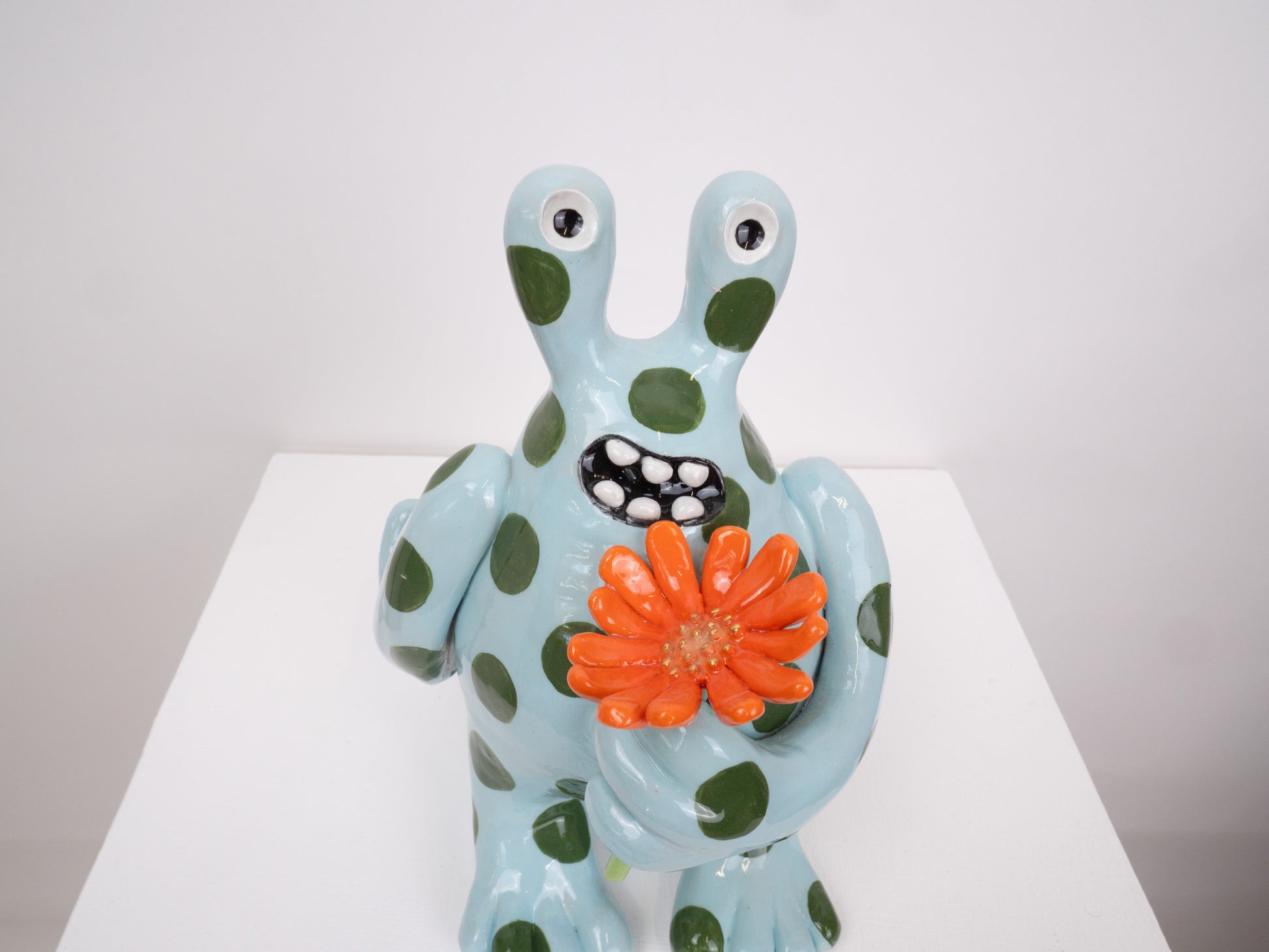The 'Fiona' monster appears to be presenting you with a flower. She was designed as a symbol of hope and positivity. This 'Fiona' is glossy and has a light blue base with dark green spots layered on top.
