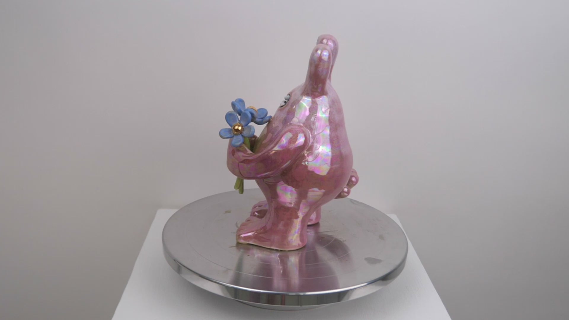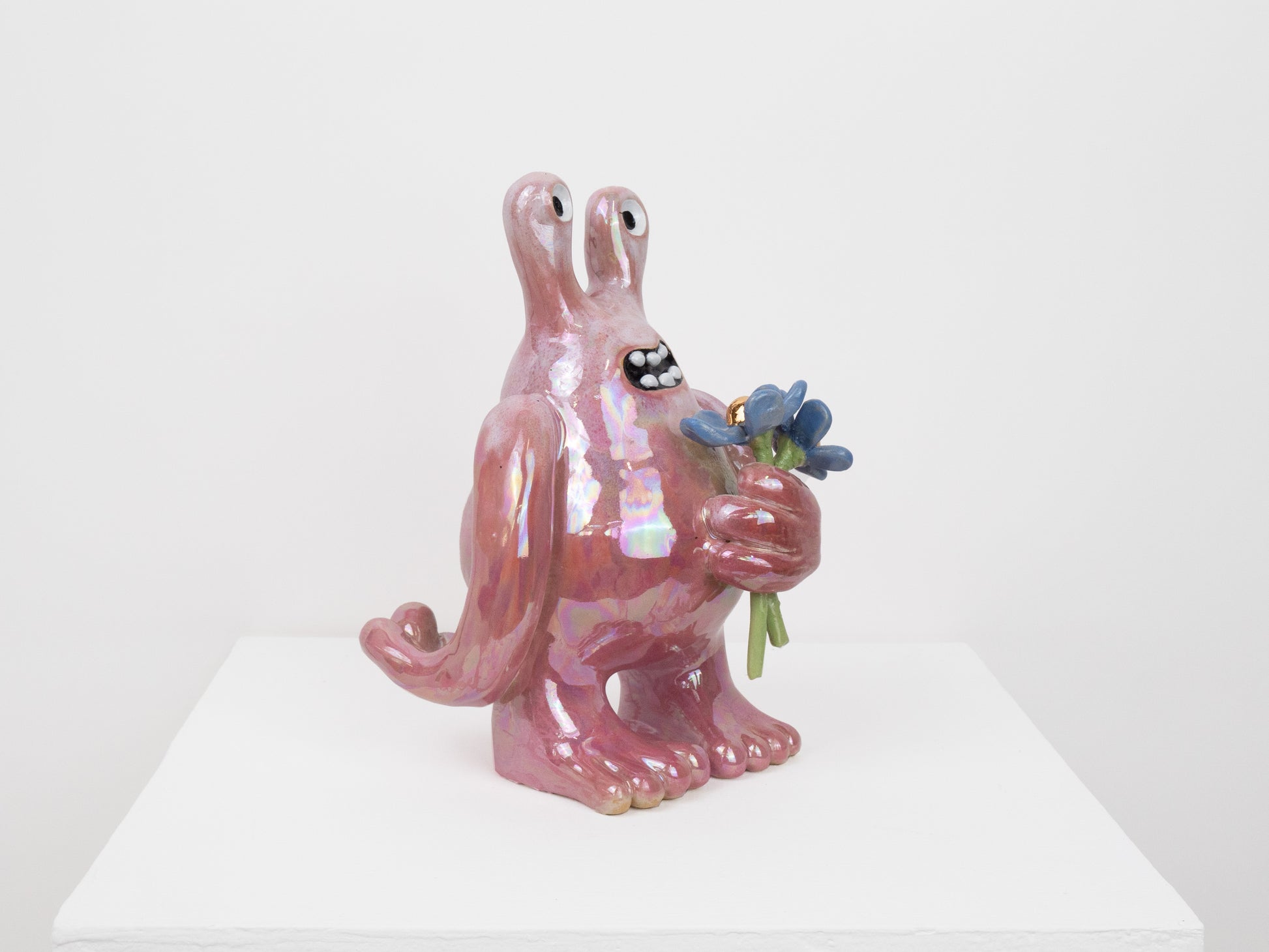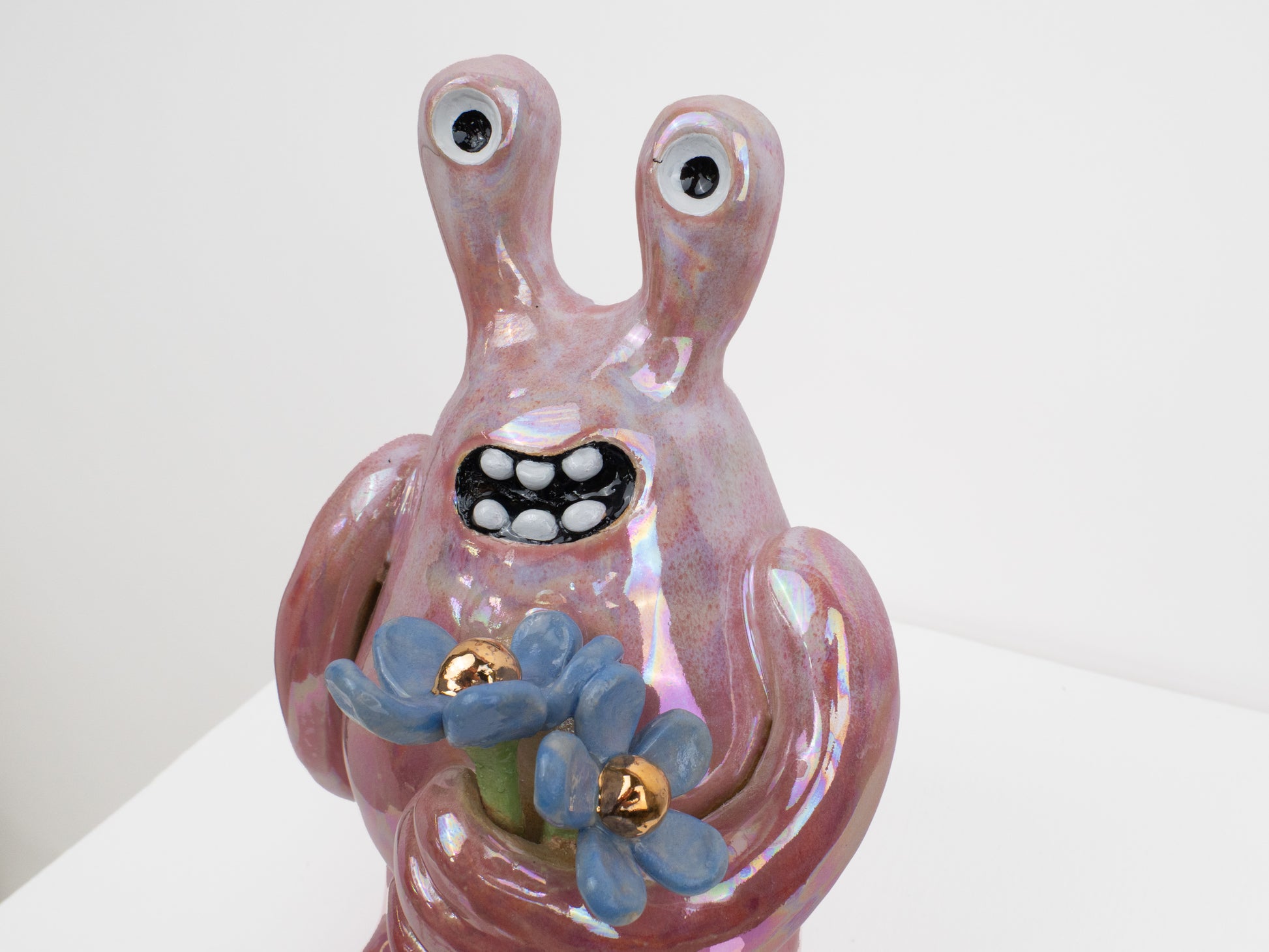 The 'Fiona' monster appears to be presenting you with a flower. She was designed as a symbol of hope and positivity. Fiona's surface is pink and white with a pearl lustre on top, to give it an iridescent finish. The flowers have got gold lustre in the centre.