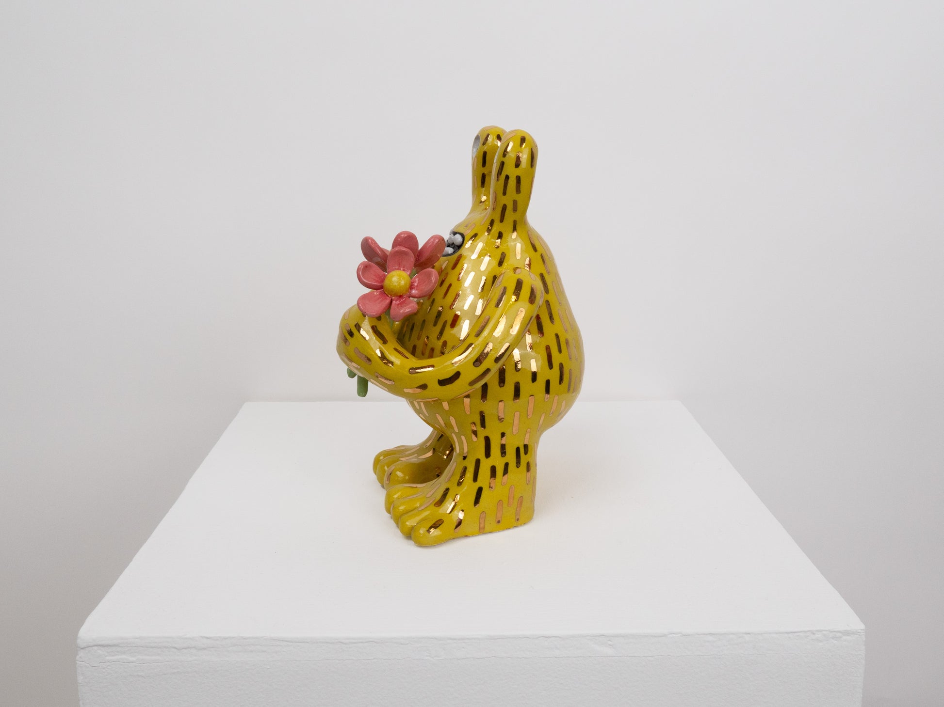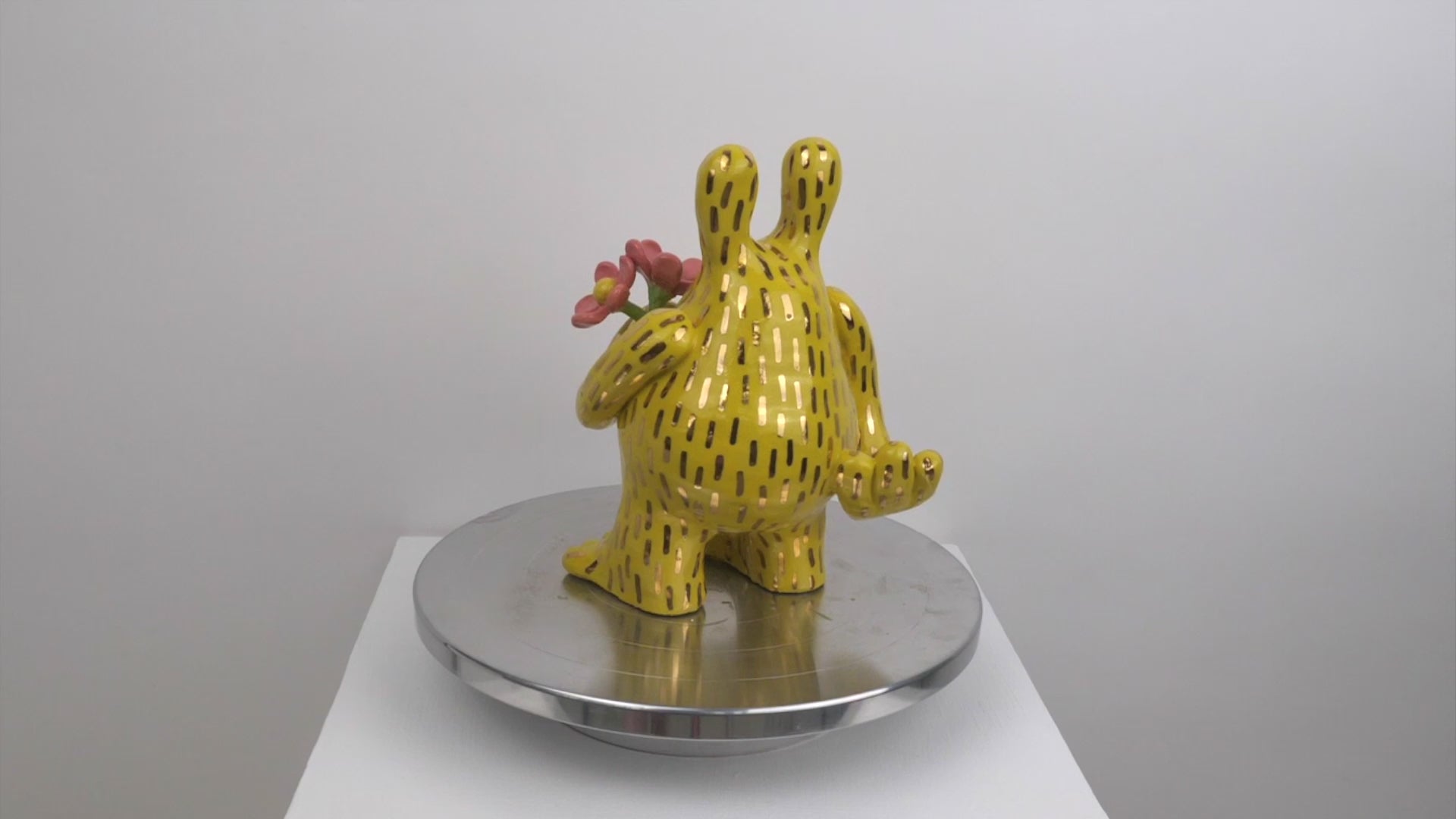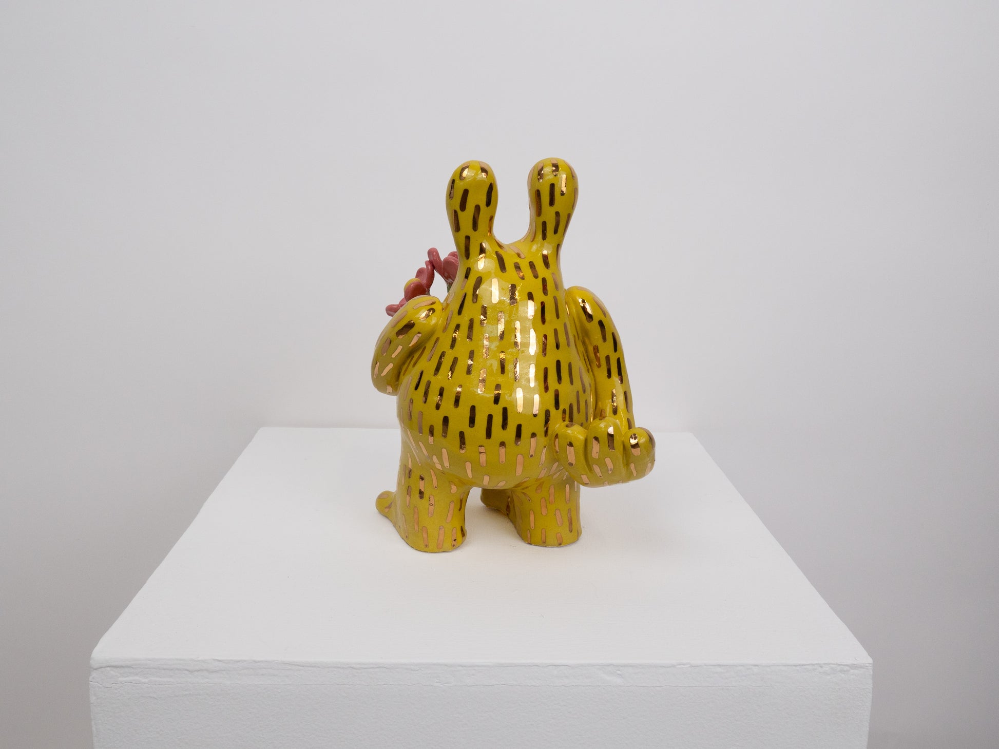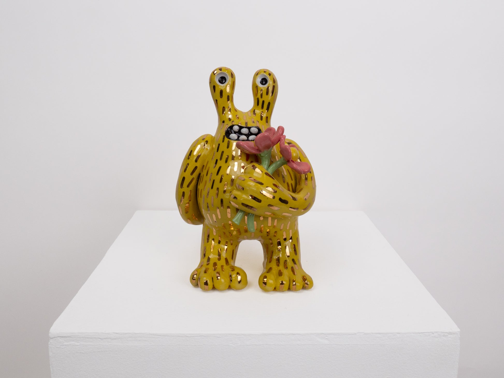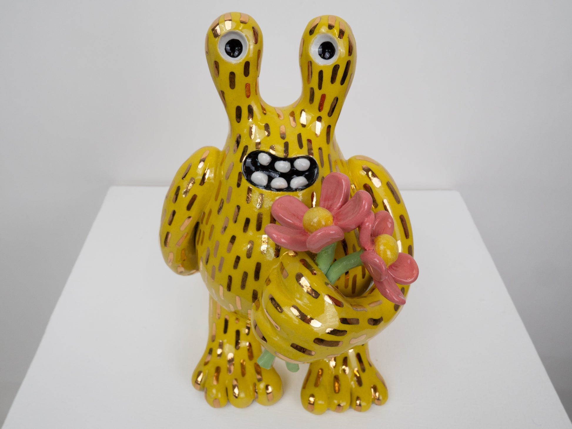 The 'Fiona' monster appears to be presenting you with a flower. She was designed as a symbol of hope and positivity. This 'Fiona' has a glossy yellow base with a gold dash pattern layered on top.