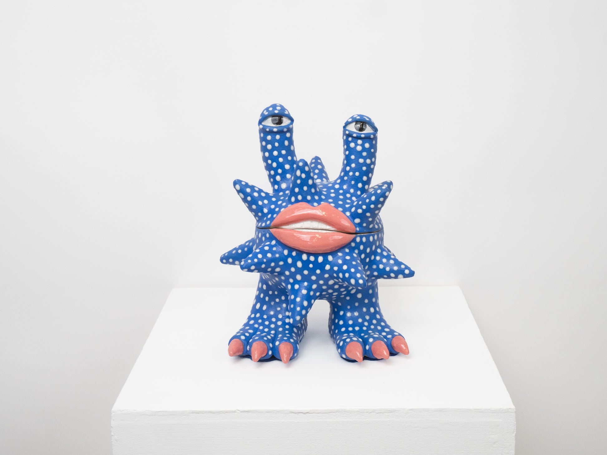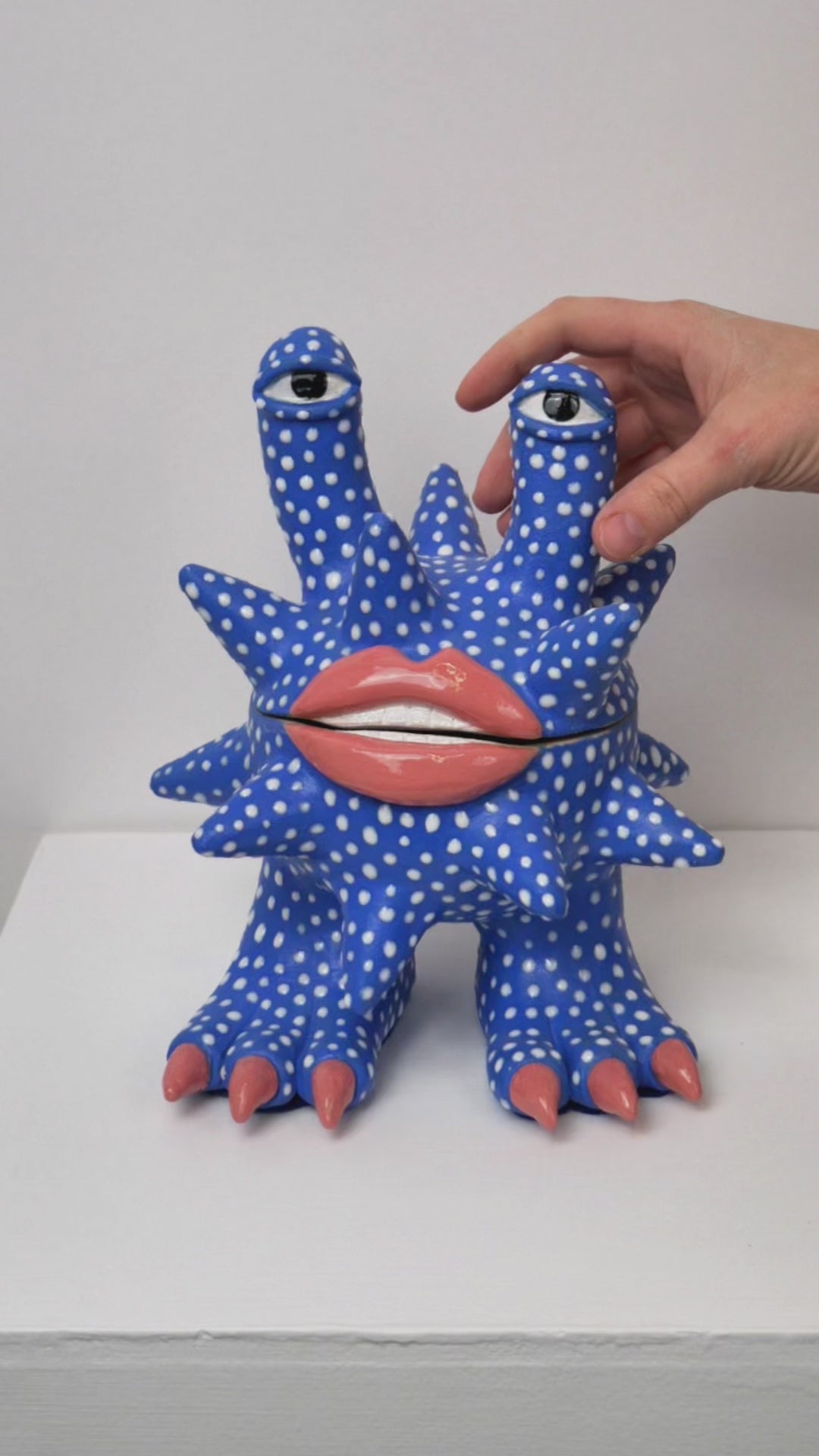 The Invader is a hand-built ceramic pot designed to store trinkets, sweets or any other goodies inside of it. The contrast between the blue and pink glazes creates a striking appearance.