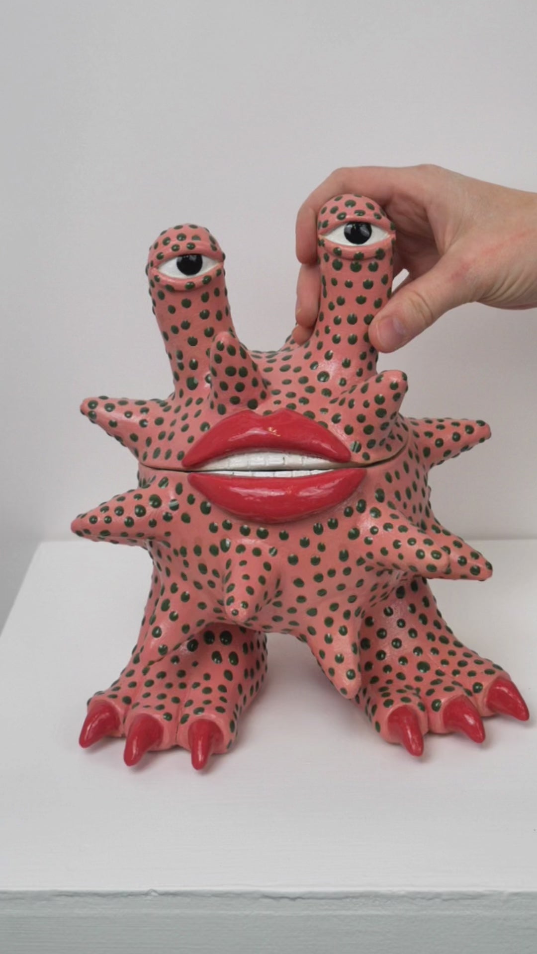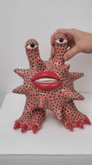The Invader is a hand-built ceramic pot designed to store trinkets, sweets or any other goodies inside of it. The contrast between the pink and green glazes creates a striking appearance.