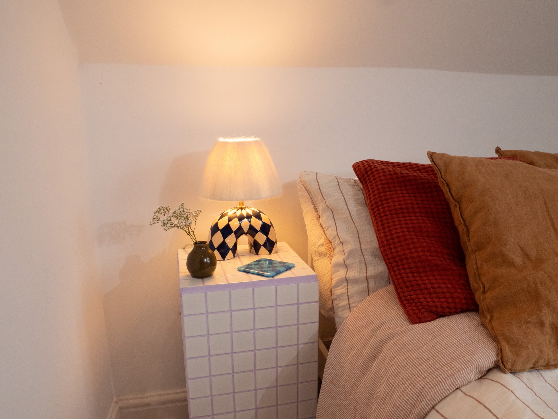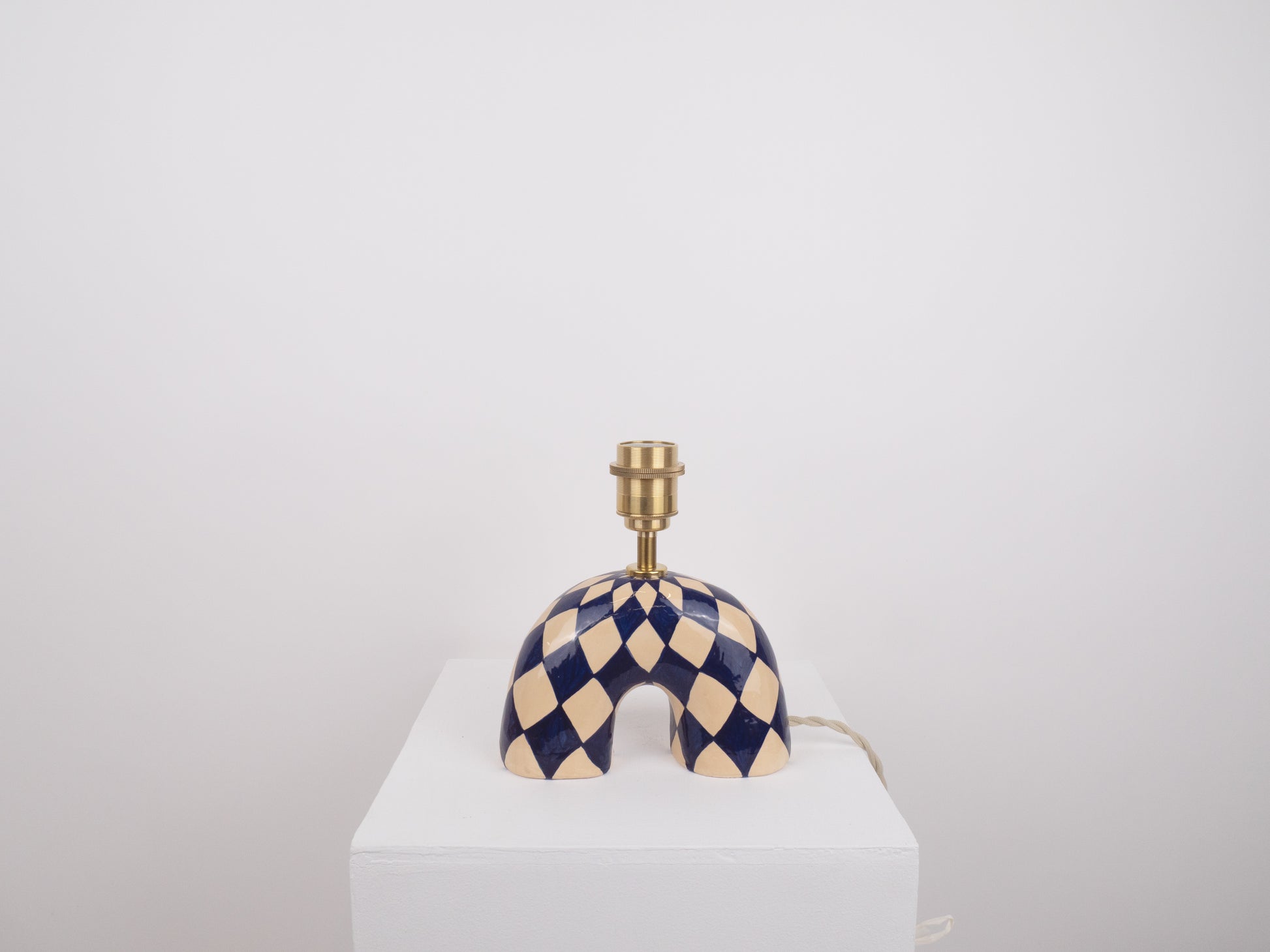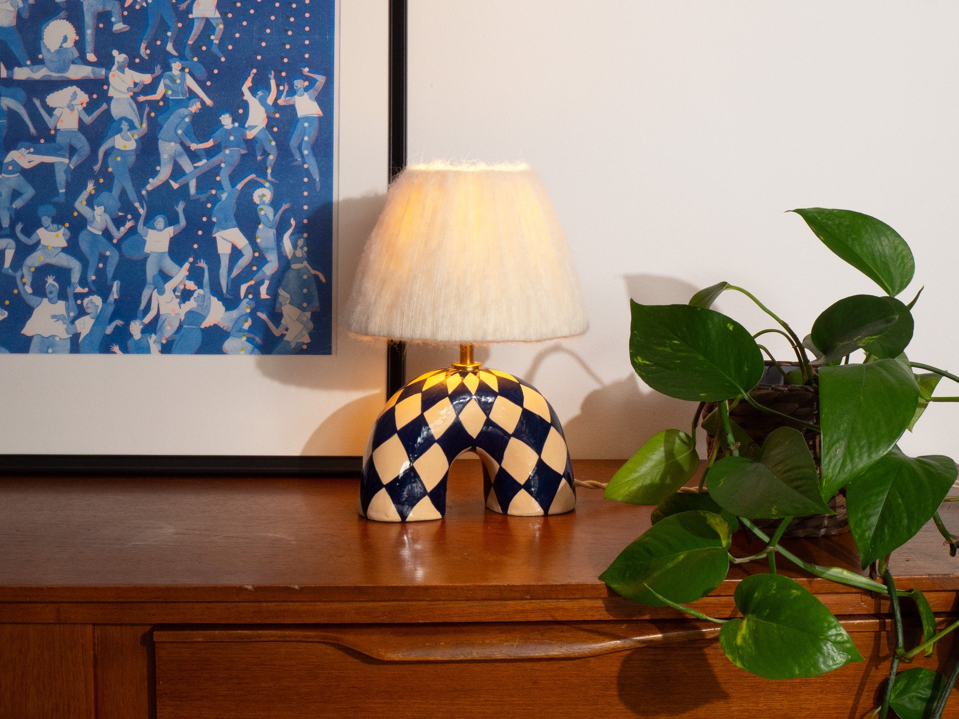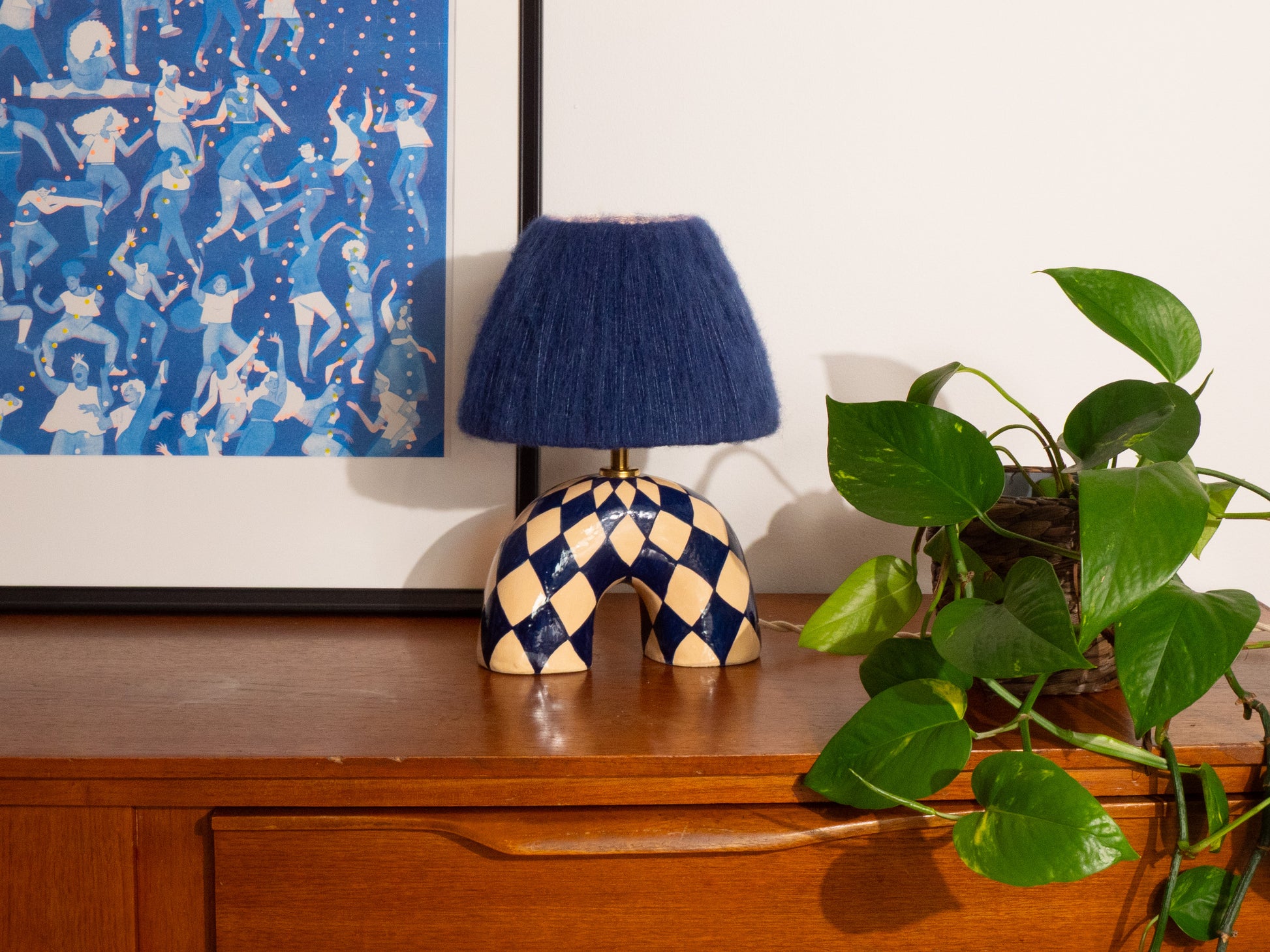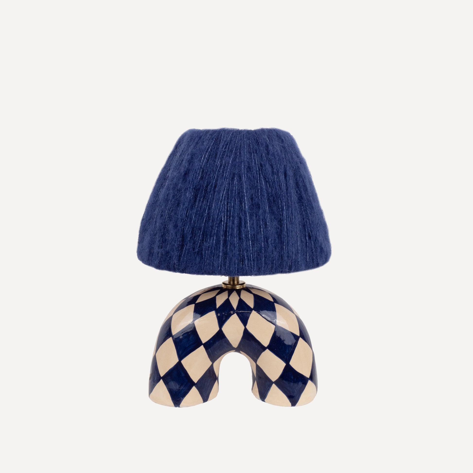 A playful yet refined addition to any room, this handmade ceramic lamp features a sculptural arched base hand-painted in a bold cream and navy diamond pattern. The glossy glaze enhances the richness of the colours and gives the surface a smooth, light-catching finish. It’s paired with our signature wool lampshade in a matching deep blue colour, whose soft texture contrasts beautifully with the shine of the ceramic base.