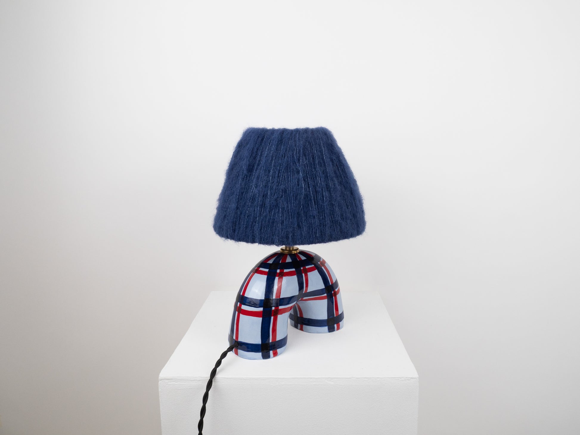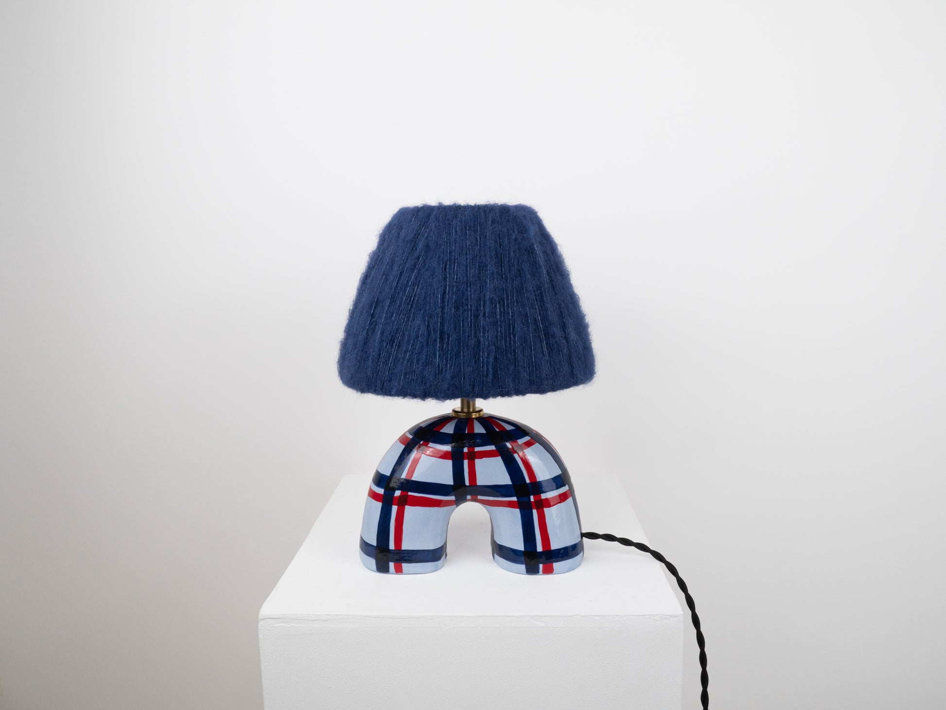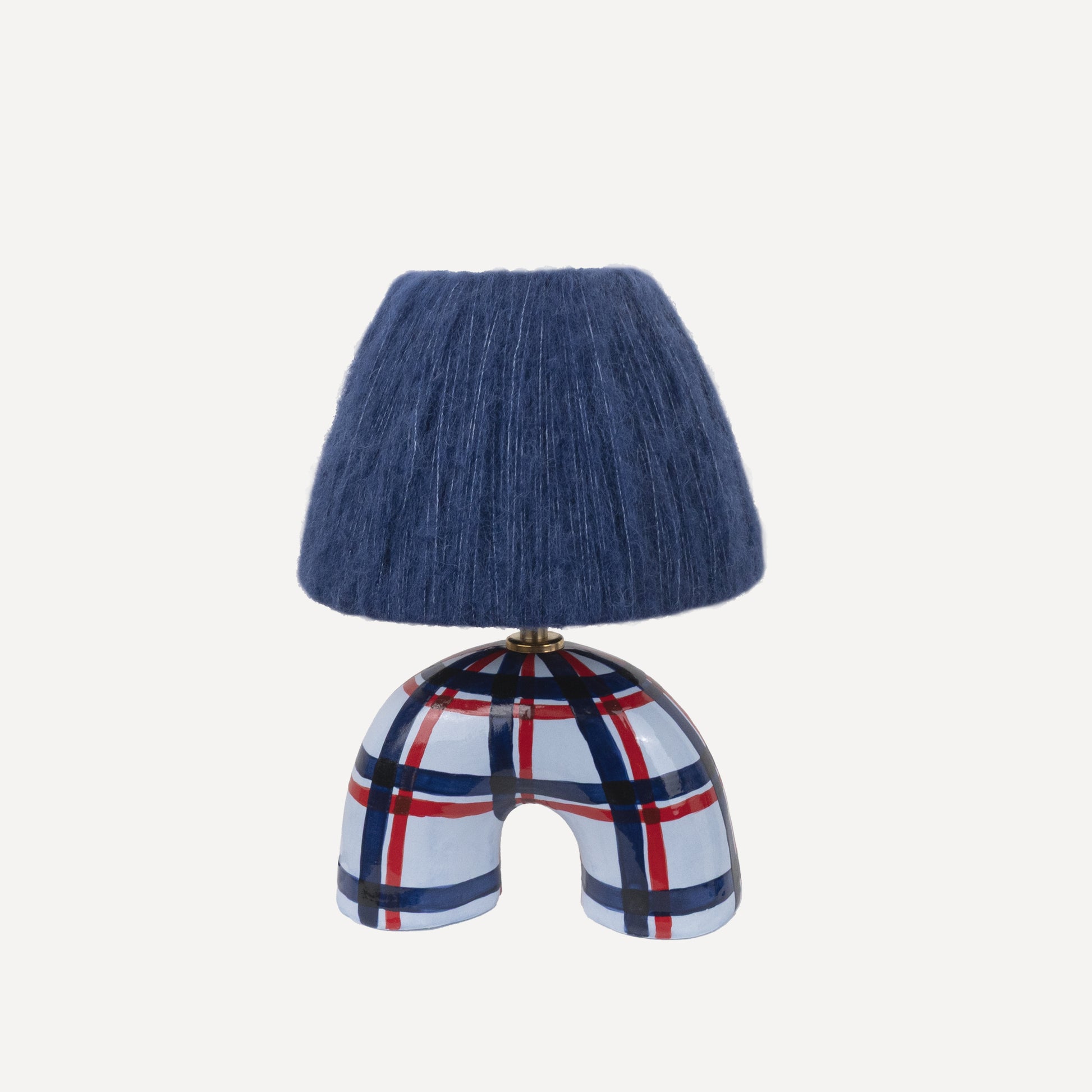 A playful yet refined addition to any room, this handmade ceramic lamp features a sculptural arched base hand-painted in a light blue, navy and red gingham pattern. The glossy glaze enhances the richness of the colours and gives the surface a smooth, light-catching finish. It’s paired with our signature wool lampshade in a matching deep blue colour, whose soft texture contrasts beautifully with the shine of the ceramic base.