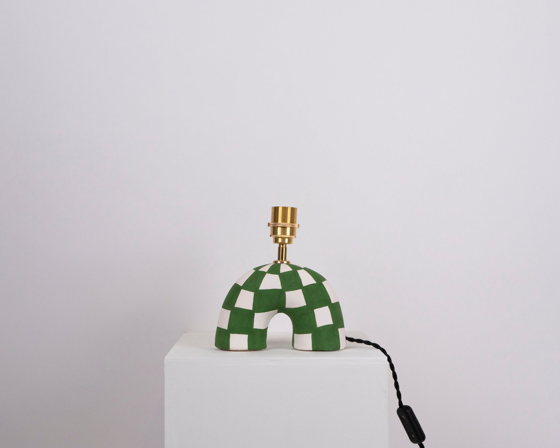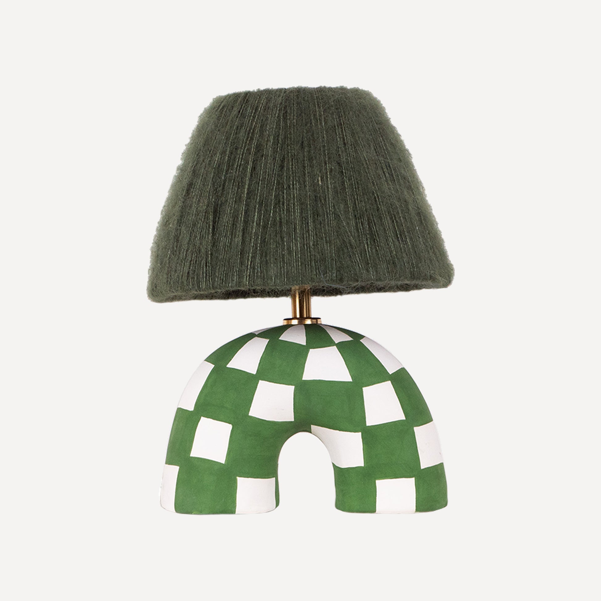 Handmade ceramic White & Green lamp base with a checkerboard pattern and matte finish paired with a matching Forest Green wool lampshade