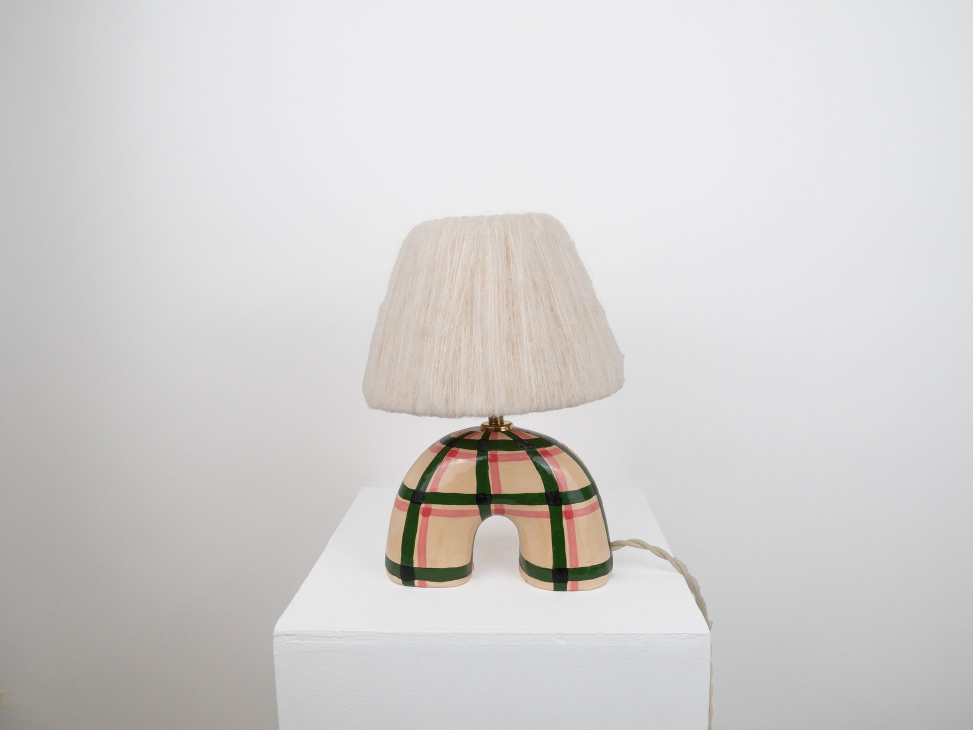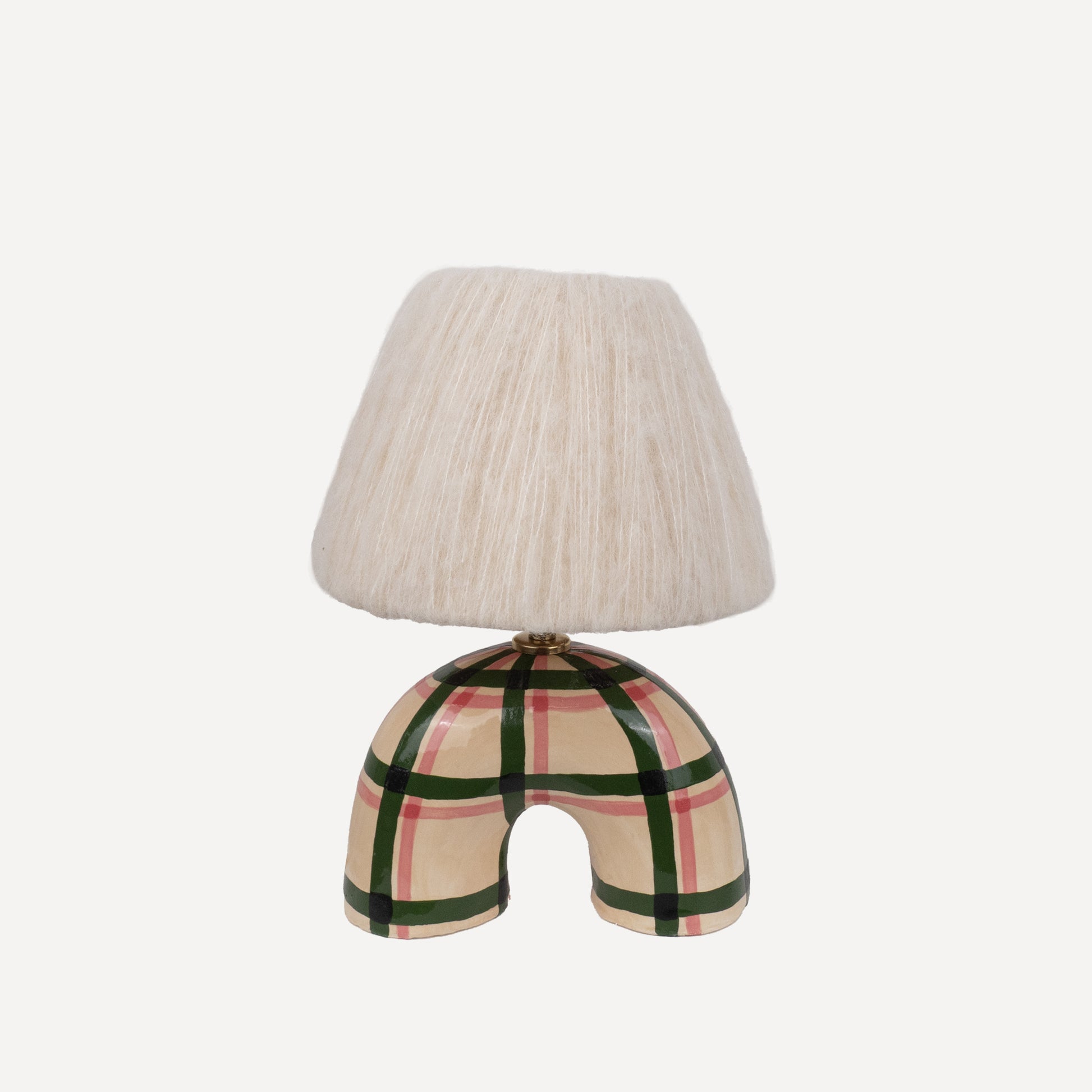A playful yet refined addition to any room, this handmade ceramic lamp features a sculptural arched base, hand-painted in cream, with pink and dark green gingham pattern. The glossy glaze enhances the richness of the colours and gives the surface a smooth, light-catching finish. It’s paired with our signature wool lampshade in a cream colour, whose soft texture contrasts beautifully with the shine of the ceramic base.