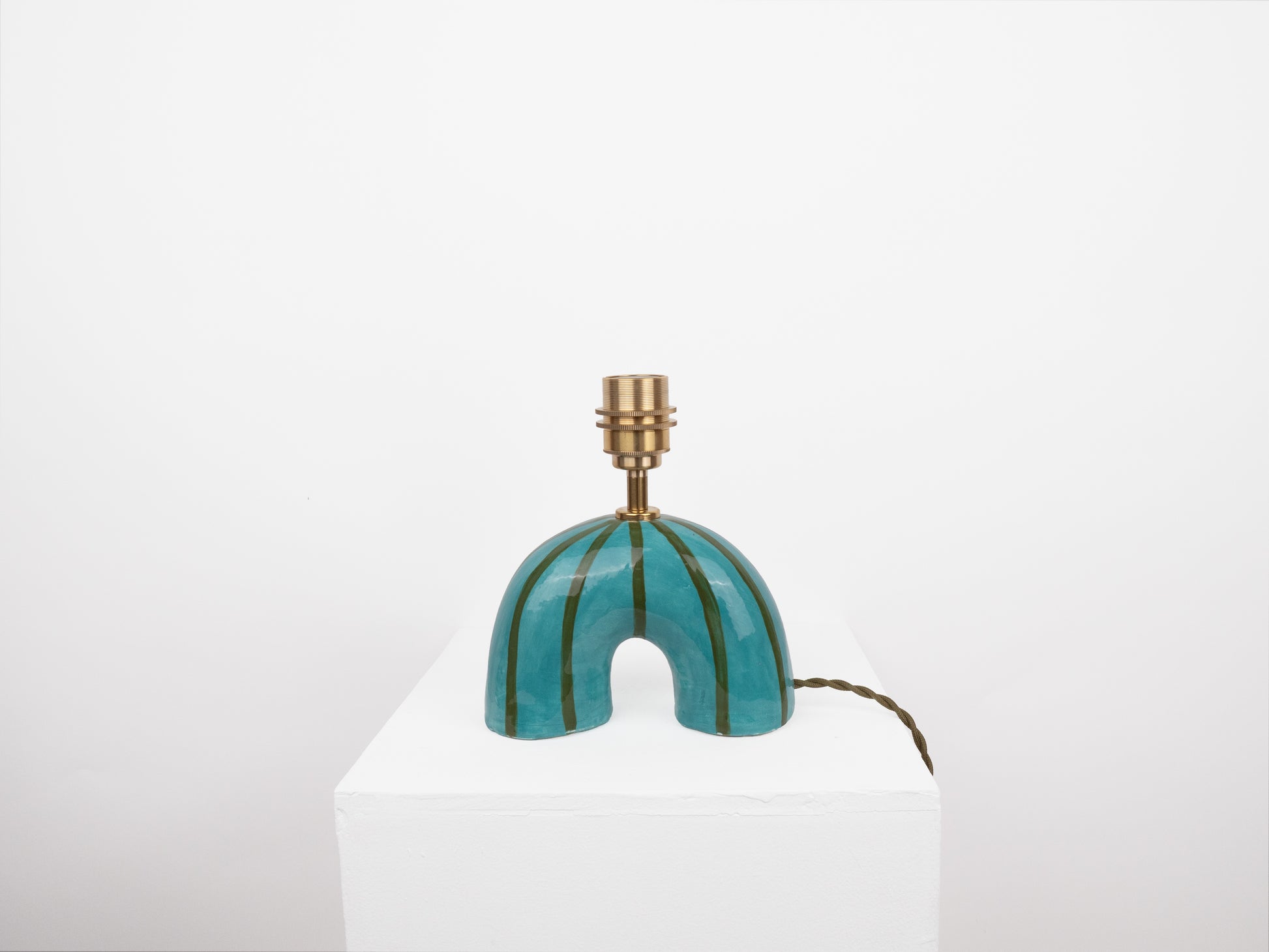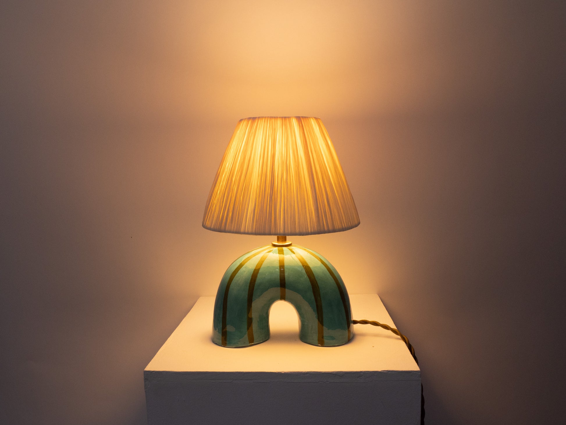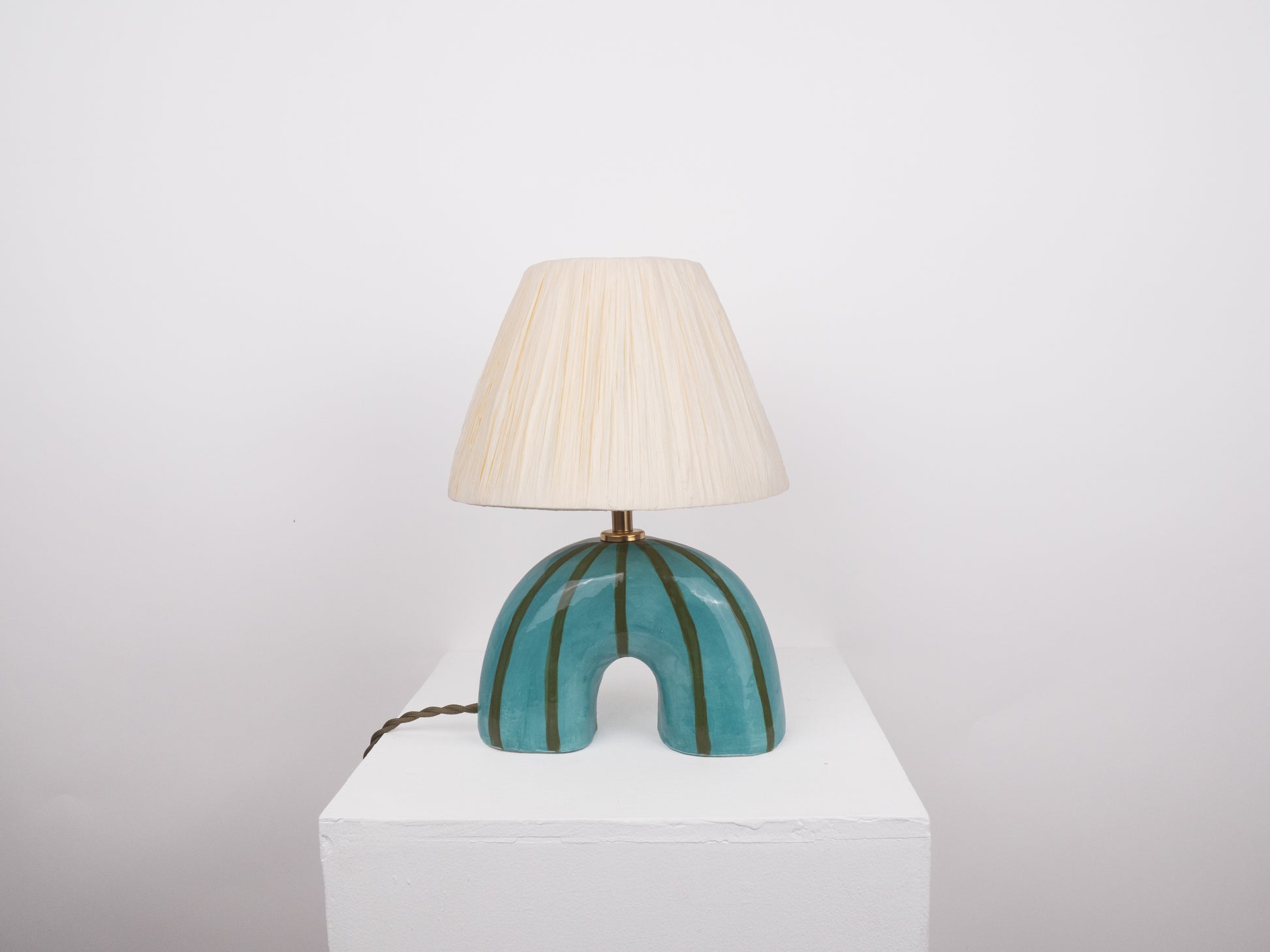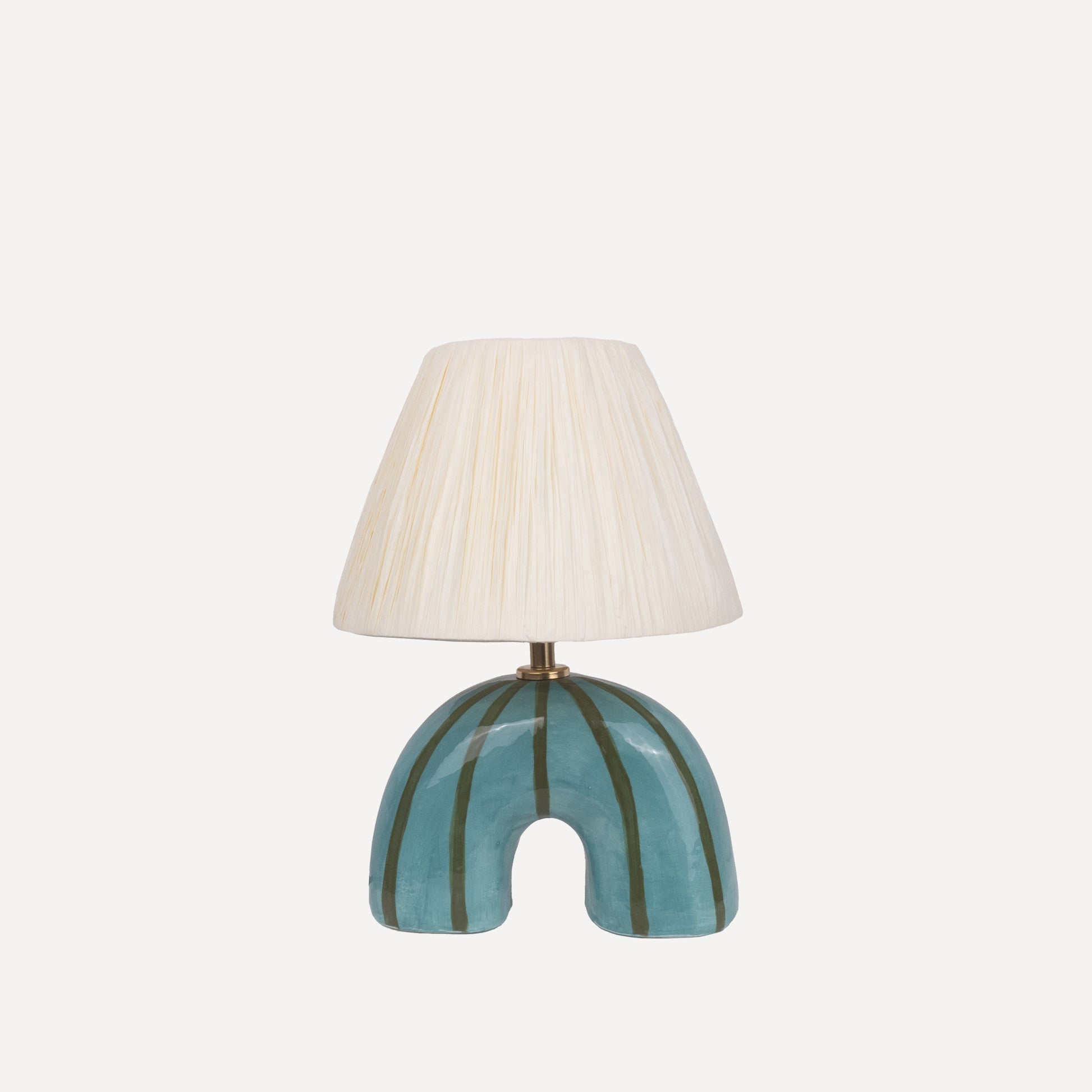 A playful yet refined addition to any room, this handmade ceramic lamp features a sculptural arched base, hand-painted in a turquoise colour , with dark green stripes. The glossy glaze enhances the richness of the colours and gives the surface a smooth, light-catching finish. It’s paired with our ivory raffia lampshade, which gives a beautiful warm glow when the lamp is lit up.