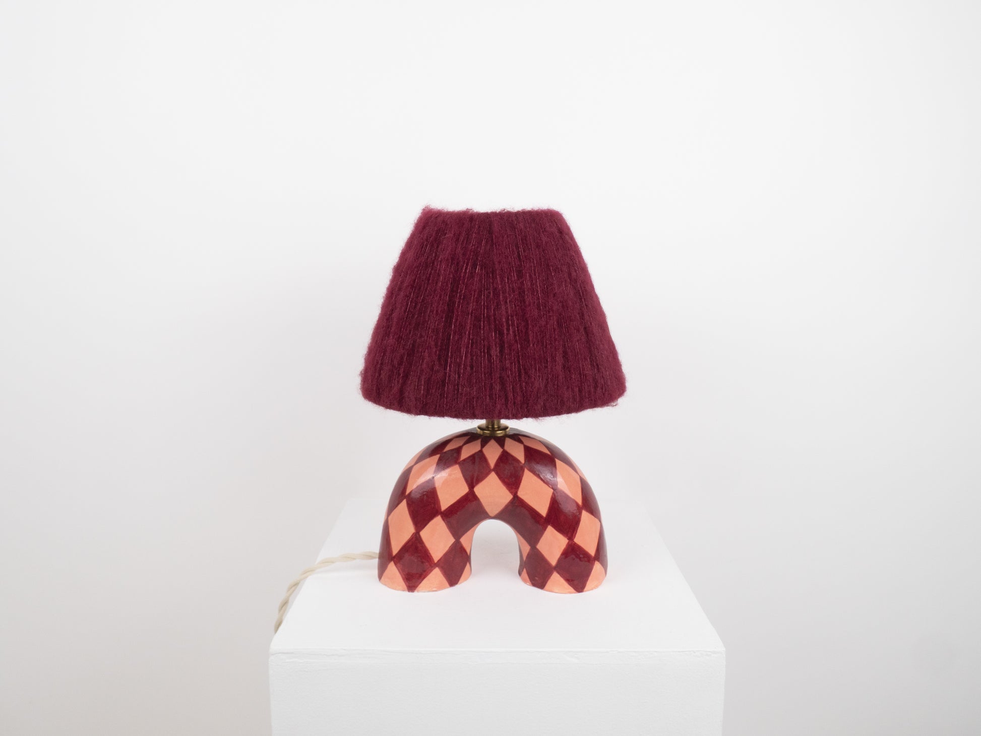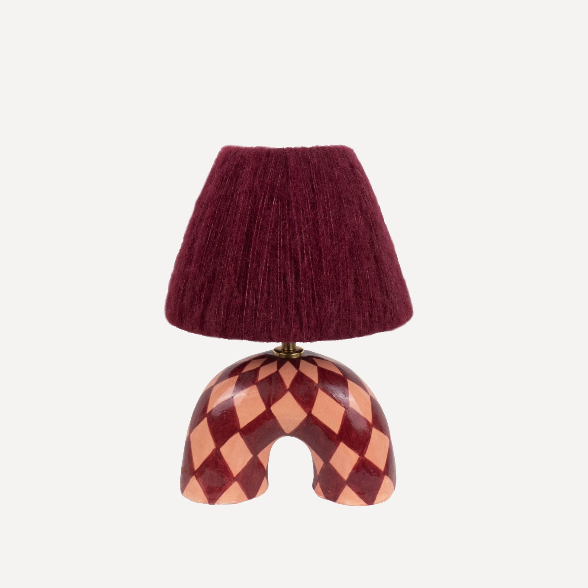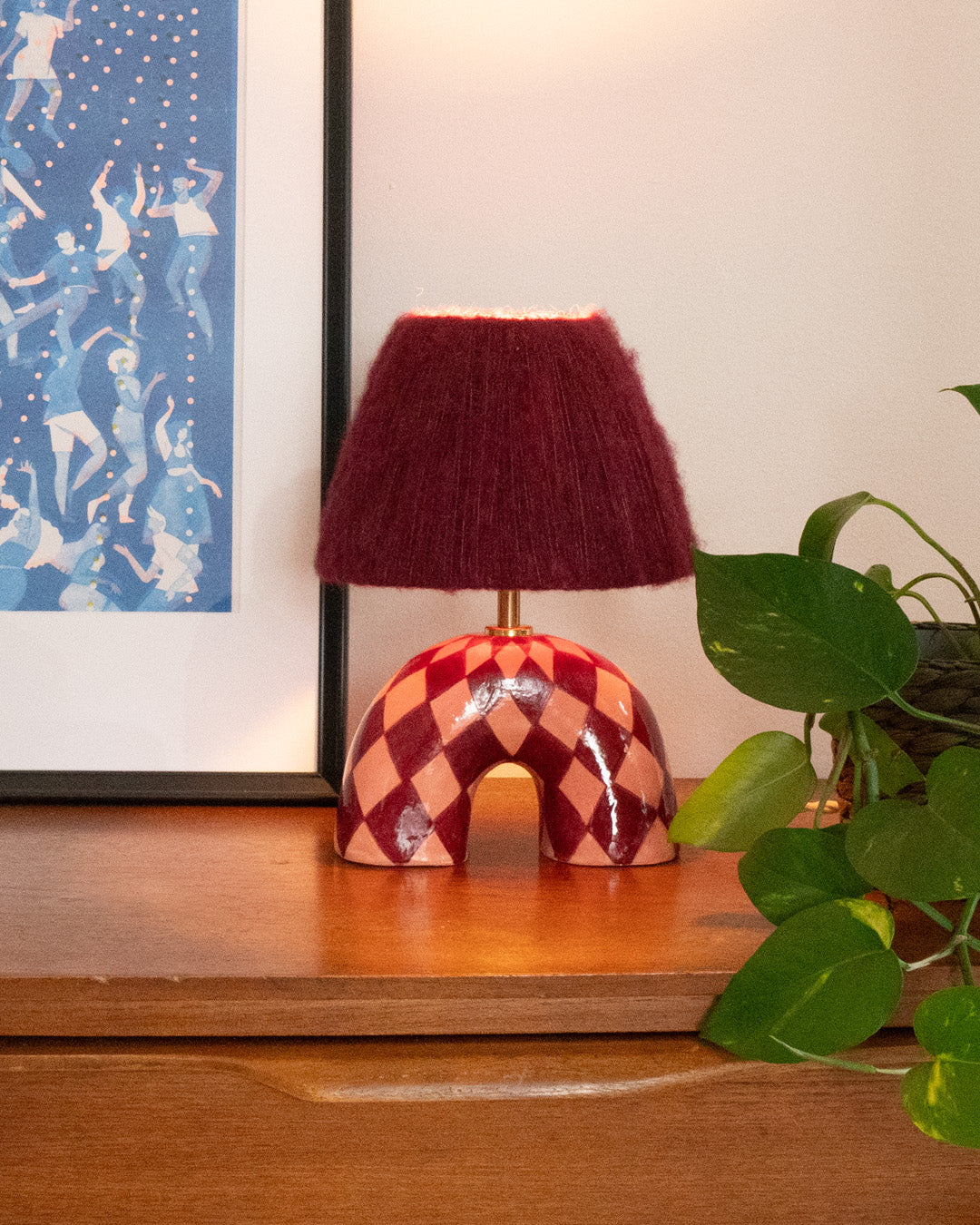 A playful yet refined addition to any room, this handmade ceramic lamp features a sculptural arched base, hand-painted with a pink and maroon diamond pattern. The glossy glaze enhances the richness of the colours and gives the surface a smooth, light-catching finish. It’s paired with our signature wool lampshade in a matching maroon colour.