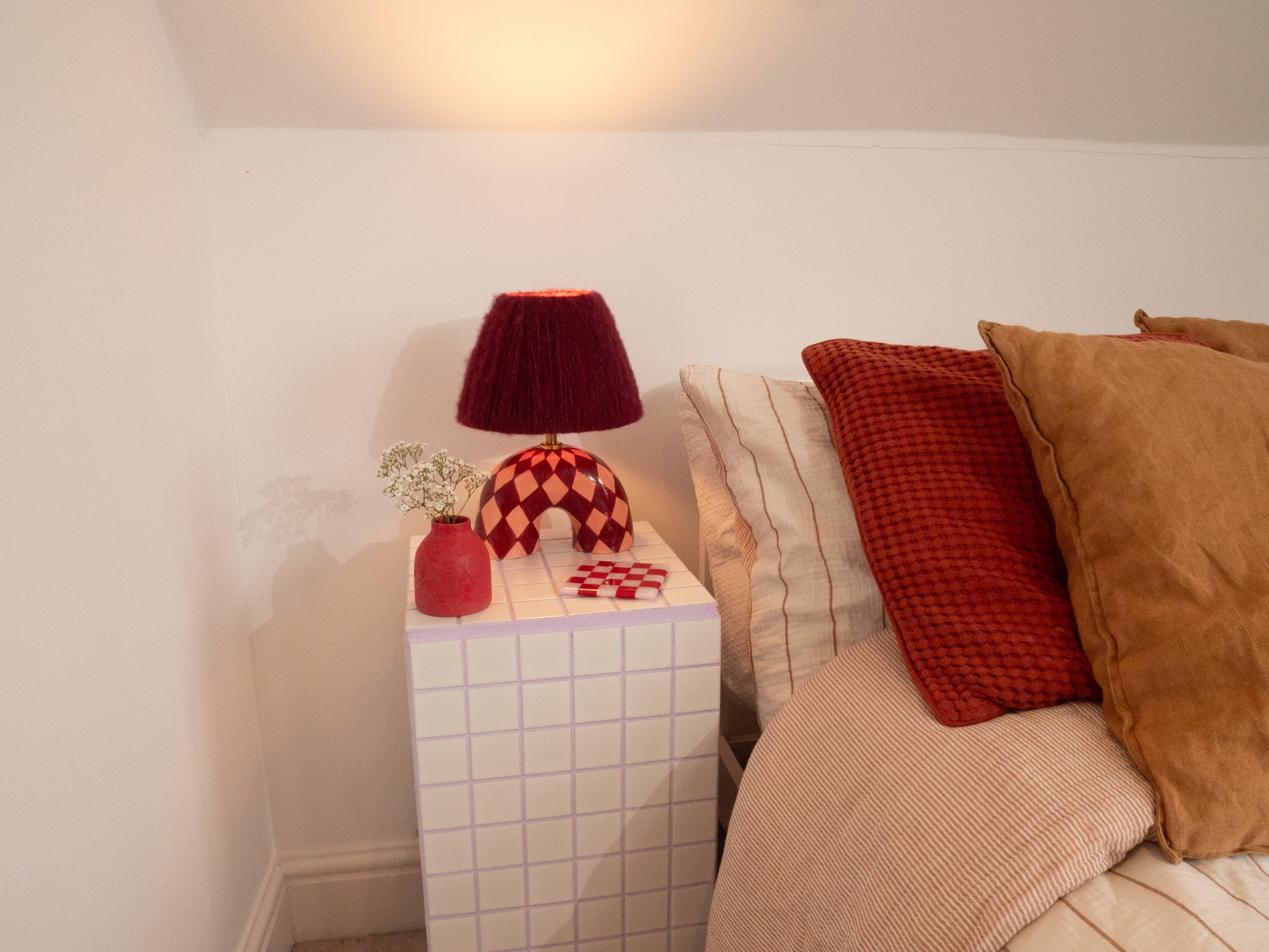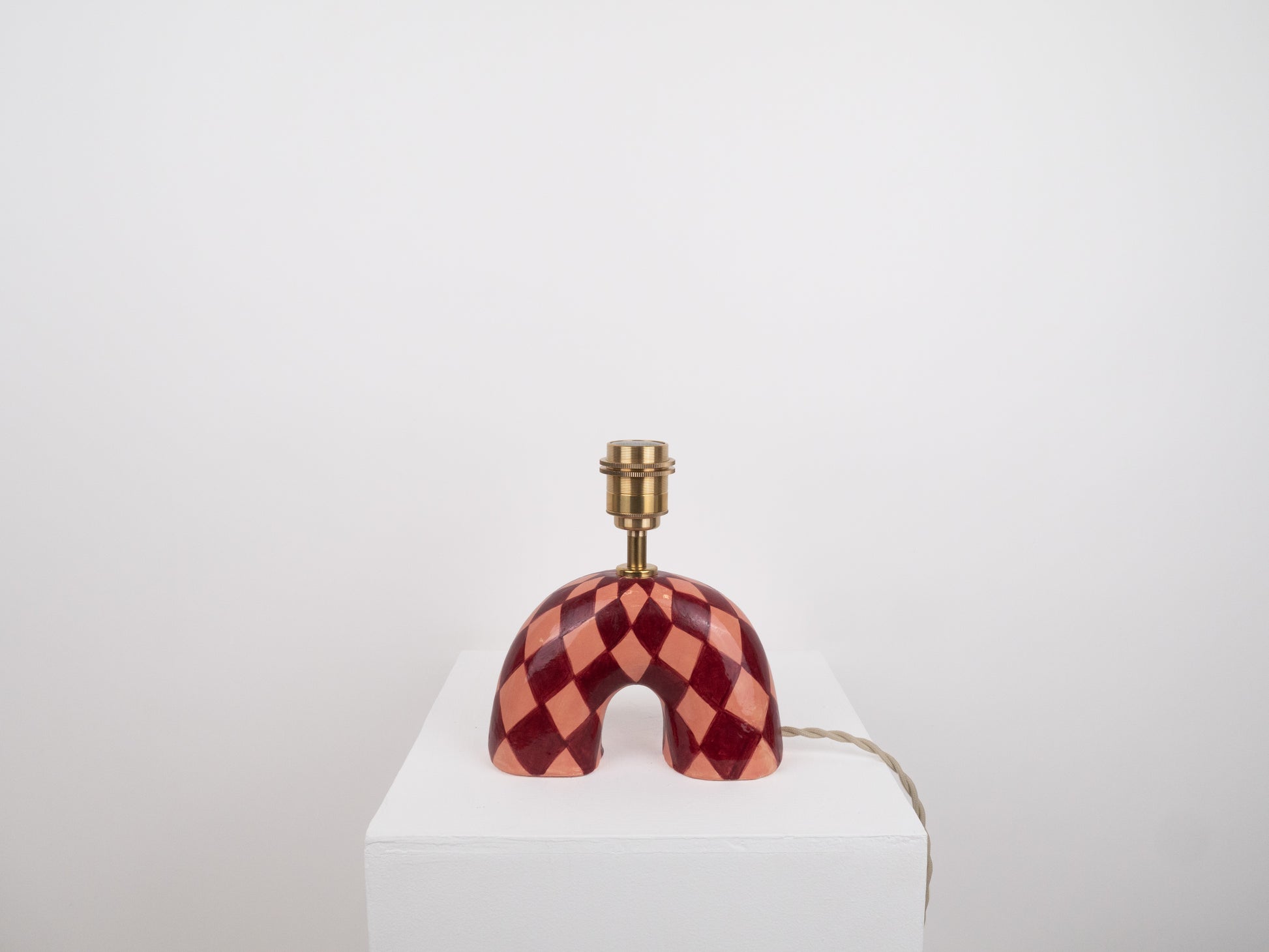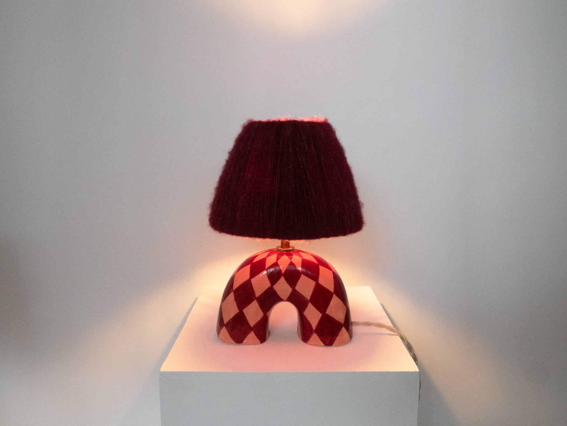 A playful yet refined addition to any room, this handmade ceramic lamp features a sculptural arched base, hand-painted with a pink and maroon diamond pattern. The glossy glaze enhances the richness of the colours and gives the surface a smooth, light-catching finish. It’s paired with our signature wool lampshade in a matching maroon colour.