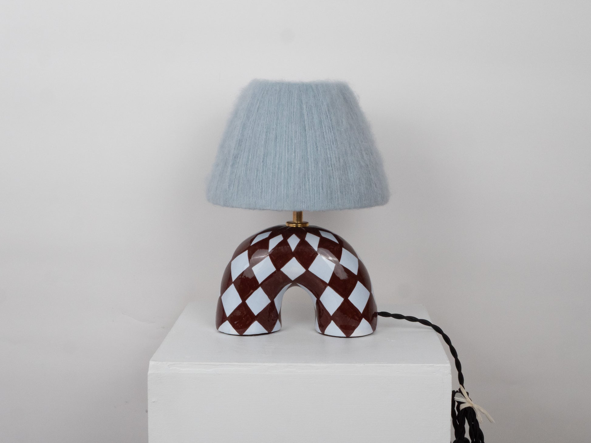 A playful yet refined addition to any room, this handmade ceramic lamp features a sculptural arched base, hand-painted with blue and brown diamond pattern. The glossy glaze enhances the richness of the colours and gives the surface a smooth, light-catching finish. It’s paired with our signature wool lampshade in either a light blue or brown colour, whose soft texture contrasts beautifully with the shine of the ceramic base.