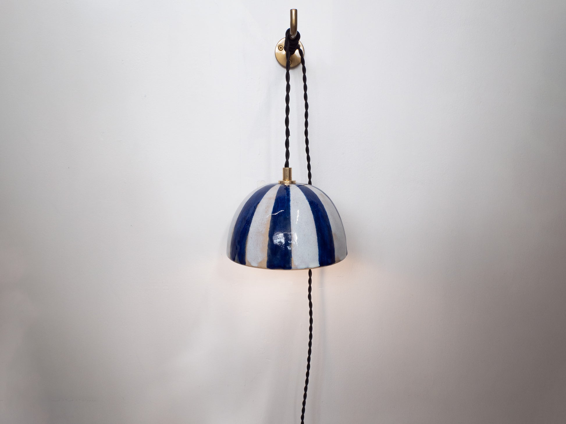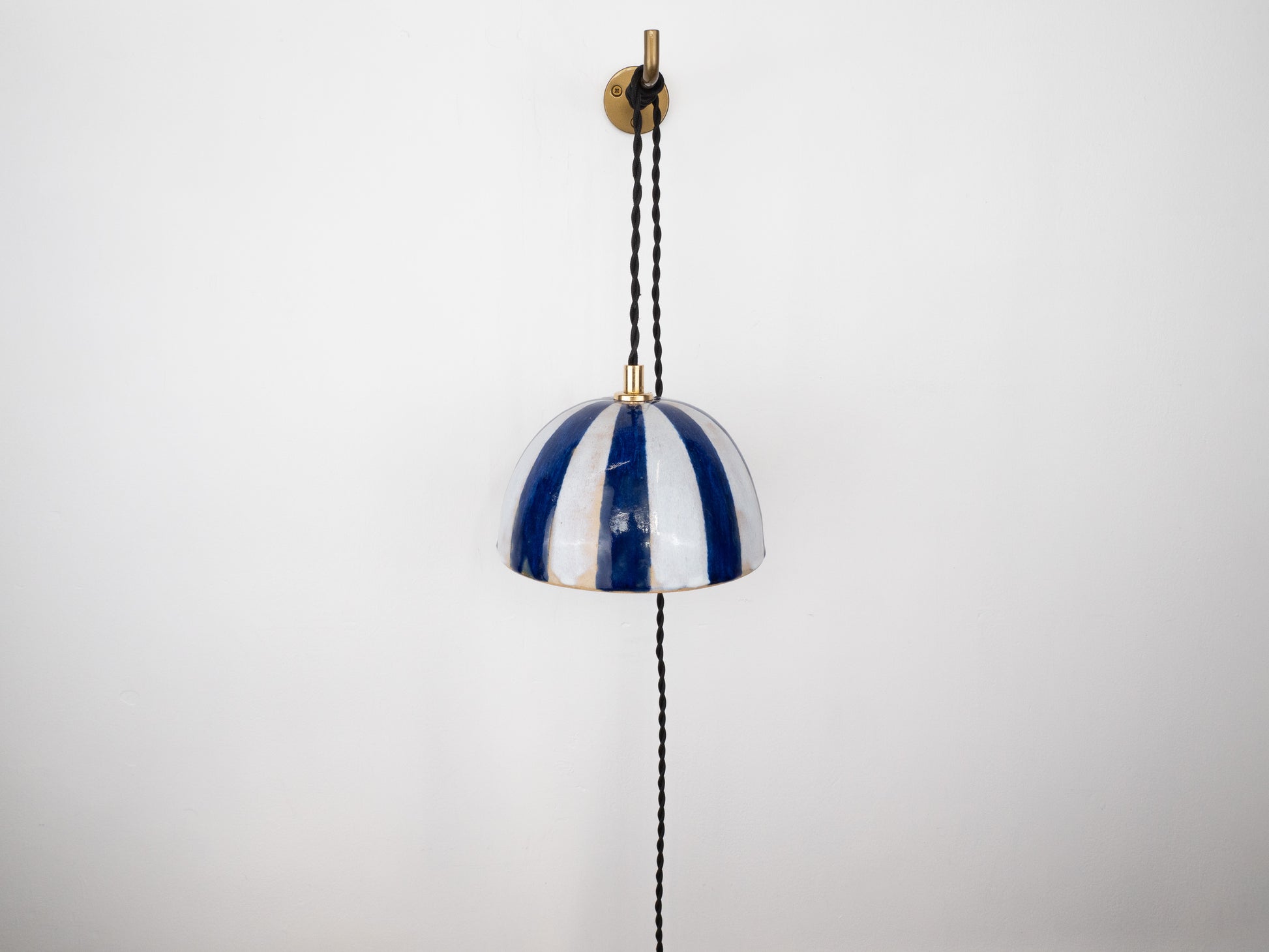 Bring artisanal charm to your space with this dome-shaped ceramic pendant, featuring a beautifully crafted white and blue stripe pattern in a smooth glaze. The hand-finished design exudes a unique, handmade quality, adding character and elegance to any room. Suspended from a brass hook, this pendant casts a warm, inviting glow, making it perfect for kitchens, living rooms, or entryways. Its timeless style and artisanal flair make it a standout piece in any setting.