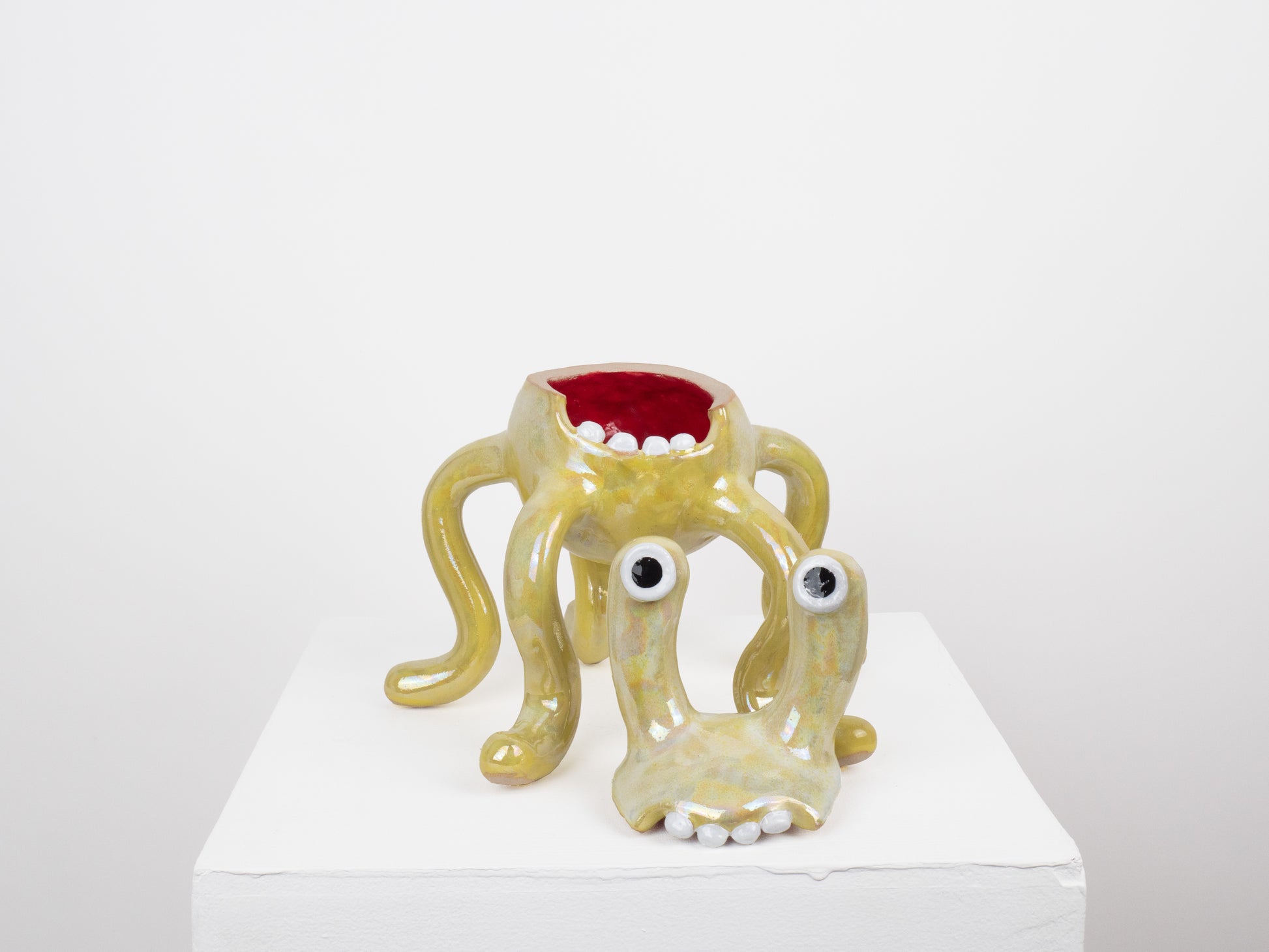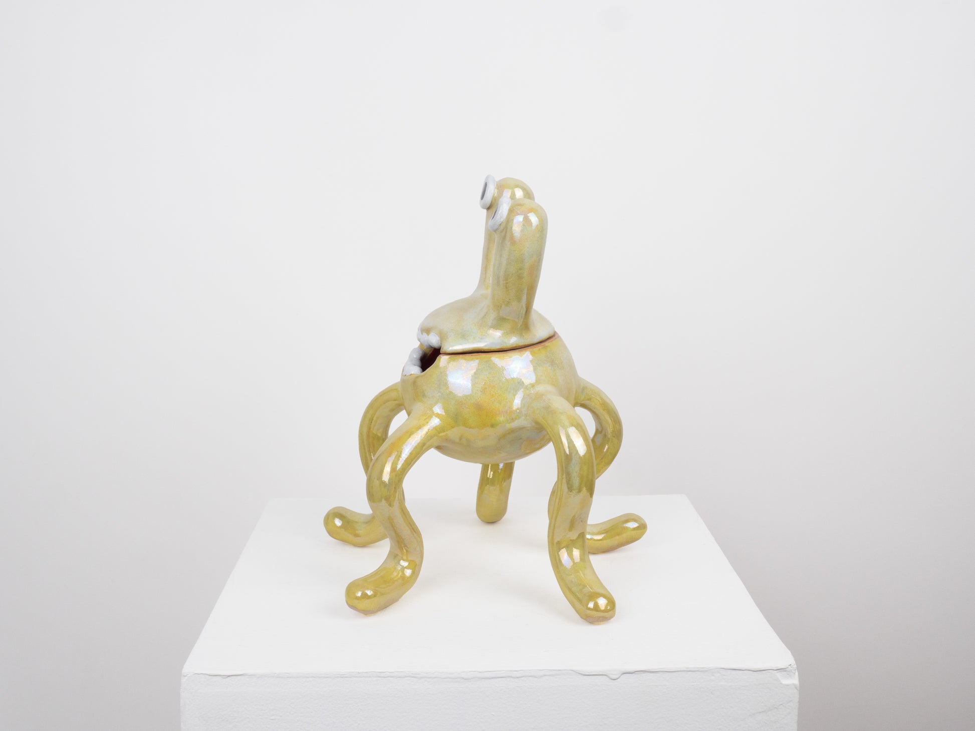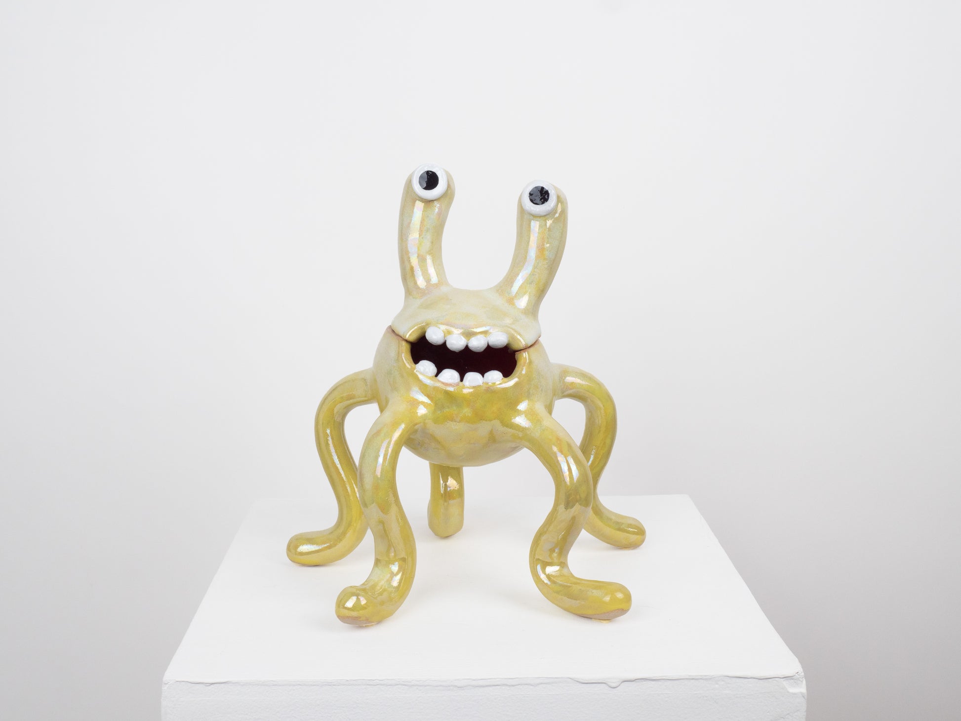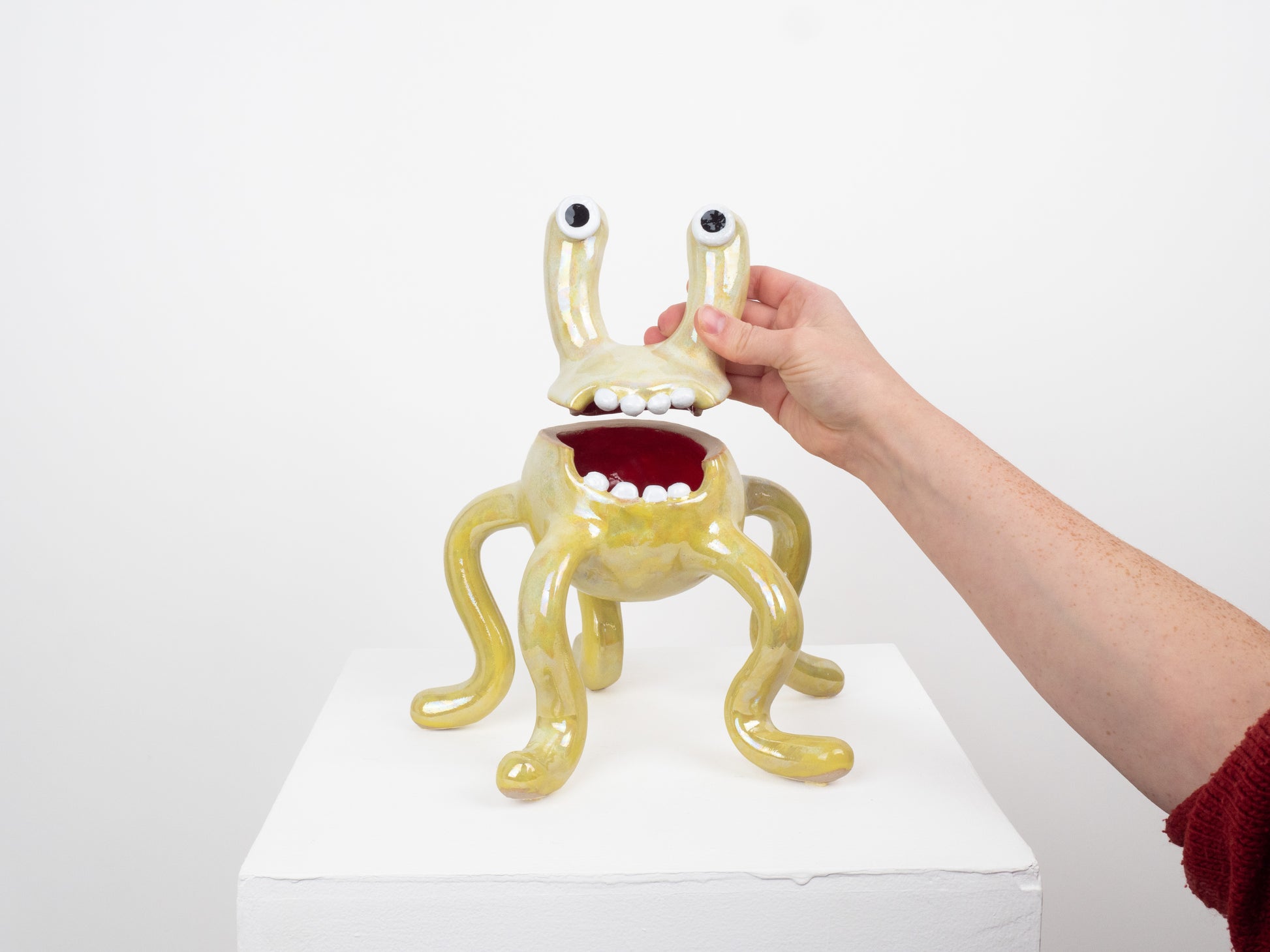 This monster pot is decorated with our yellow glaze which has white tones throughout and is finished with a pearlescent lustre. The top of the monster's head can be lifted off to store trinkets or sweets inside. 'Odie' is always going to make you smile with its bright colours and goofy expressions.