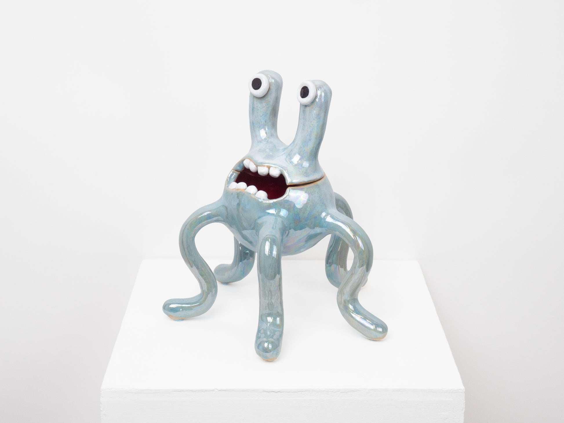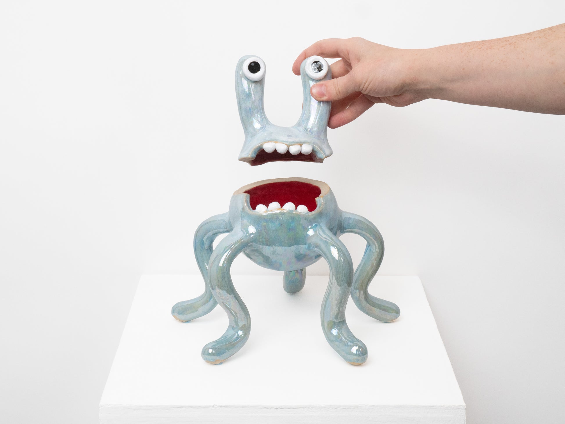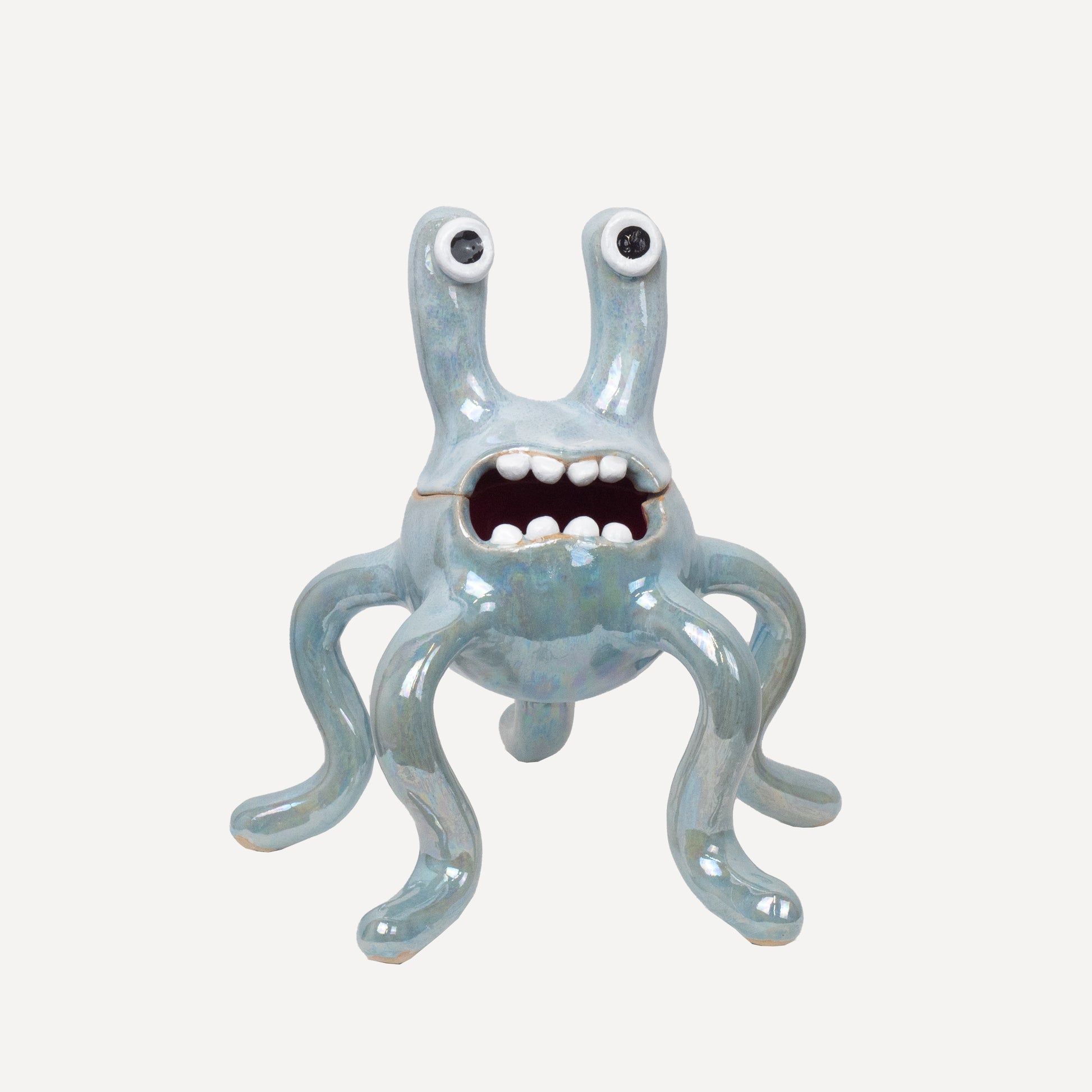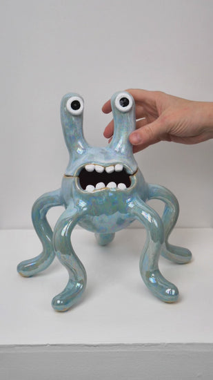 This monster pot is decorated with our light blue glaze and finished with a pearlescent lustre. The top of the monster's head can be lifted off to store trinkets or sweets inside. 'Odie' is always going to make you smile with its bright colours and goofy expressions.