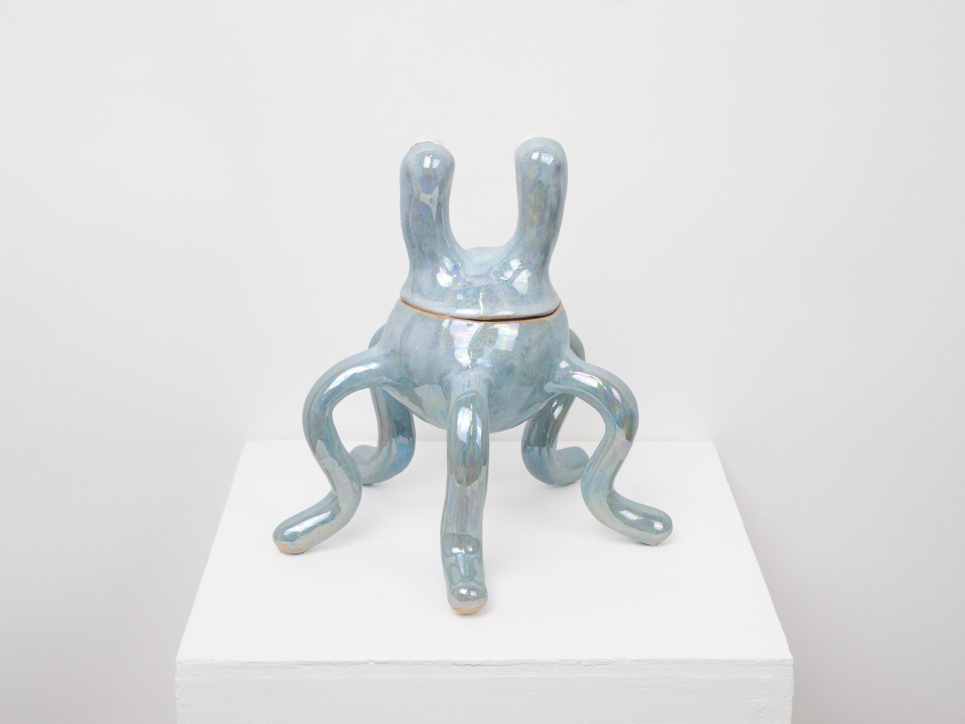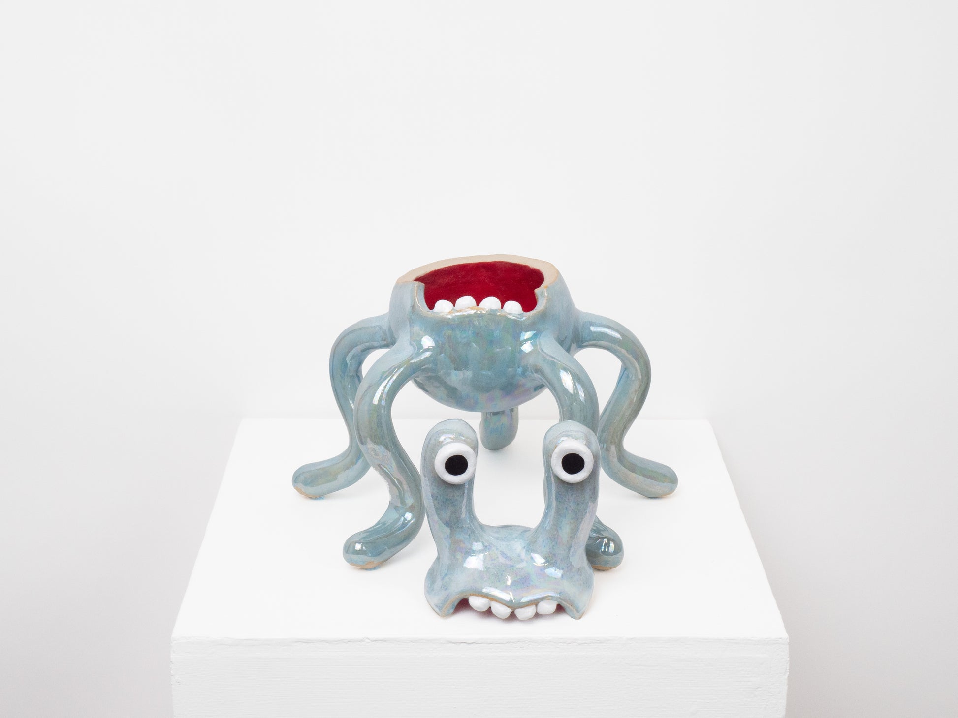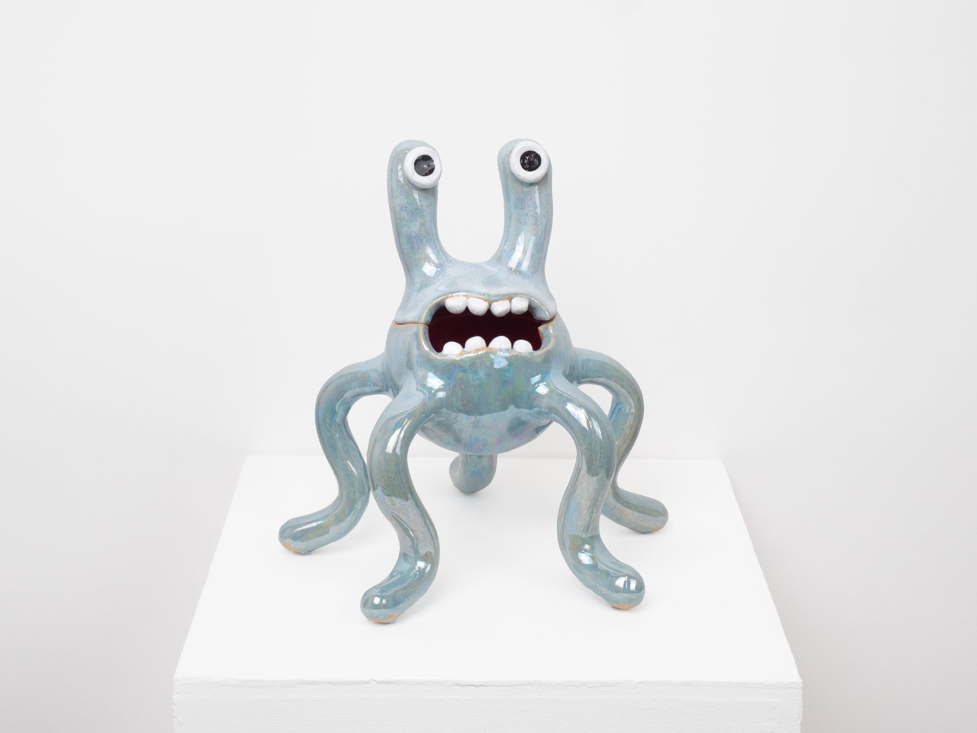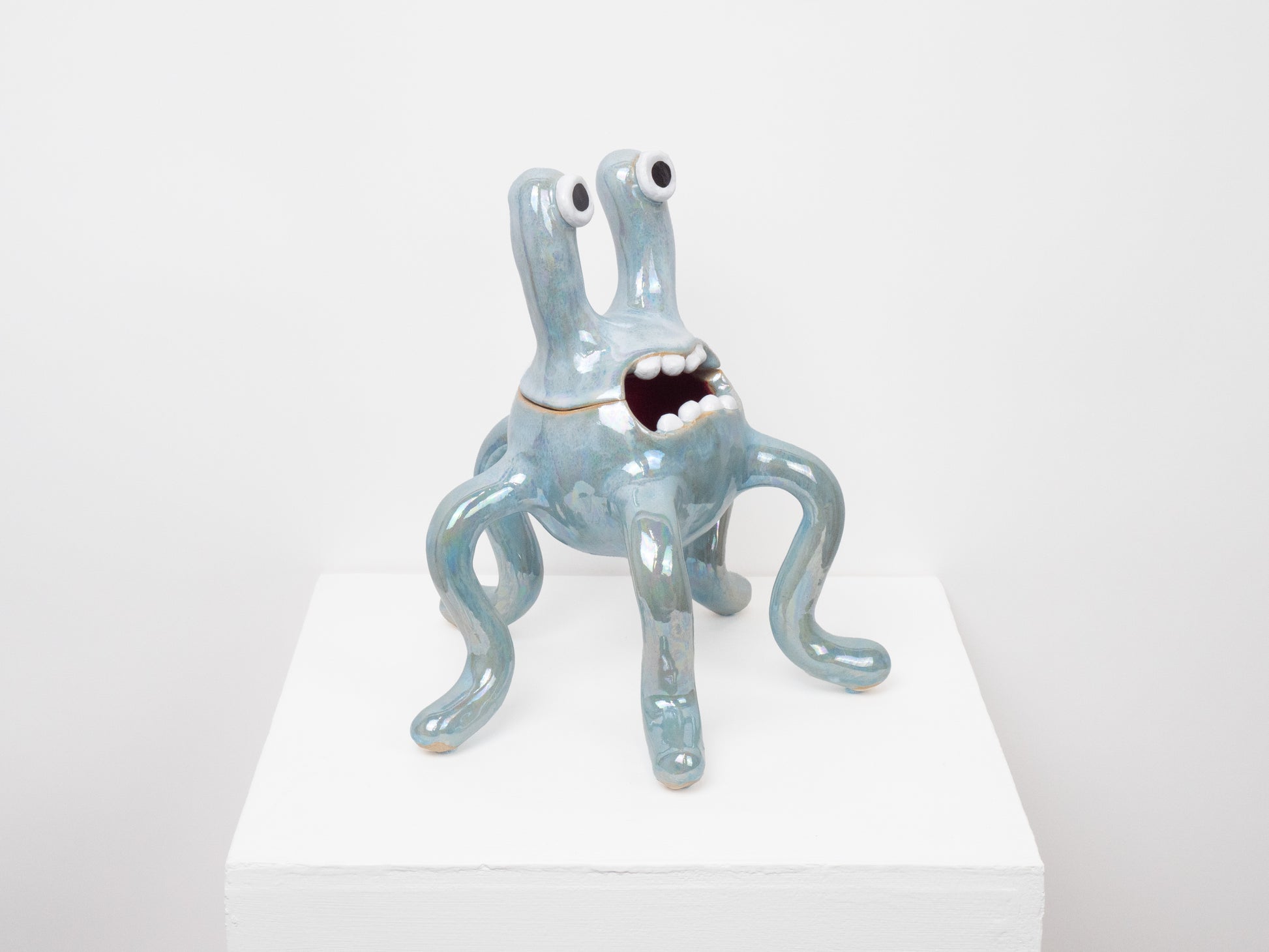 This monster pot is decorated with our light blue glaze and finished with a pearlescent lustre. The top of the monster's head can be lifted off to store trinkets or sweets inside. 'Odie' is always going to make you smile with its bright colours and goofy expressions.