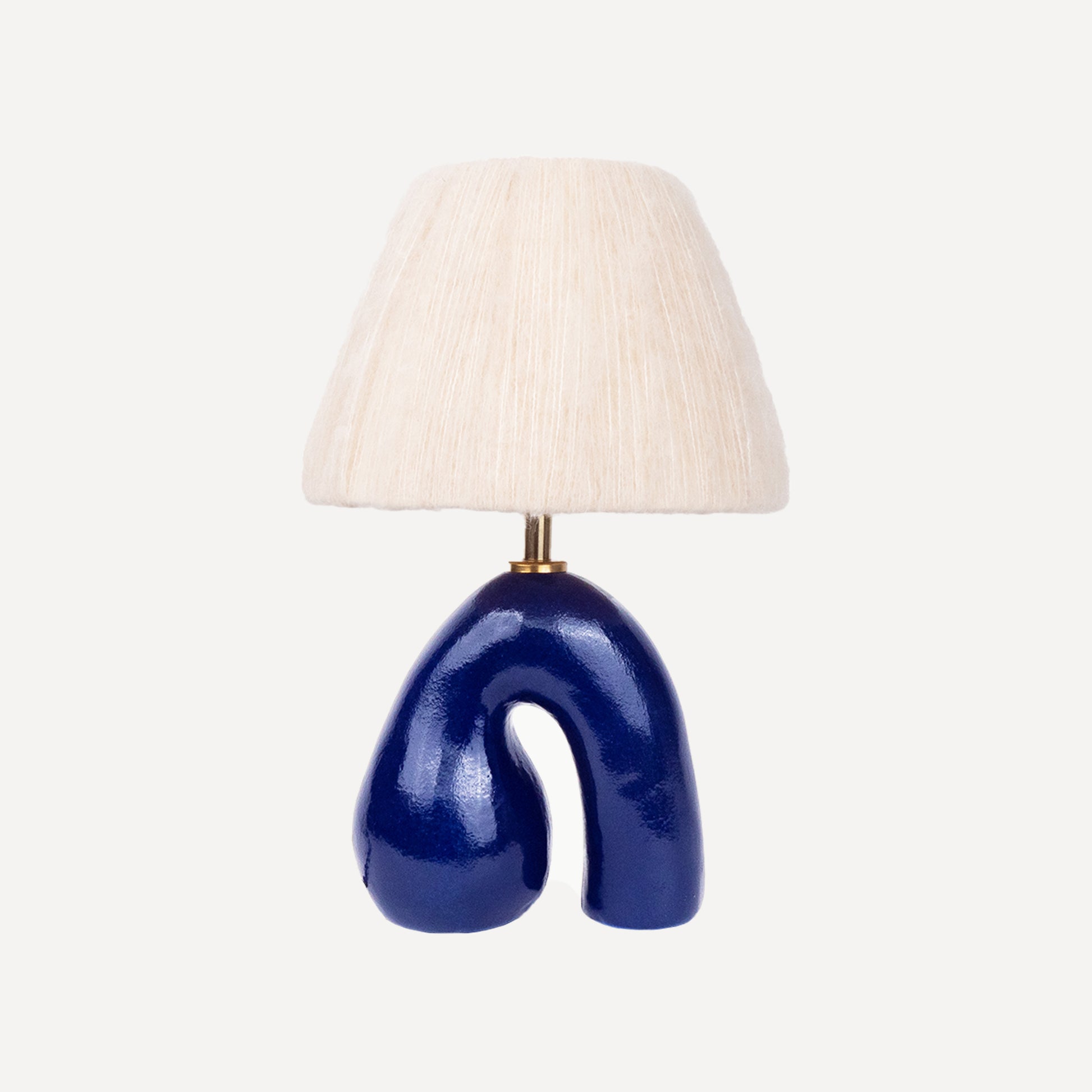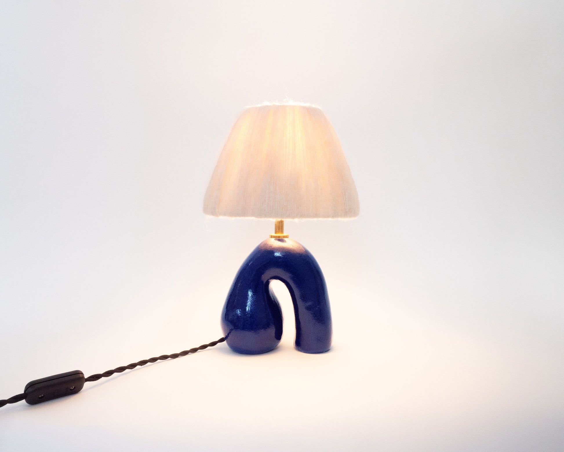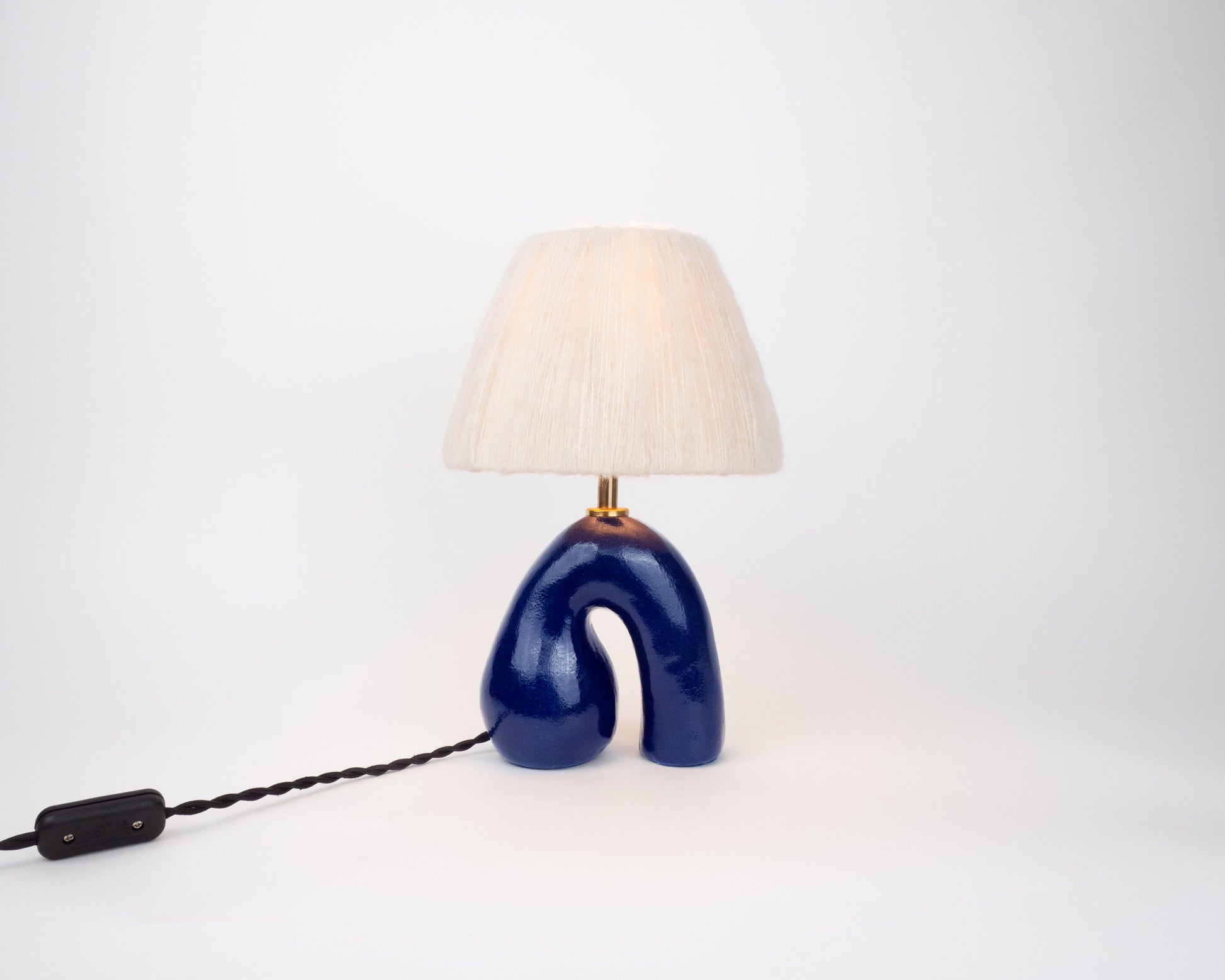 Handmade ceramic Dark Blue lamp base with a glossy finish paired with an Off-White wool shade