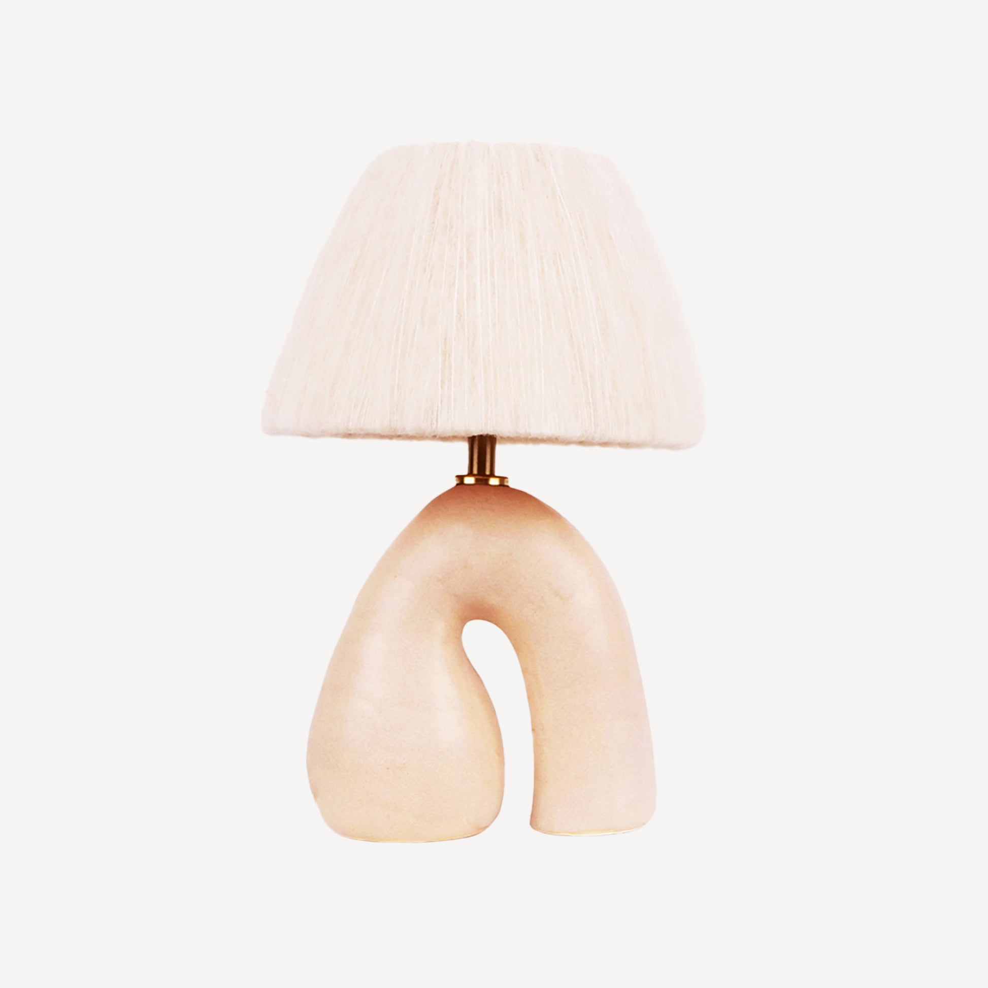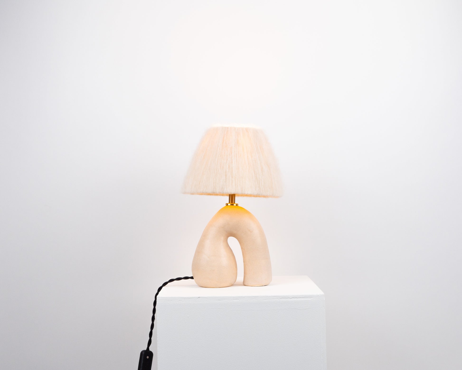 Handmade ceramic Cream lamp base with a satin finish paired with a matching Off-White wool shade