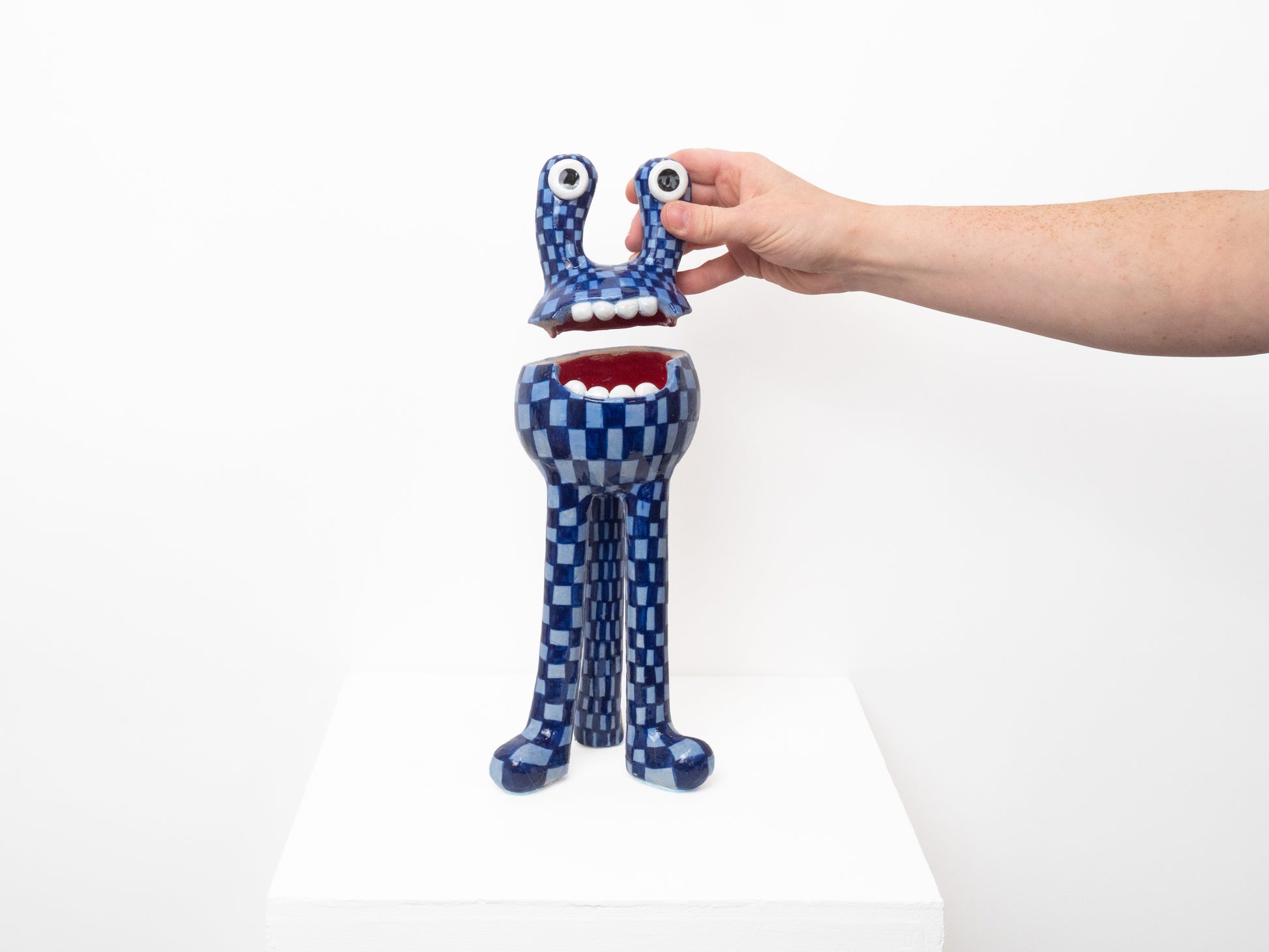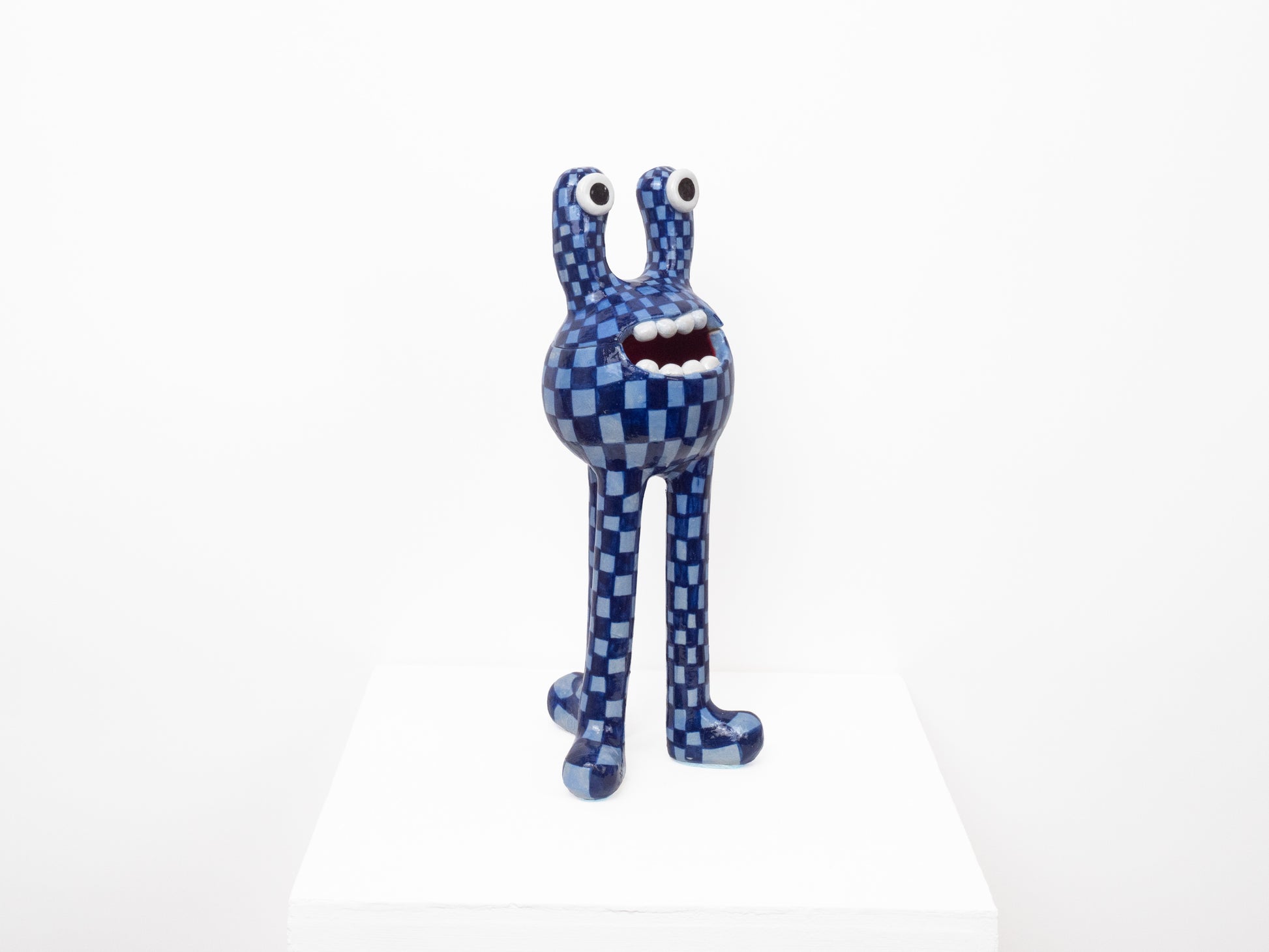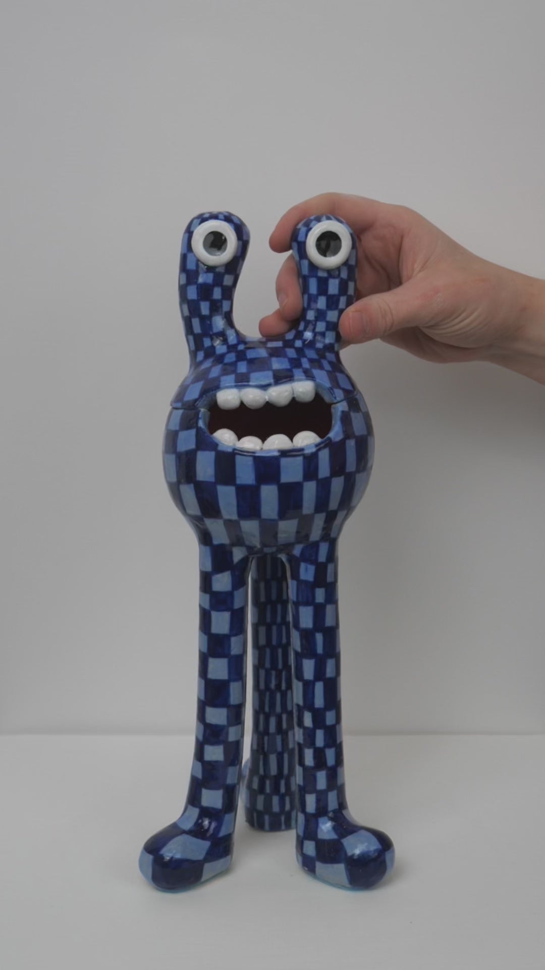 This 'Remy' monster is decorated with a two tone blue check pattern finished with a glossy glaze. The 'Remy' monster doubles as a ceramic pot - perfect for storing all of your trinkets, sweets or any other goodies! The colourful pattern brings a joyous feeling to any space.