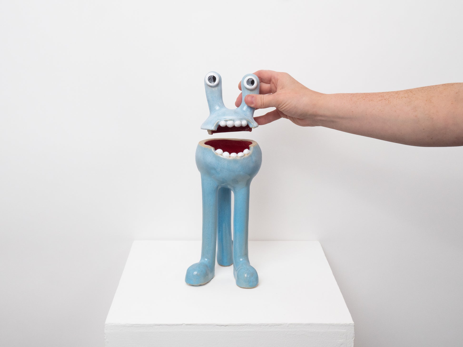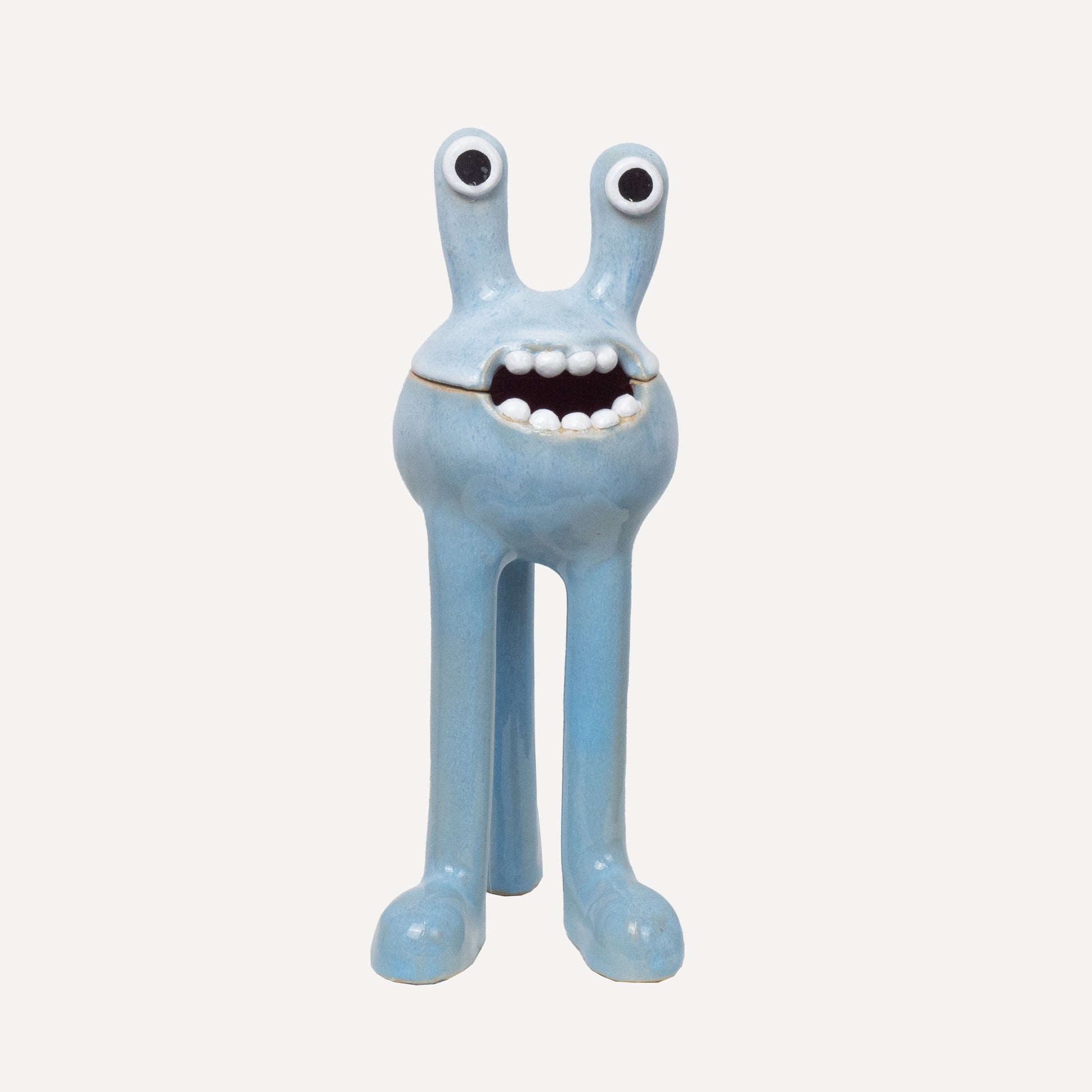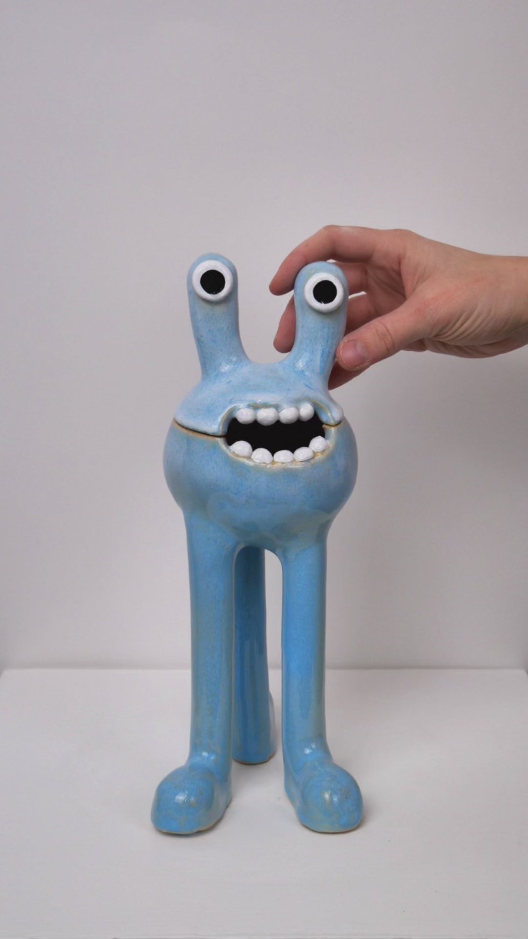 This 'Remy' monster is decorated with our 'Soft Sky' glaze. This is a light blue colour with white diffused within. The 'Remy' monster doubles as a ceramic pot - perfect for storing all of your trinkets, sweets or any other goodies! The colourful pattern brings a joyous feeling to any space.
