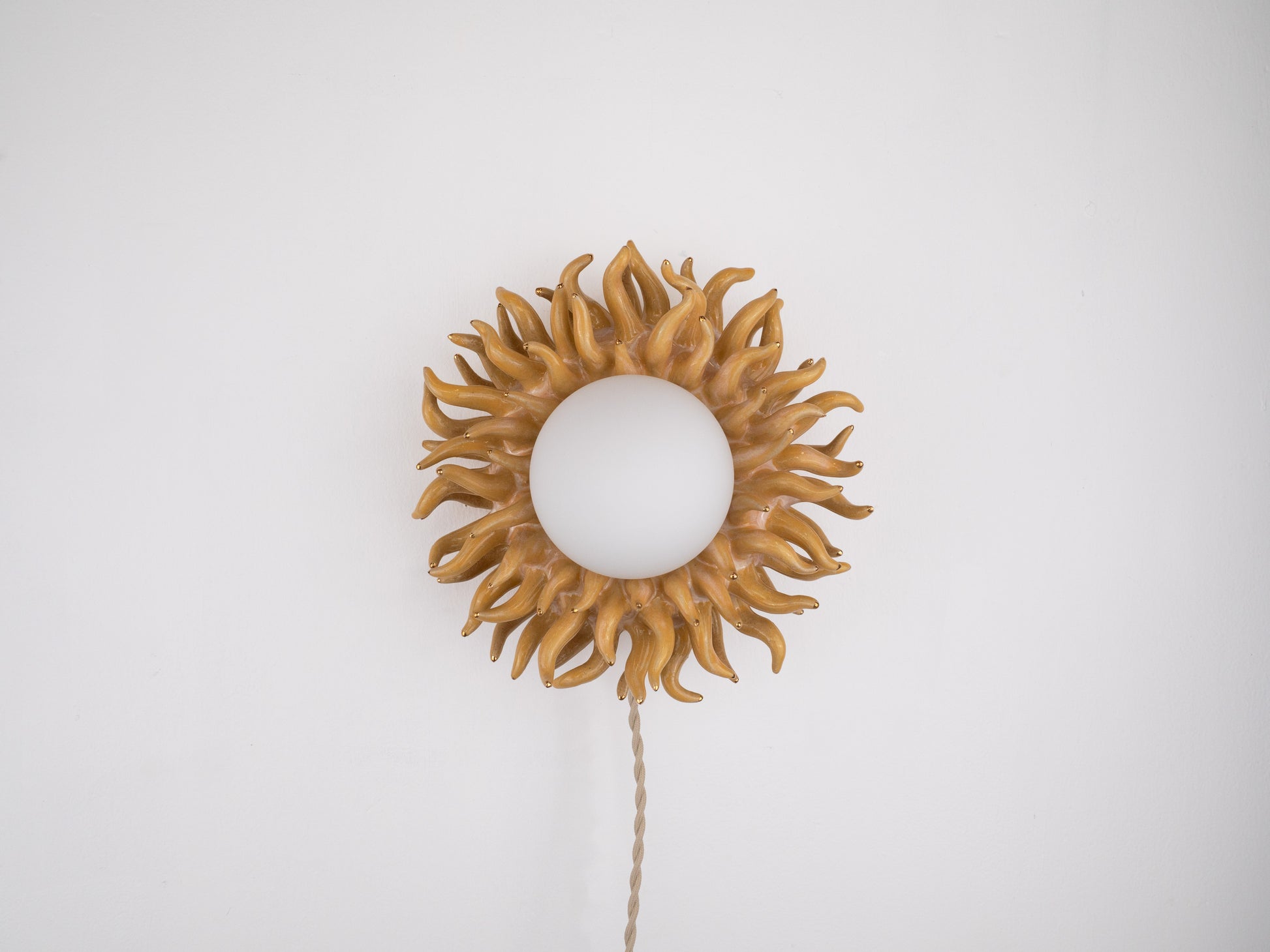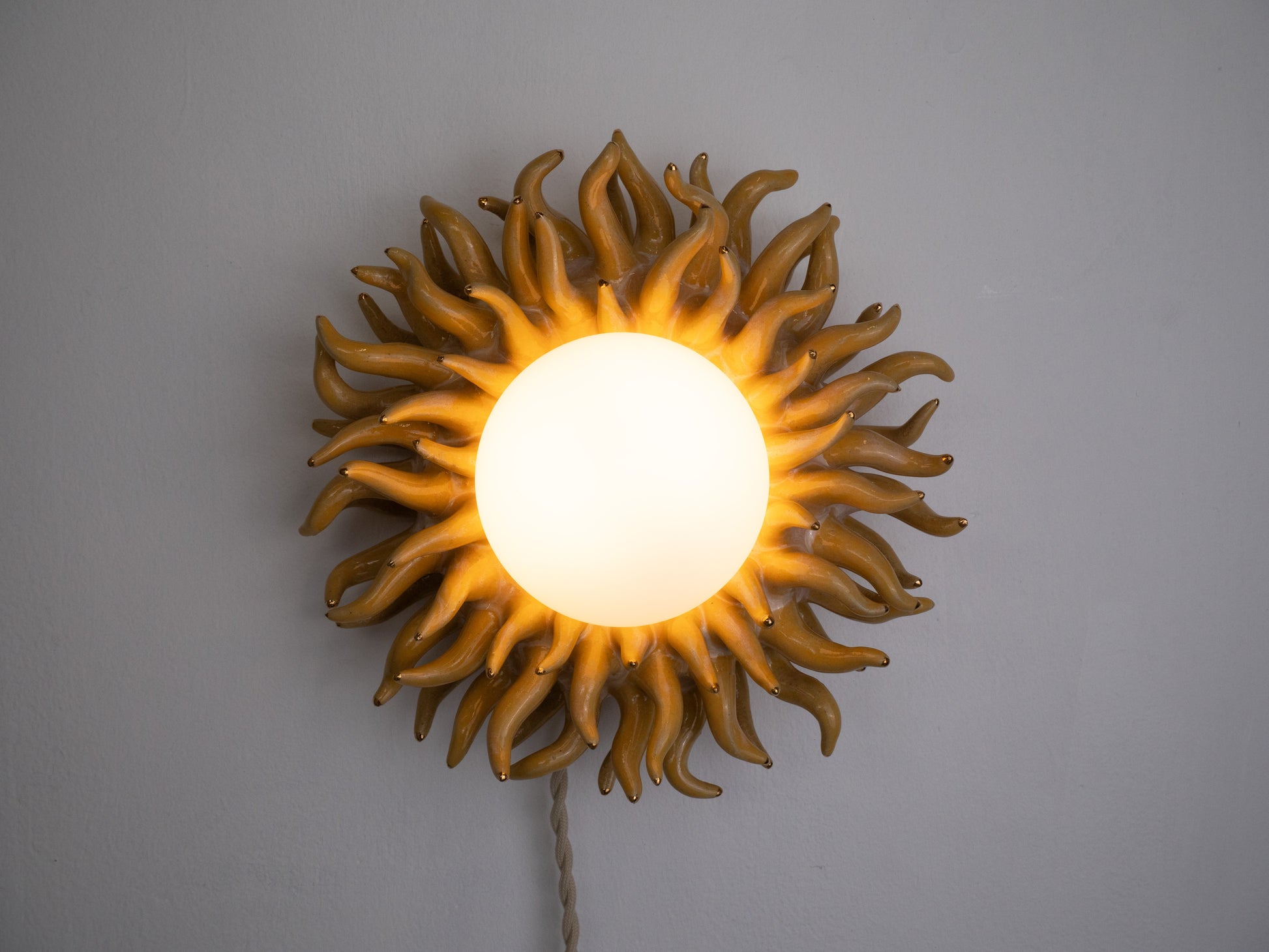 This handmade ceramic wall light has a dynamic design that looks like it is dancing with energy. With its warm tones, 24k gold tips and glowing centre, it will be sure to bring a touch of the sun’s warmth indoors!