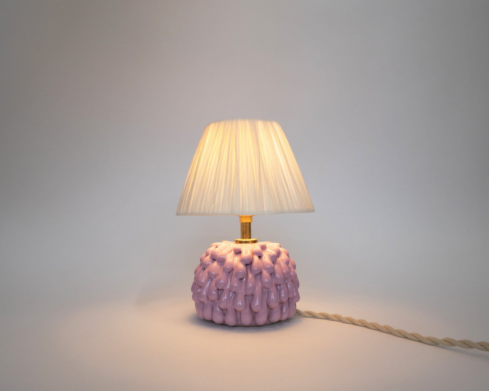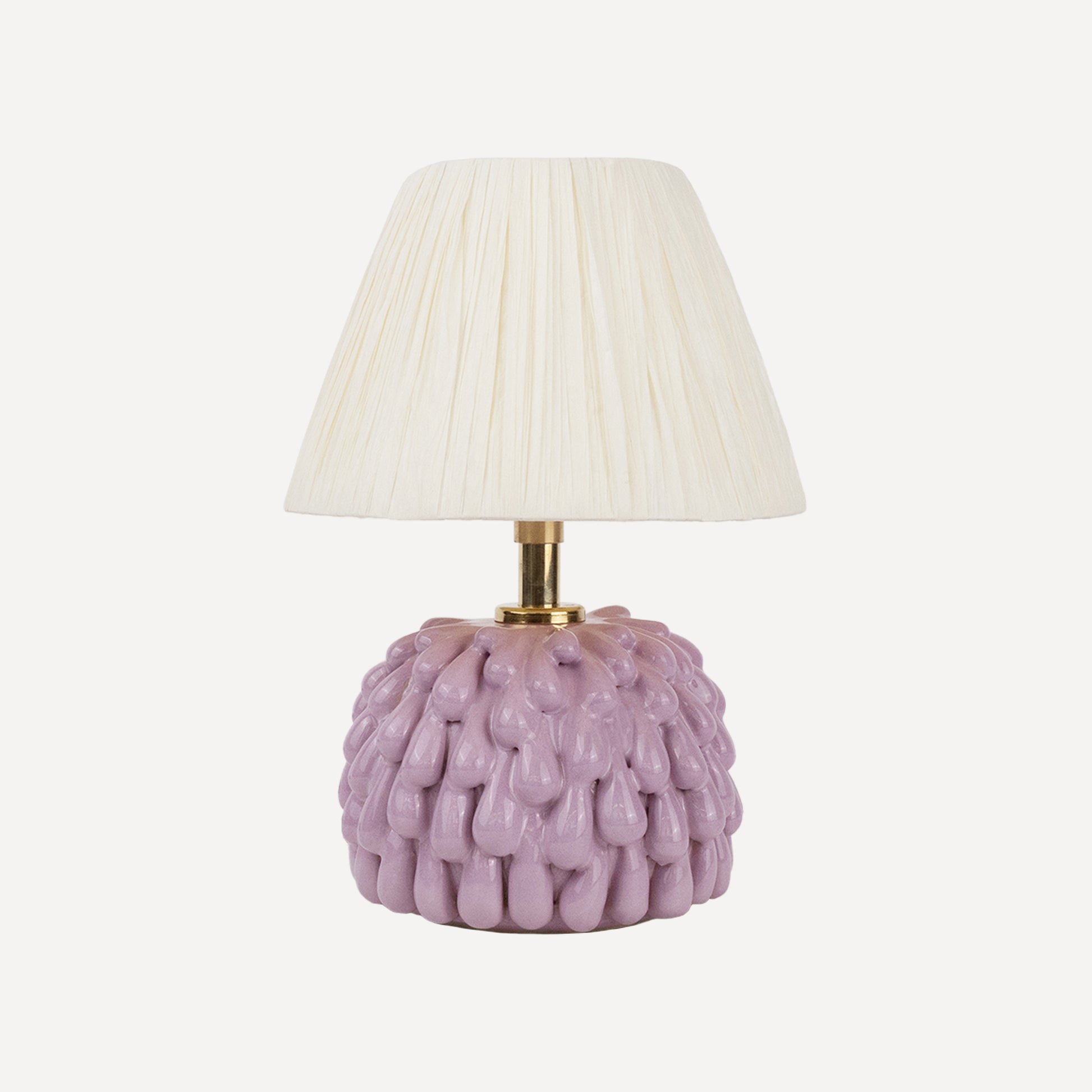 Meet your new tiny beacon of coziness. This adorable handmade ceramic lamp has a glossy violet base with a playful drippy texture. Topped with a delicate paper raffia shade, it casts a soft, warm glow - perfect for dreamy evenings.