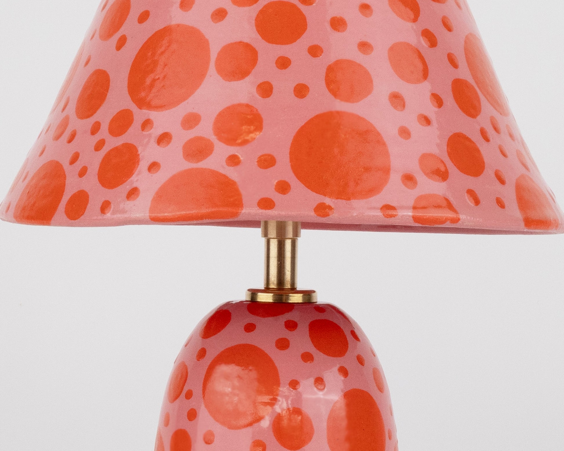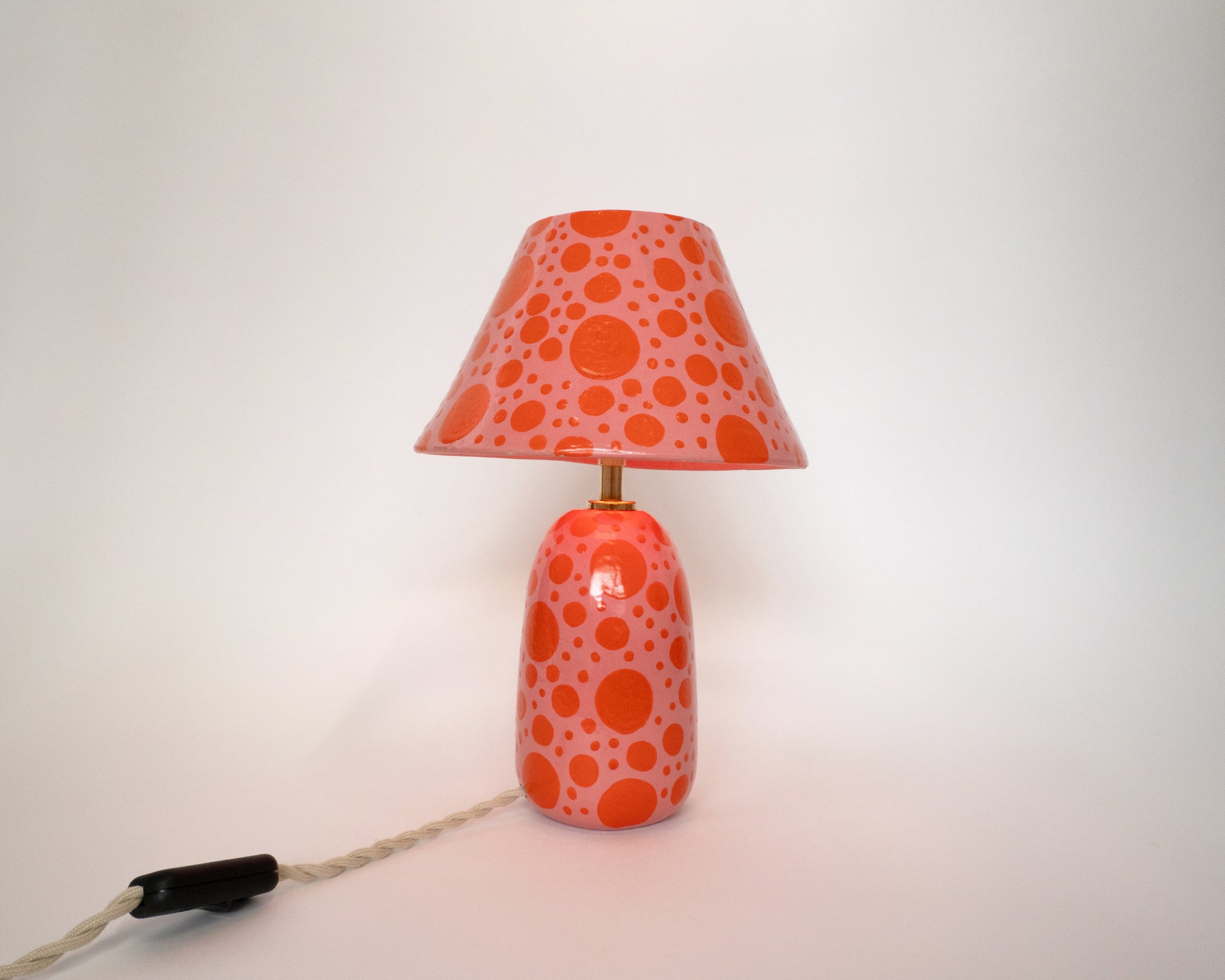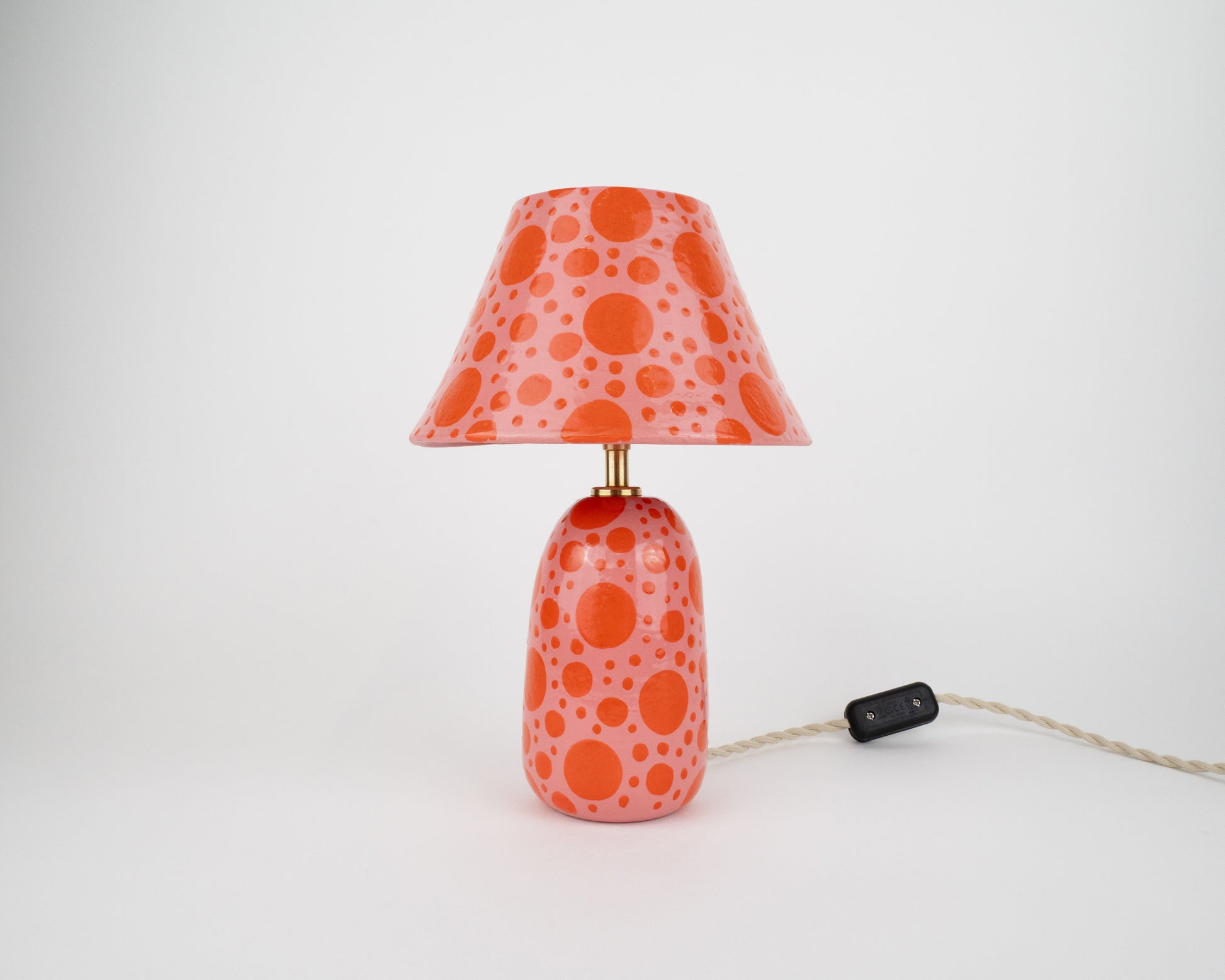 Add a pop of colour to your space with this vibrant pink and orange polka dot lamp. Featuring a unique, handcrafted ceramic base and matching shade, this statement piece will bring a fun, modern touch to any room. Perfect for bedside tables, desks, or cozy corners.