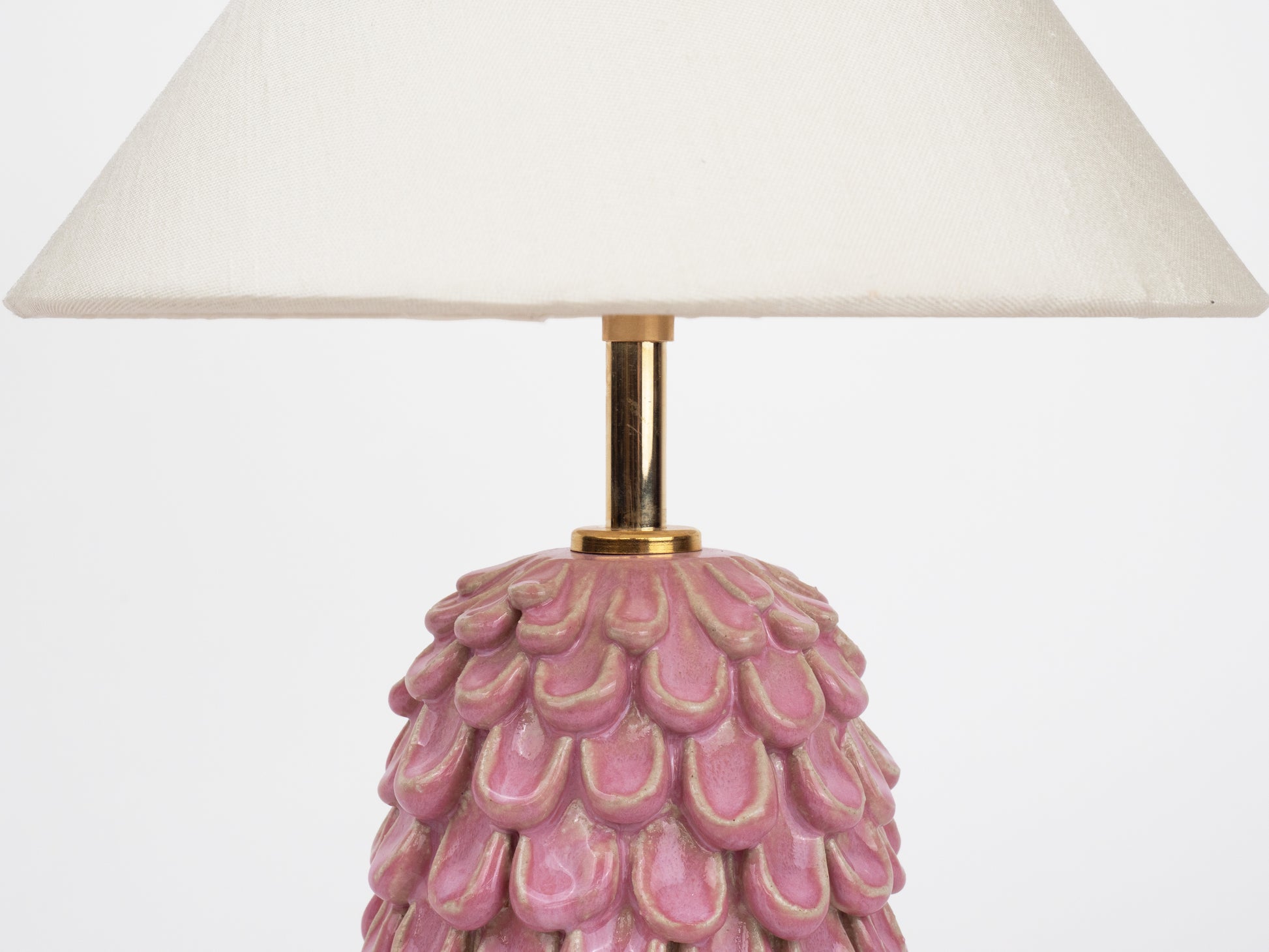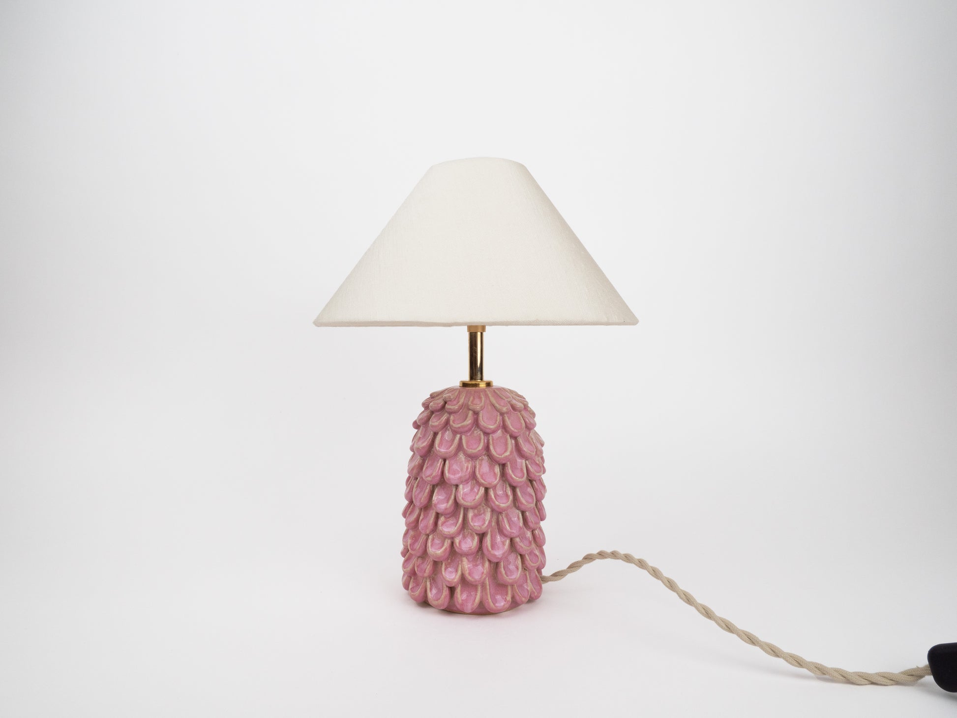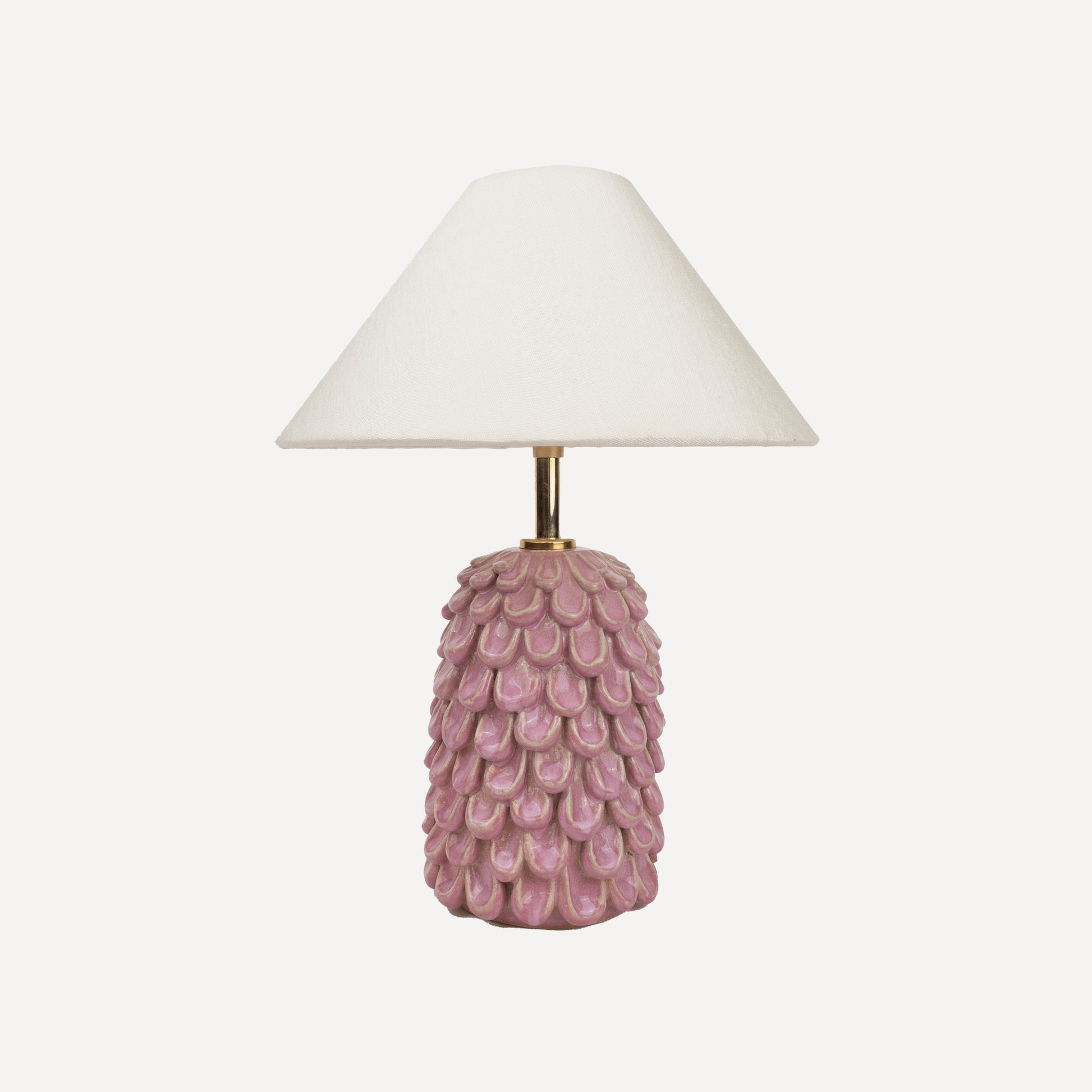 This handmade lamp is covered with our petal texture to give it an organic, flower like form. Its glossy pink glaze give it a playful spirit that will uplift any space its in.