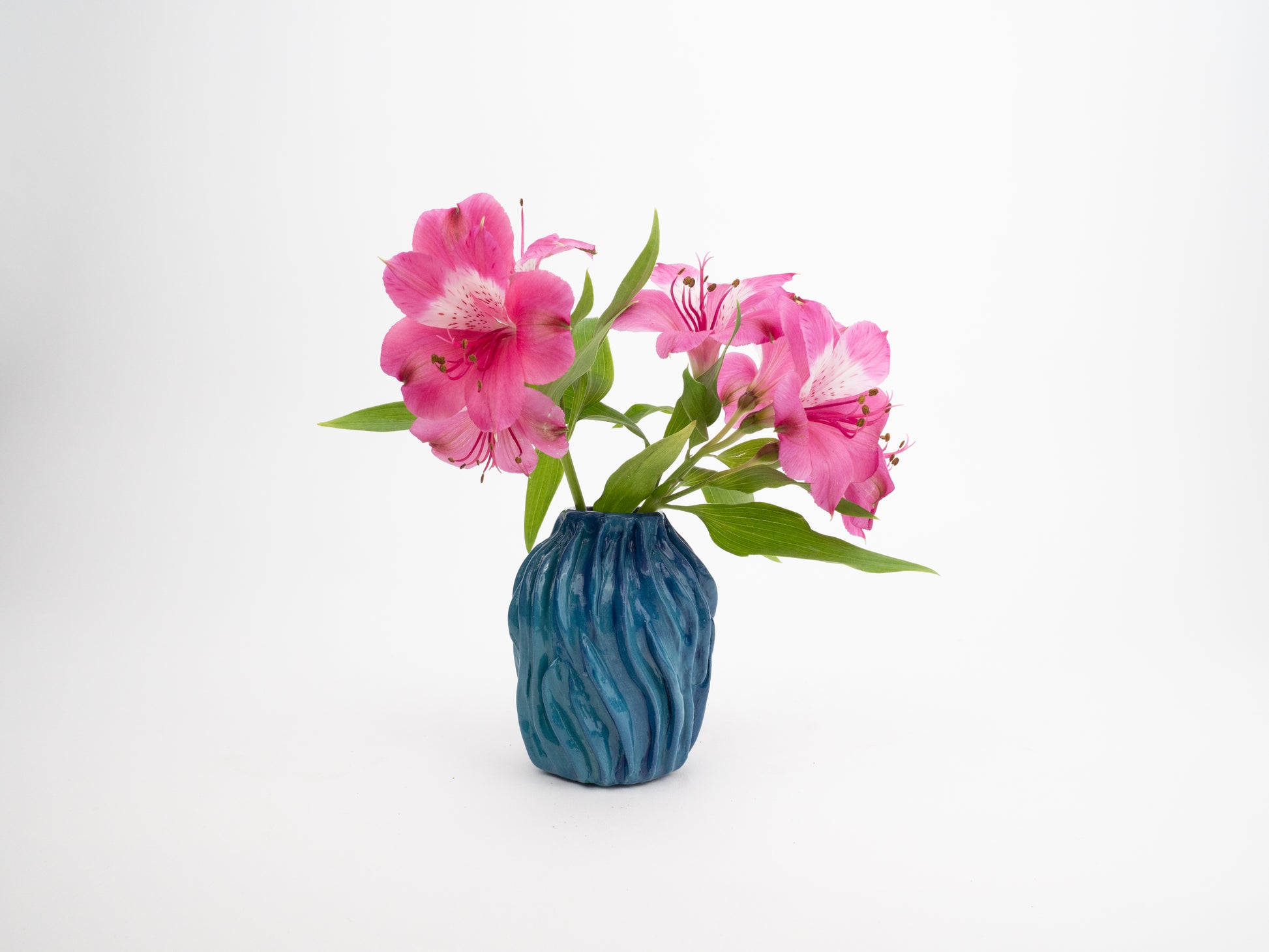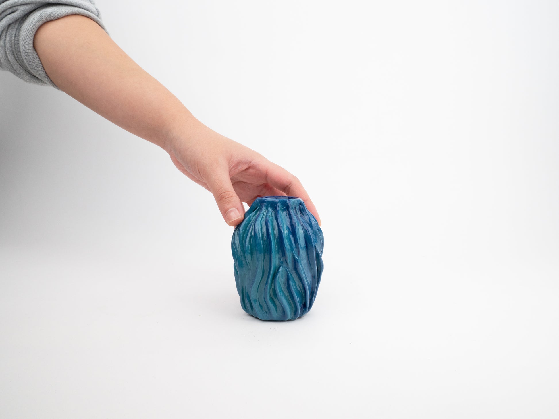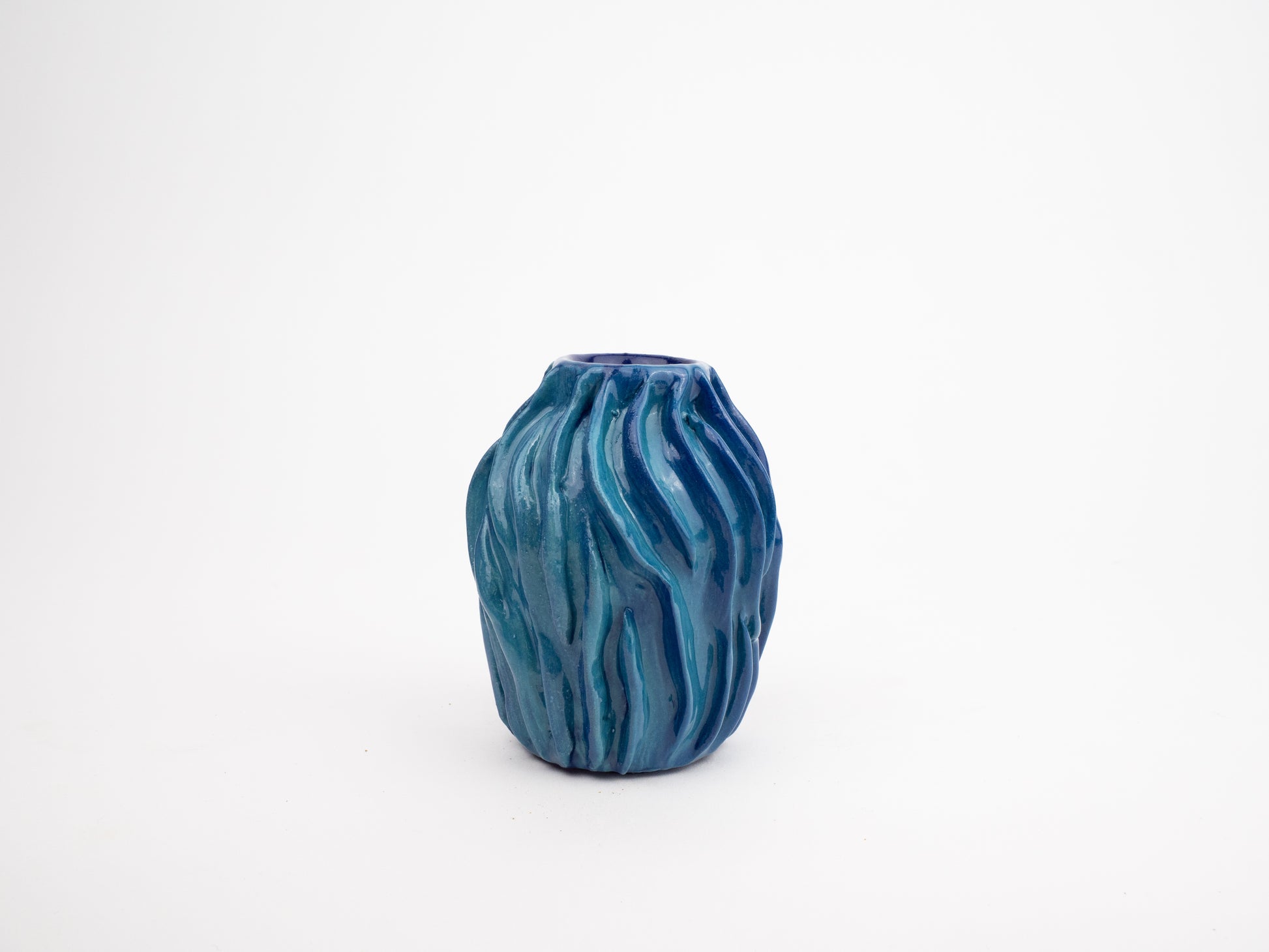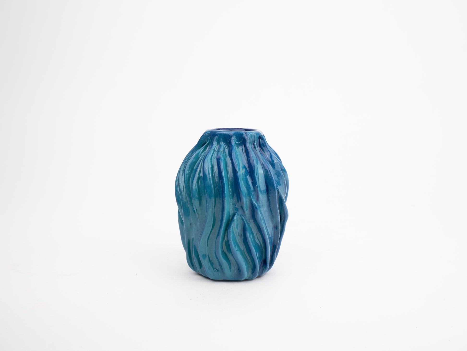 This vase has an abstract vertical texture added to a wheel-thrown base. The vase has been decorated using blue and turquoise colours which alternate on the side of the texture to create an optical effect.
