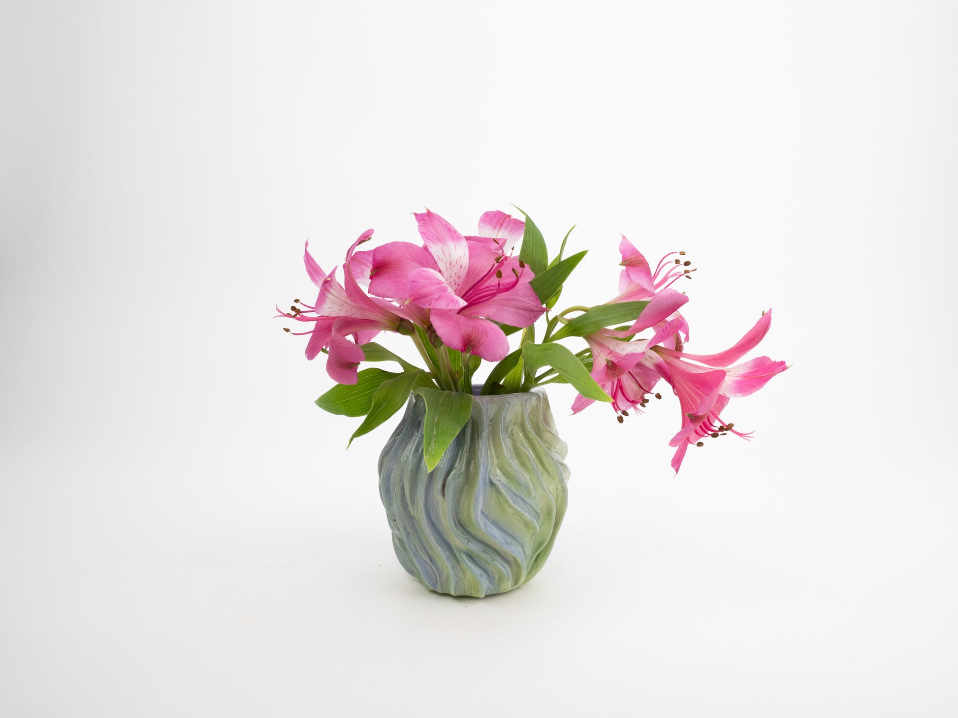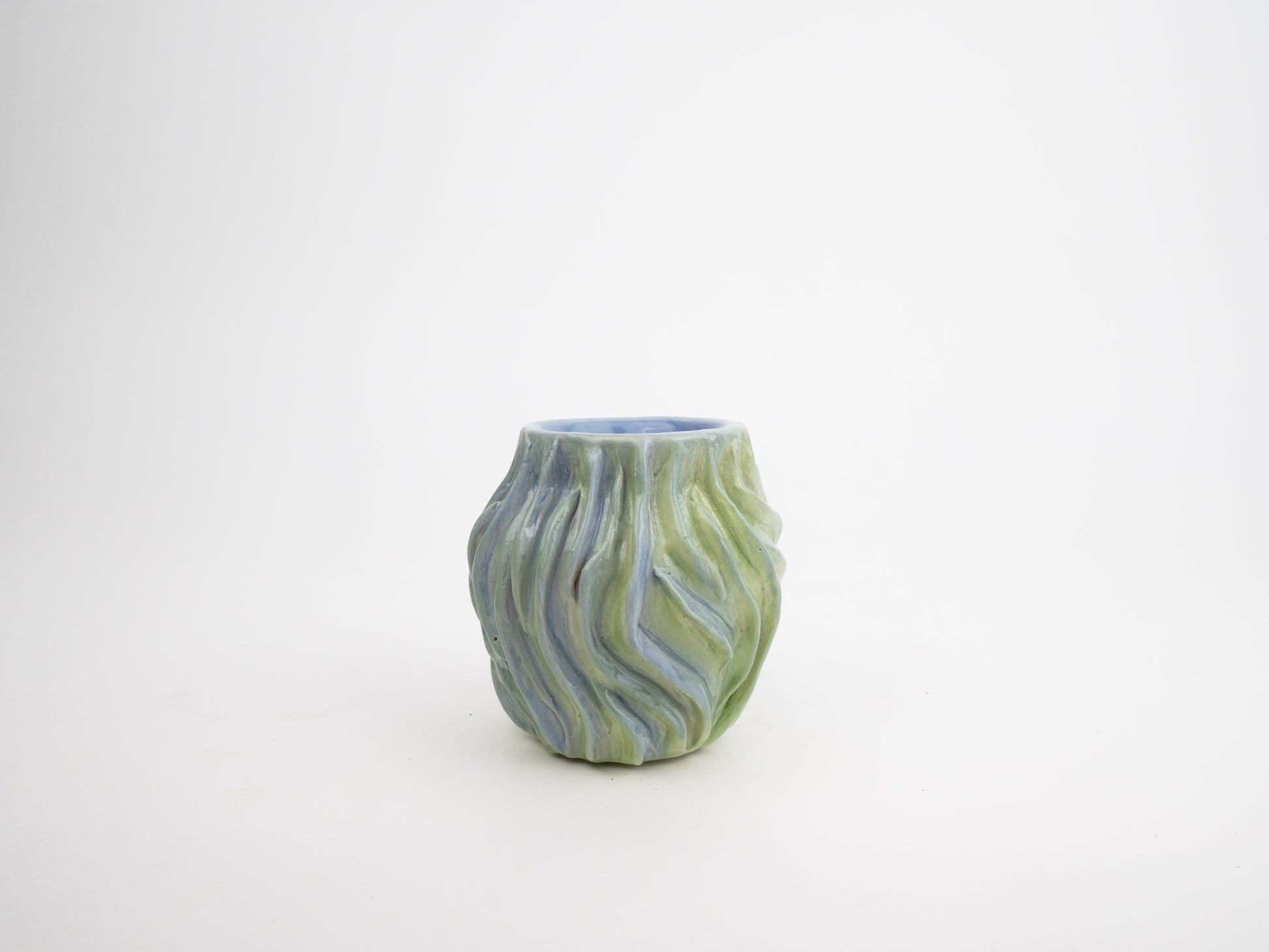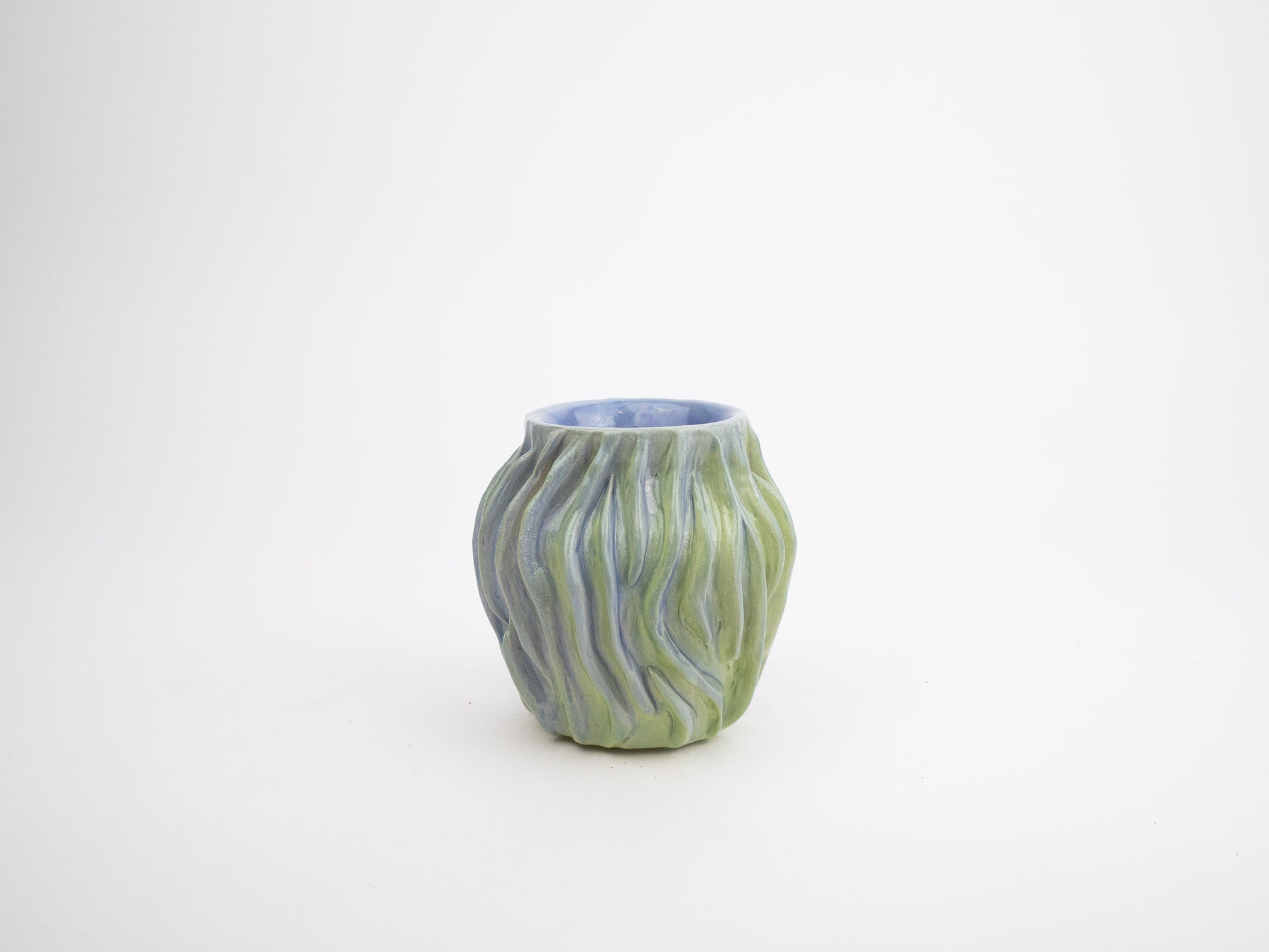 This vase has an abstract vertical texture added to a wheel-thrown base. The vase has been decorated using green and purple colours which alternate on the side of the texture to create an optical effect.