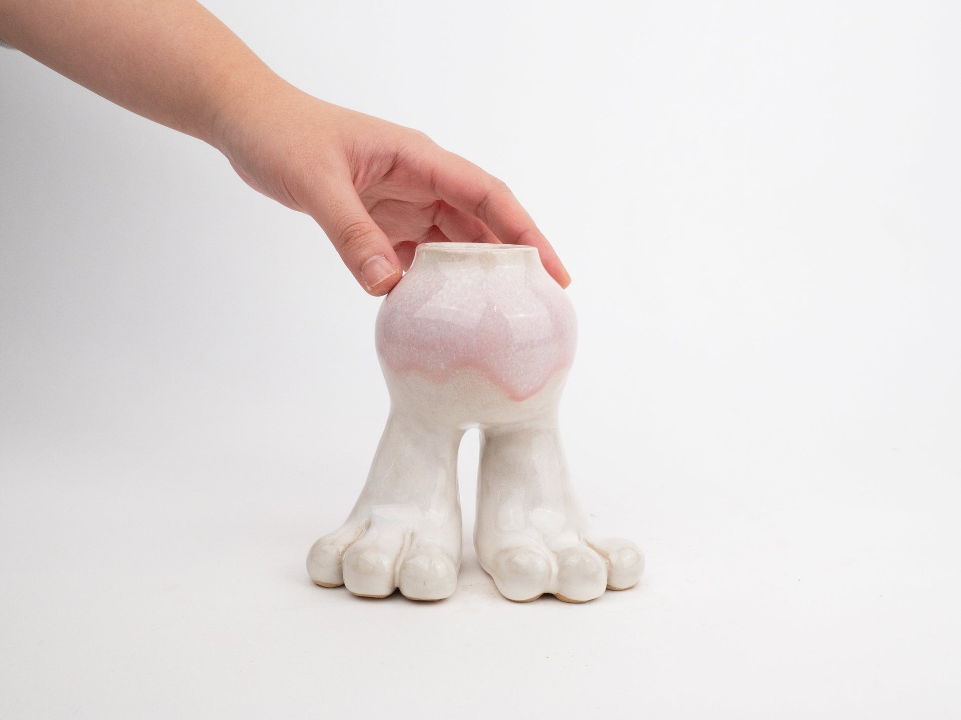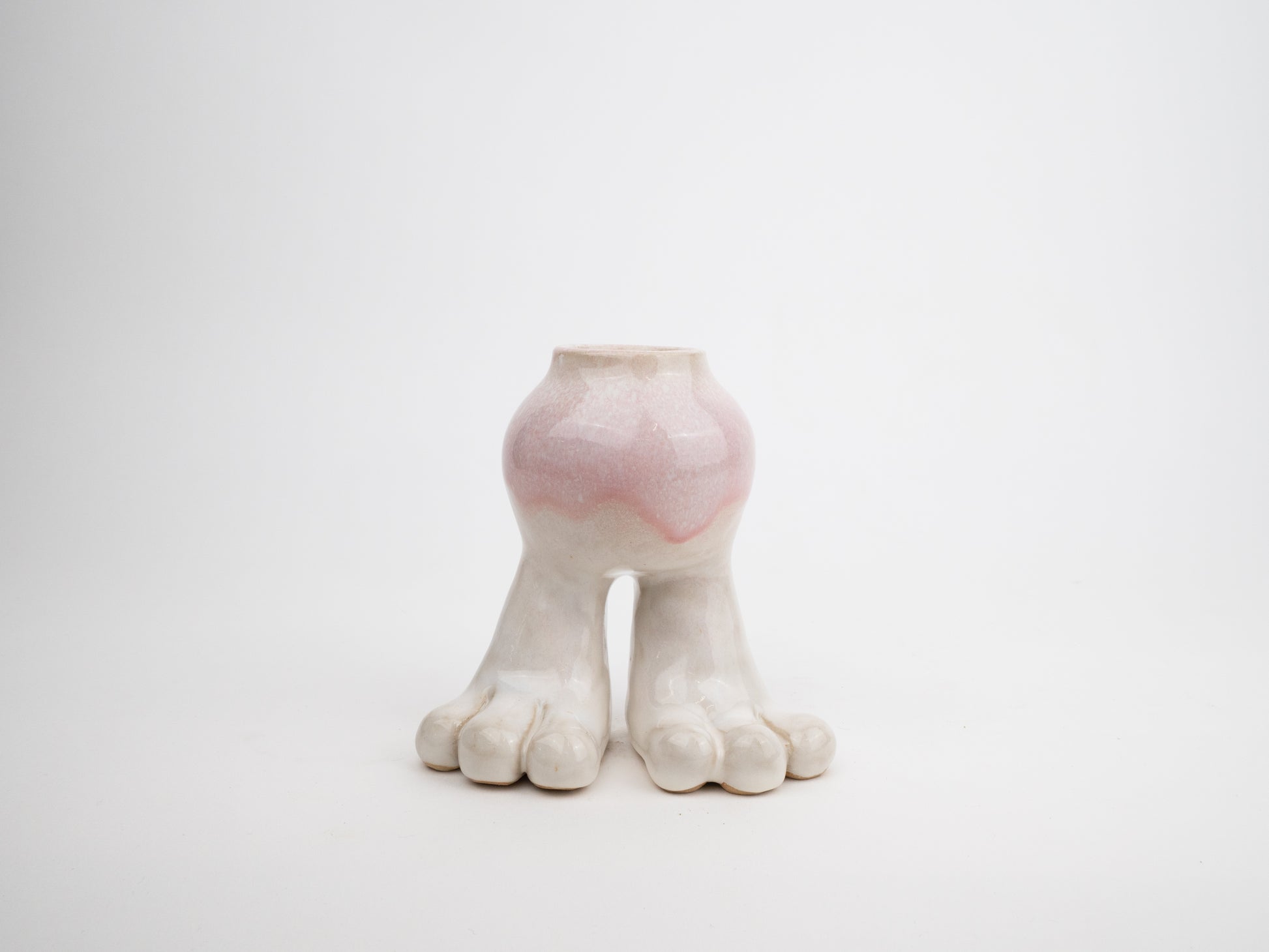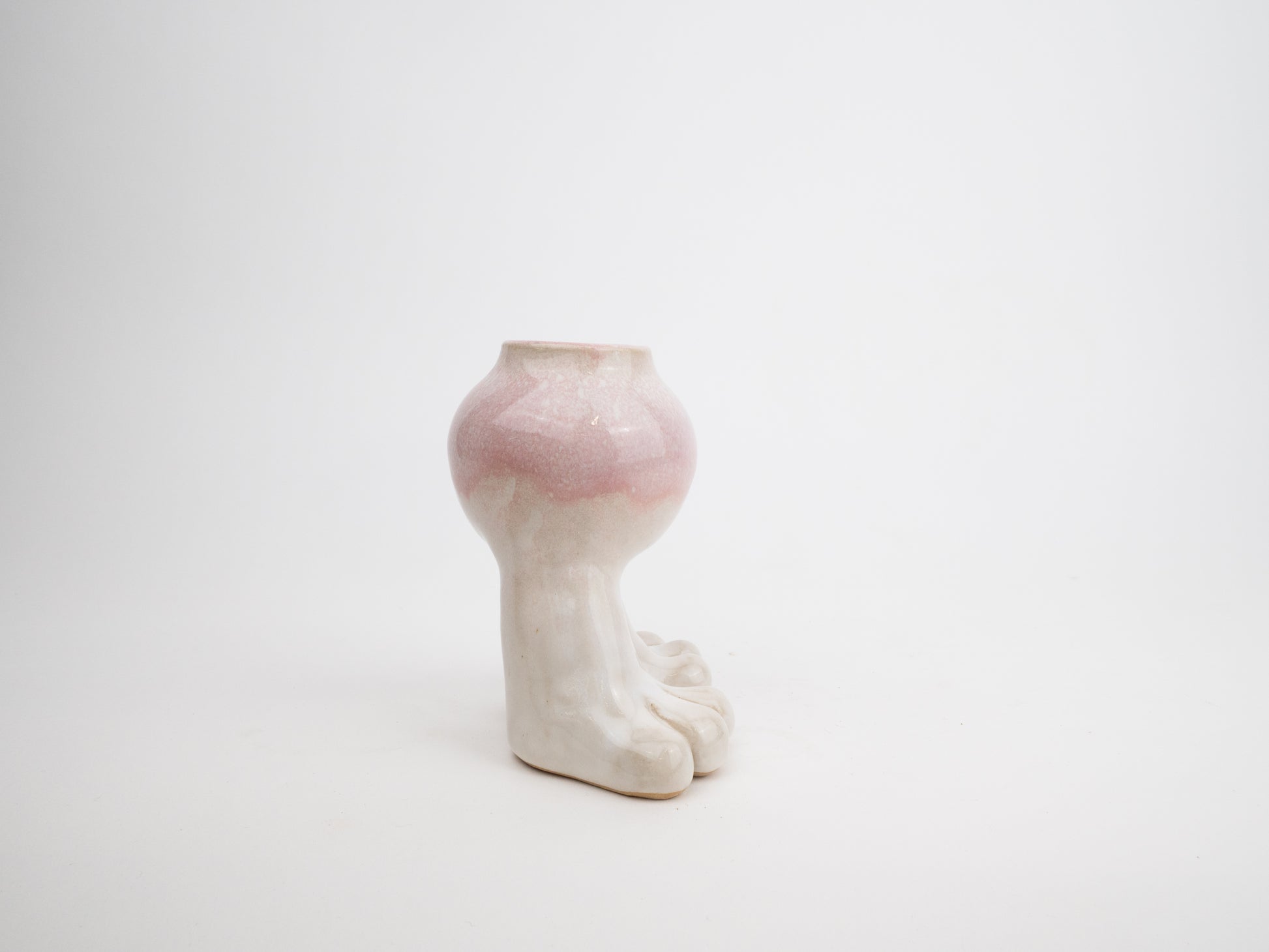 The Tootsie vase series has a thrown vase added to two hand-built legs and feet. The result is a playful and unique form. This Tootsie vase has been decorated in a subtle pink colour.